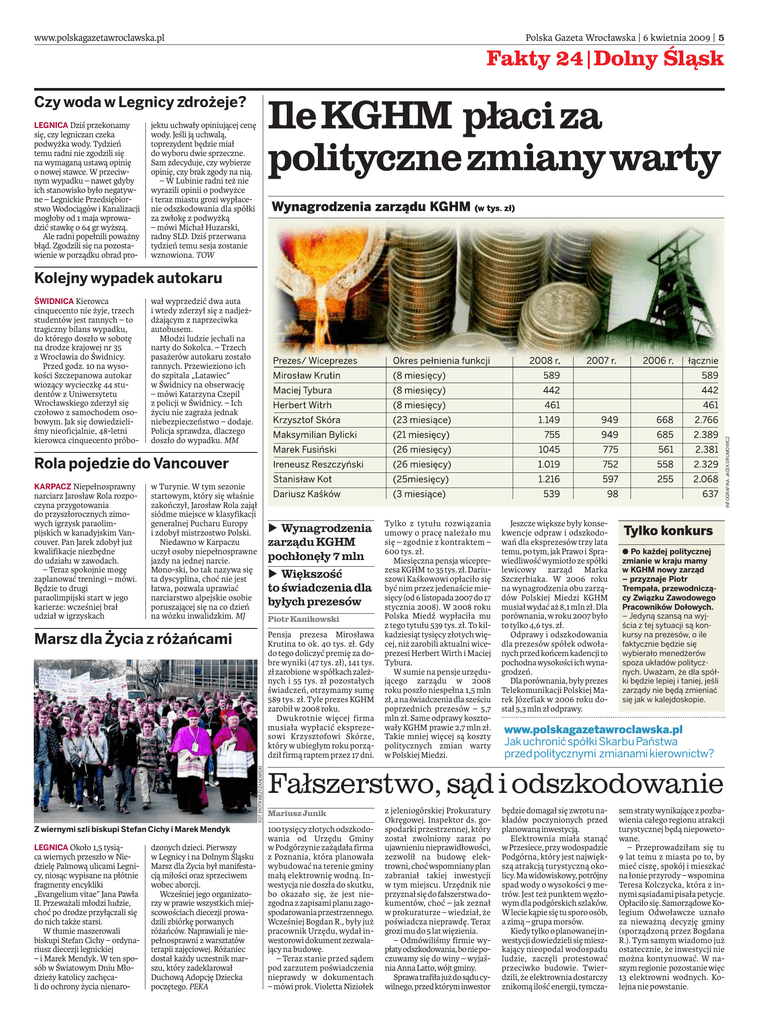 www.polskagazetawroclawska.pl Polska Gazeta Wrocławska | 6 kwietnia 2009 | 5 Fakty 24|Dolny Śląsk Czy woda w Legnicy zdrożeje? LEGNICA Dziś przekonamy się, czy legniczan czeka podwyżka wody. Tydzień temu radni nie zgodzili się na wymaganą ustawą opinię o nowej stawce. W przeciwnym wypadku – nawet gdyby ich stanowisko było negatywne – Legnickie Przedsiębiorstwo Wodociągów i Kanalizacji mogłoby od 1 maja wprowadzić stawkę o 64 gr wyższą. Ale radni popełnili poważny błąd. Zgodzili się na pozostawienie w porządku obrad pro- IleKGHM płaciza politycznezmianywarty jektu uchwały opiniującej cenę wody. Jeśli ją uchwalą, toprezydent będzie miał do wyboru dwie sprzeczne. Sam zdecyduje, czy wybierze opinię, czy brak zgody na nią. – W Lubinie radni też nie wyrazili opinii o podwyżce i teraz miastu grozi wypłacenie odszkodowania dla spółki za zwłokę z podwyżką – mówi Michał Huzarski, radny SLD. Dziś przerwana tydzień temu sesja zostanie wznowiona. TOW Kolejny wypadek autokaru cinquecento nie żyje, trzech studentów jest rannych – to tragiczny bilans wypadku, do którego doszło w sobotę na drodze krajowej nr 35 z Wrocławia do Świdnicy. Przed godz. 10 na wysokości Szczepanowa autokar wiozący wycieczkę 44 studentów z Uniwersytetu Wrocławskiego zderzył się czołowo z samochodem osobowym. Jak się dowiedzieliśmy nieoficjalnie, 48-letni kierowca cinquecento próbo- wał wyprzedzić dwa auta i wtedy zderzył się z nadjeżdżającym z naprzeciwka autobusem. Młodzi ludzie jechali na narty do Sokolca. – Trzech pasażerów autokaru zostało rannych. Przewieziono ich do szpitala „Latawiec” w Świdnicy na obserwację – mówi Katarzyna Czepil z policji w Świdnicy. – Ich życiu nie zagraża jednak niebezpieczeństwo – dodaje. Policja sprawdza, dlaczego doszło do wypadku. MM INFOGRAFIKA:JACEKDRUMOWICZ ŚWIDNICA Kierowca Rola pojedzie do Vancouver KARPACZ Niepełnosprawny narciarz Jarosław Rola rozpoczyna przygotowania do przyszłorocznych zimowych igrzysk paraolimpijskich w kanadyjskim Vancouver. Pan Jarek zdobył już kwalifikacje niezbędne do udziału w zawodach. – Teraz spokojnie mogę zaplanować treningi – mówi. Będzie to drugi paraolimpijski start w jego karierze: wcześniej brał udział w igrzyskach w Turynie. W tym sezonie startowym, który się właśnie zakończył, Jarosław Rola zajął siódme miejsce w klasyfikacji generalnej Pucharu Europy i zdobył mistrzostwo Polski. Niedawno w Karpaczu uczył osoby niepełnosprawne jazdy na jednej narcie. Mono-ski, bo tak nazywa się ta dyscyplina, choć nie jest łatwa, pozwala uprawiać narciarstwo alpejskie osobie poruszającej się na co dzień na wózku inwalidzkim. MJ b Wynagrodzenia zarządu KGHM pochłonęły 7 mln b Większość to świadczenia dla byłych prezesów Piotr Kanikowski Pensja prezesa Mirosława Krutina to ok. 40 tys. zł. Gdy do tego doliczyć premię za dobre wyniki (47 tys. zł), 141 tys. zł zarobione w spółkach zależnych i 55 tys. zł pozostałych świadczeń, otrzymamy sumę 589 tys. zł. Tyle prezes KGHM zarobił w 2008 roku. Dwukrotnie więcej firma musiała wypłacić eksprezesowi Krzysztofowi Skórze, który w ubiegłym roku porządził firmą raptem przez 17 dni. FOT.PIOTRKRZYŻANOWSKI Marsz dla Życia z różańcami Z wiernymi szli biskupi Stefan Cichy i Marek Mendyk LEGNICA Około 1,5 tysiąca wiernych przeszło w Niedzielę Palmową ulicami Legnicy, niosąc wypisane na płótnie fragmenty encykliki „Evangelium vitae” Jana Pawła II. Przeważali młodzi ludzie, choć po drodze przyłączali się do nich także starsi. W tłumie maszerowali biskupi Stefan Cichy – ordynariusz diecezji legnickiej – i Marek Mendyk. W ten sposób w Światowym Dniu Młodzieży katolicy zachęcali do ochrony życia nienaro- dzonych dzieci. Pierwszy w Legnicy i na Dolnym Śląsku Marsz dla Życia był manifestacją miłości oraz sprzeciwem wobec aborcji. Wcześniej jego organizatorzy w prawie wszystkich miejscowościach diecezji prowadzili zbiórkę porwanych różańców. Naprawiali je niepełnosprawni z warsztatów terapii zajęciowej. Różaniec dostał każdy uczestnik marszu, który zadeklarował Duchową Adopcję Dziecka poczętego. PEKA Tylko z tytułu rozwiązania umowy o pracę należało mu się – zgodnie z kontraktem – 600 tys. zł. Miesięczna pensja wiceprezesa KGHM to 35 tys. zł. Dariuszowi Kaśkowowi opłaciło się być nim przez jedenaście miesięcy (od 6 listopada 2007 do 17 stycznia 2008). W 2008 roku Polska Miedź wypłaciła mu z tego tytułu 539 tys. zł. To kilkadziesiąt tysięcy złotych więcej, niż zarobili aktualni wiceprezesi Herbert Wirth i Maciej Tybura. W sumie na pensje urzędującego zarządu w 2008 roku poszło niespełna 1,5 mln zł, a na świadczenia dla sześciu poprzednich prezesów – 5,7 mln zł. Same odprawy kosztowały KGHM prawie 2,7 mln zł. Takie mniej więcej są koszty politycznych zmian warty w Polskiej Miedzi. Jeszcze większe były konsekwencje odpraw i odszkodowań dla eksprezesów trzy lata temu, po tym, jak Prawo i Sprawiedliwość wymiotło ze spółki lewicowy zarząd Marka Szczerbiaka. W 2006 roku na wynagrodzenia obu zarządów Polskiej Miedzi KGHM musiał wydać aż 8,1 mln zł. Dla porównania, w roku 2007 było to tylko 4,6 tys. zł. Odprawy i odszkodowania dla prezesów spółek odwołanych przed końcem kadencji to pochodna wysokości ich wynagrodzeń. Dla porównania, były prezes Telekomunikacji Polskiej Marek Józefiak w 2006 roku dostał 5,3 mln zł odprawy. Tylko konkurs a Po każdej politycznej zmianie w kraju mamy w KGHM nowy zarząd – przyznaje Piotr Trempała, przewodniczący Związku Zawodowego Pracowników Dołowych. – Jedyną szansą na wyjścia z tej sytuacji są konkursy na prezesów, o ile faktycznie będzie się wybierało menedżerów spoza układów politycznych. Uważam, że dla spółki będzie lepiej i taniej, jeśli zarządy nie będą zmieniać się j