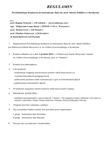 REGULAMIN Powiślańskiego Konkursu na Instrumenty Dęte im. prof. Marka Schillera w Kwidzynie Jury: prof. Bogdan Ocieszak ( AM Gdańsk ) - przewodniczący jury mgr Małgorzata Lange-Banaś ( ZPOSM I i II st. Warszawa ) prof. Roman Gryń ( AM Poznań ) prof. Zdzisław Stolarczyk (AM Kraków) dr Rafał Rachwał (AM Poznań) 1. Organizatorem Powiślańskiego Konkursu na Instrumenty Dęte im. prof. Marka Schillera jest Państwowa Szkoła Muzyczna I st. im. Feliksa Nowowiejskiego w Kwidzynie. 2. Konkurs odbędzie się w dniu 2 grudnia 2016 r. w Państwowej Szkole Muzycznej I stopnia im. Feliksa Nowowiejskiego w Kwidzynie, przy ul. Chopina 2. 3. Konkurs jest jednoetapowy 4. Cele konkursu: - konfrontacja osiągnięć artystycznych uczniów szkół muzycznych I st. - wymiana doświadczeń pedagogicznych - podnoszenie poziomu sztuki wykonawczej w grze na instrumentach dętych - popularyzacja instrumentów dętych 5. W konkursie mogą brać udział uczniowie szkół muzycznych I stopnia. 6. PROGRAM KONKURSU: - miniatura instrumentalna ( czas trwania do 7 minut ) . Nie mogą być formy cykliczne i ich części tj. koncert, concertino, sonata, forma sonatowa, wariacja, forma wariacyjna, suita itp. 7. Program musi być wykonany z pamięci 8. Grę uczestników będzie oceniać Jury powołane przez organizatora: I grupa - instrumenty dęte drewniane II grupa - instrumenty dęte blaszane 9. Decyzje Jury są ostateczne i nieodwołalne. 10. Każdy uczestnik otrzyma dyplom. 11. Dla laureatów organizatorzy przewidują nagrody rzeczowe. 12. Nagrodę Grand Prix za najwyższą punktację funduje Marszałek Województwa Pomorskiego 13. O przydziale nagród decyduje Jury. 14. Laureaci wytypowani przez jury są zobowiązani do wzięcia udziału w koncercie laureatów. 15. Zgłoszenia na karcie zgłoszenia uczestnika należy przesłać do 18.11.2016 r. wraz z dowodem wpłaty wyłącznie na adres e-mail : [email protected] 16. Wpisowe do konkursu wynosi 50 zł od uczestnika i przeznaczone jest na nagrody. 17. Wpisowe należy wpłacać na konto: RADA RODZICÓW Przy Państwowej Szkole Muzycznej I st. im. F. Nowowiejskiego w Kwidzynie, ul. Chopina 2 nr konta: 85 8300 0009 0006 5953 2000 0010 18. Wpisowe nie podlega zwrotowi. 19. W konkursie nie mogą uczestniczyć laureaci Grand Prix i I m-ca w następnej edycji konkursu. 20. Uczestnicy, których zgłoszenia zostaną przyjęte, będą poinformowani o dokładnym terminie występu. 21. Kolejność przesłuchań będzie ustalona przez Jury. 22. Przesłuchania konkursowe są otwarte dla publiczności 23. Koszty uczestnictwa pokrywane są we własnym zakresie przez uczestników. 24. Wysłanie zgłoszenia jest równoznaczne z akceptacją regulaminu KONKURSU. 25. Dodatkowe informacje można uzyskać w sekretariacie szkoły. tel (55) 279 25 93.