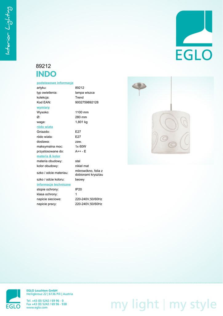 89212 INDO podstawowe informacje artyku: 89212 typ owietlenia: lampa wiszca kolekcja: Trend Kod EAN: 9002759892128 wymiary Wysoko: 1100 mm Ø: 280 mm waga: 1,801 kg ródo wiata Gniazdo: E27 ródo wiata: E27 dostawa: zaw. maksymalna moc: 1x 60W przystosowane do: A++ - E materia & kolor materia obudowy: stal kolor obudowy: nikiel mat szko / odcie materiau: mikrowókno, folia z dobionami krysztau szko / odcie koloru: beowy informacje techniczne stopie ochrony: IP20 klasa ochrony: 1 napicie sieciowe: 220-240V,50/60Hz napicie pracy: 220-240V,50/60Hz