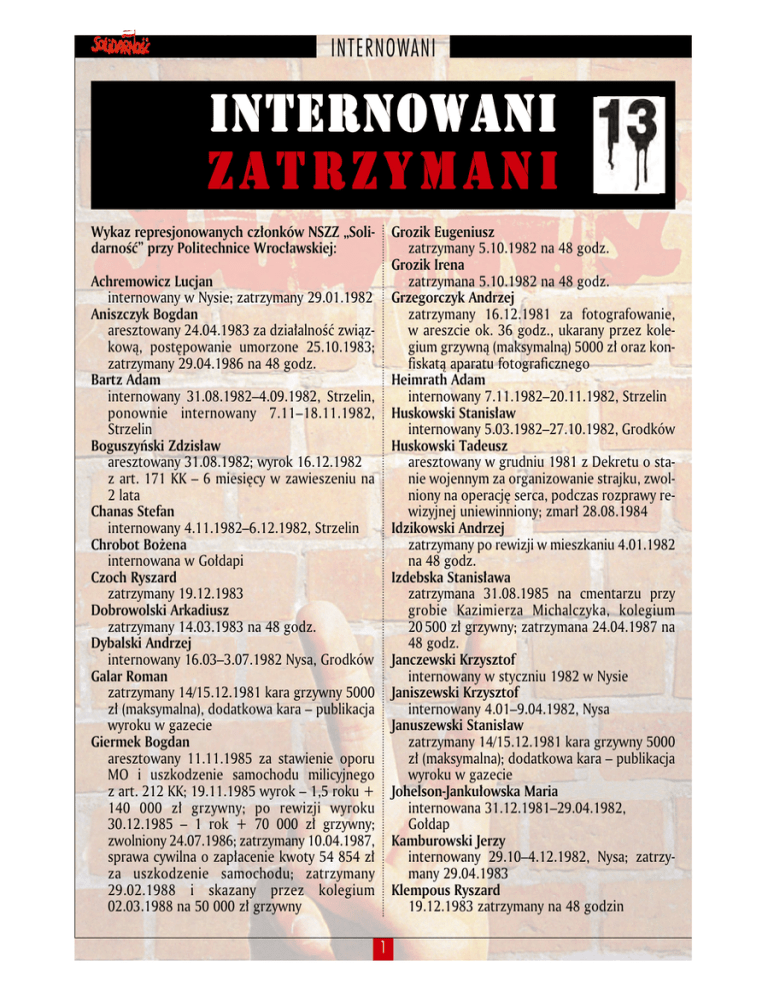 INTERNOWANI INTERNOWANI ZATRZYMANI Wykaz represjonowanych członków NSZZ „Solidarność” przy Politechnice Wrocławskiej: Grozik Eugeniusz zatrzymany 5.10.1982 na 48 godz. Grozik Irena zatrzymana 5.10.1982 na 48 godz. Grzegorczyk Andrzej zatrzymany 16.12.1981 za fotografowanie, w areszcie ok. 36 godz., ukarany przez kolegium grzywną (maksymalną) 5000 zł oraz konfiskatą aparatu fotograficznego Heimrath Adam internowany 7.11.1982–20.11.1982, Strzelin Huskowski Stanisław internowany 5.03.1982–27.10.1982, Grodków Huskowski Tadeusz aresztowany w grudniu 1981 z Dekretu o stanie wojennym za organizowanie strajku, zwolniony na operację serca, podczas rozprawy rewizyjnej uniewinniony; zmarł 28.08.1984 Idzikowski Andrzej zatrzymany po rewizji w mieszkaniu 4.01.1982 na 48 godz. Izdebska Stanisława zatrzymana 31.08.1985 na cmentarzu przy grobie Kazimierza Michalczyka, kolegium 20 500 zł grzywny; zatrzymana 24.04.1987 na 48 godz. Janczewski Krzysztof internowany w styczniu 1982 w Nysie Janiszewski Krzysztof internowany 4.01–9.04.1982, Nysa Januszewski Stanisław zatrzymany 14/15.12.1981 kara grzywny 5000 zł (maksymalna); dodatkowa kara – publikacja wyroku w gazecie Johelson-Jankułowska Maria internowana 31.12.1981–29.04.1982, Gołdap Kamburowski Jerzy internowany 29.10–4.12.1982, Nysa; zatrzymany 29.04.1983 Klempous Ryszard 19.12.1983 zatrzymany na 48 godzin Achremowicz Lucjan internowany w Nysie; zatrzymany 29.01.1982 Aniszczyk Bogdan aresztowany 24.04.1983 za działalność związkową, postępowanie umorzone 25.10.1983; zatrzymany 29.04.1986 na 48 godz. Bartz Adam internowany 31.08.1982–4.09.1982, Strzelin, ponownie internowany 7.11–18.11.1982, Strzelin Boguszyński Zdzisław aresztowany 31.08.1982; wyrok 16.12.1982 z art. 171 KK – 6 miesięcy w zawieszeniu na 2 lata Chanas Stefan internowany 4.11.1982–6.12.1982, Strzelin Chrobot Bożena internowana w Gołdapi Czoch Ryszard zatrzymany 19.12.1983 Dobrowolski Arkadiusz zatrzymany 14.03.1983 na 48 godz. Dybalski Andrzej internowany 16.03–3.07.1982 Nysa, Grodków Galar Roman zatrzymany 14/15.12.1981 kara grzywny 5000 zł (maksymalna), dodatkowa kara – publikacja wyroku w gazecie Giermek Bogdan aresztowany 11.11.1985 za stawienie oporu MO i uszkodzenie samochodu milicyjnego z art. 212 KK; 19.11.1985 wyrok – 1,5 roku + 140 000 zł grzywny; po rewizji wyroku 30.12.1985 – 1 rok + 70 000 zł grzywny; zwolniony 24.07.1986; zatrzymany 10.04.1987, sprawa cywilna o zapłacenie kwoty 54 854 zł za uszkodzenie samochodu; zatrzymany 29.02.1988 i skazany przez kolegium 02.03.1988 na 50 000 zł grzywny 1 INTERNOWANI Kopias Marek aresztowany 31.08.1982; wyrok 16.12.1982 z art. 171 KK – 6 miesięcy w zawieszeniu na 2 lata Kowalik Stanisław zatrzymany 24.04.1987 na 48 godz. Kowalski Jacek zatrzymany 14/15.12.1981 kara grzywny 5000 zł (maksymalna), dodatkowa kara – publikacja wyroku w gazecie Koziebrodzka Maria internowana 13.06.1982, Gołdap; zatrzymana 24.04.1987 na 48 godz. Kozioł Marian aresztowany 31.08.1982; wyrok 16.12.1982 z art. 171 KK – 6 miesięcy w zawieszeniu na 2 lata Kusz Małgorzata zatrzymana 11.10.1982 na 48 godz. z art. 46 Dekretu o stanie wojennym, wyrok 21.02.1983 – 1,5 roku w zawieszeniu na 3 lata Laska Wiesław zatrzymany po rewizji w mieszkaniu 24.04.1987 na 48 godz. Lasota Józef zatrzymany po rewizji w mieszkaniu 24.04.1987 na 24 godz. Lewkowicz Teresa zatrzymana 28.02.1984 na 48 godz. Ławniczak Jakub internowany 28.10–18.11.1982, Nysa, Strzelin Łopuszańska Halina przesłuchiwana 14.11.1984; zatrzymana 24.04.1987 Łukowska-Karniej Hanna wyrok 27.05.1983 – uniewinnienie; aresztowana 6.04.1984 z art. 278, 273, 270, 281, 280, 282a i 55 KK, zwolniona 25.07.1984 na mocy amnestii; ponownie aresztowana 9.11.1987, sankcja prokuratorska – 3 miesięcy; 9.02.1988 kolegium – 2 miesiące aresztu za posługiwanie się fałszywym dokumentem tożsamości w czasie ukrywania się, zwolniona 9.04.1988 Matuszewski Józef zatrzymany 5.01.1982 na 11 godz. Mąka Julian internowany 20.05.1982 Głogów Mieszkalski Mariusz aresztowany 4.07.1985 z art. 282a KK i art. 45 prawa prasowego, areszt uchylono 3.12.1985, wyrok 27.01.1986 – 1 rok w zawieszeniu na 3 lata; zatrzymywany: 24.04.1987 i 1.05.1987; kolegium 7.05.1988 – 50 000 zł grzywny za napaść na funkcjonariusza MO w związku ze strajkiem majowym Morawiecki Kornel od 13.12.1981 ukrywał się, 9.11.1987 aresztowany, podstępnie wydalony za granicę 30.04.1988, ok. 20.08.1988 nielegalny powrót do kraju Muszyńska Donata liczne przesłuchania i próby przesłuchań, rewizje (m.in. 6.04.1987 całodzienna rewizja w pokoju o pow. 11 m2), objęta działalnością operacyjną MSW i kontrwywiadu wojskowego (inwigilacja, podsłuchy, zastraszenia) Muszyński Marek 29.10.1986 zatrzymany i próba przesłuchania; 6.04.1987 zatrzymanie na 48 godz., rewizja, kolegium – 50 000 zł i przepadek komputera; 1.05.1987 zatrzymany na 24 godz. i kolegium – 50 000 zł; 29.05.1987 zatrzymany na 48 godz.; 8.02.1988 zatrzymany, rewizja oraz kolegium – 50 000 zł za udział w demonstracji Myślecki Wojciech internowany 18.12.1981–14.08.1982; aresztowany 28.02.1984 z art. 278 i 282a KK, zwolniony 26.07.1984 na mocy amnestii; wielokrotnie zatrzymywany na 48 godz. Nalichowski Jerzy internowany 17.12.1981-22.07.1982 Kamienna Góra, Głogów Nowakowski Marek internowany Nysa (informacja z 29.10.1982); zatrzymany 29.03.1983 na 48 godz. Ogorzałek Andrzej internowany 11.11.1982 Strzelin Olszewski Andrzej zatrzymany i internowany 4.01–06.02.1982; aresztowany 06.02.1982: wyrok 27.03.1982 – 1,5 roku w zawieszeniu na 2 lata; po rewizji wyroku 28.04.1983 przed Sądem Wojskowym w Opolu – uniewinnienie, po rewizji w SN 14.05.1984 – sprawa skierowana do ponownego rozpatrzenia, umorzona na mocy amnestii z 1984 Orłowski Tadeusz internowany 27.03–11.06.1982 Grodków, wyjechał do Kanady w 1985 Pawelski Roman internowany 18.12.1981–15.01.1982 Wrocław, ul. Kleczkowska P