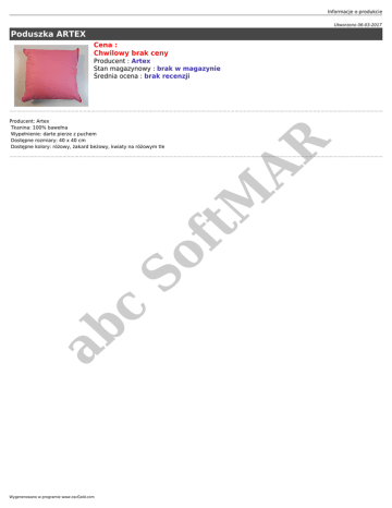 Informacje o produkcie Utworzono 06-03-2017 Poduszka ARTEX Cena : Chwilowy brak ceny Producent : Artex Stan magazynowy : brak w magazynie Średnia ocena : brak recenzji ab c So ft M AR Producent: Artex Tkanina: 100% bawełna Wypełnienie: darte pierze z puchem Dostępne rozmiary: 40 x 40 cm Dostępne kolory: różowy, żakard beżowy, kwiaty na różowym tle Wygenerowano w programie www.oscGold.com