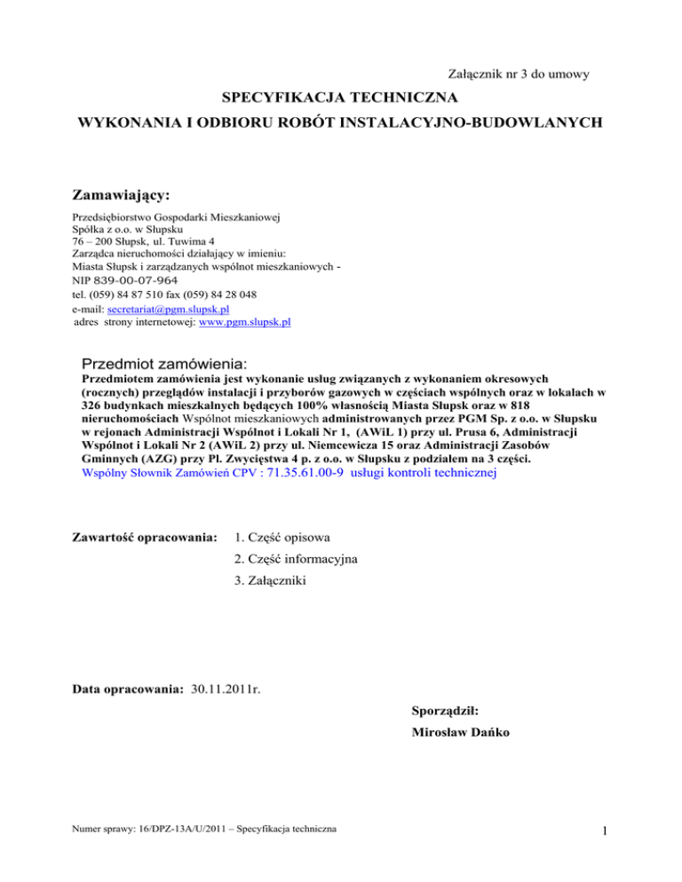 Załącznik nr 3 do umowy SPECYFIKACJA TECHNICZNA WYKONANIA I ODBIORU ROBÓT INSTALACYJNO-BUDOWLANYCH Zamawiający: Przedsiębiorstwo Gospodarki Mieszkaniowej Spółka z o.o. w Słupsku 76 – 200 Słupsk, ul. Tuwima 4 Zarządca nieruchomości działający w imieniu: Miasta Słupsk i zarządzanych wspólnot mieszkaniowych NIP 839-00-07-964 tel. (059) 84 87 510 fax (059) 84 28 048 e-mail: [email protected] adres strony internetowej: www.pgm.slupsk.pl Przedmiot zamówienia: Przedmiotem zamówienia jest wykonanie usług związanych z wykonaniem okresowych (rocznych) przeglądów instalacji i przyborów gazowych w częściach wspólnych oraz w lokalach w 326 budynkach mieszkalnych będących 100% własnością Miasta Słupsk oraz w 818 nieruchomościach Wspólnot mieszkaniowych administrowanych przez PGM Sp. z o.o. w Słupsku w rejonach Administracji Wspólnot i Lokali Nr 1, (AWiL 1) przy ul. Prusa 6, Administracji Wspólnot i Lokali Nr 2 (AWiL 2) przy ul. Niemcewicza 15 oraz Administracji Zasobów Gminnych (AZG) przy Pl. Zwycięstwa 4 p. z o.o. w Słupsku z podziałem na 3 części. Wspólny Słownik Zamówień CPV : 71.35.61.00-9 usługi kontroli technicznej Zawartość opracowania: 1. Część opisowa 2. Część informacyjna 3. Załączniki Data opracowania: 30.11.2011r. Sporządził: Mirosław Dańko Numer sprawy: 16/DPZ-13A/U/2011 – Specyfikacja techniczna 1 1. Część opisowa. 1.1. Przedmiot i zakres przedmiotu zamówienia. Przedmiotem zamówienia jest wykonanie usług związanych z wykonaniem okresowych (rocznych) przeglądów instalacji i przyborów gazowych w częściach wspólnych oraz w lokalach w 326 budynkach mieszkalnych będących 100% własnością Miasta Słupsk administrowanych przez PGM Sp. z o.o. w Słupsku – Rejon Administracji Zasobów Gminnych przy Pl. Zwycięstwa 4 1.2. Definicje - instalacja gazowa - układ przewodów gazowych w budynku, wraz z armaturą, wyposaŜeniem i urządzeniami gazowymi, rozpoczynający się na kurku głównym i zakończonych urządzeniami gazowymi (brzmienie definicji z normy PN-M-34507; definicja instalacji gazowej podana w rozporządzeniu w sprawie warunków technicznych dla budynków nieco się róŜni - na przykład do instalacji gazowej wlicza się dodatkowo przewody odprowadzające spaliny z urządzeń gazowych; proszę się z tym zapoznać), - urządzenie gazowe - urządzenie spalające paliwo gazowe, - armatura odcinająca - urządzenie, które jest przeznaczone do zamykania przepływu paliwa gazowego w przewodzie gazowym, - kurek główny - armatura odcinająca przeznaczona do odcinania dopływu paliwa gazowego do instalacji gazowej(dodam od siebie, Ŝe waŜne jest teŜ to, Ŝe kurek główny stanowi granicę własności pomiędzy dostawcą gazu i odbiorcą; dodam równieŜ, Ŝe w zaleŜności od ciśnienia gazu i tzw. mocy umownej, ten kurek główny moŜe być usytuowany w róŜnych miejscach - czasem przed, a czasem za reduktorem) - gazomierz - przyrząd słuŜący do pomiaru objętości paliwa gazowego albo ilości zawartej w nim energii, - złącze izolujące - element przeznaczony do eklektycznego izolowania połączonych ze sobą odcinków przewodów gazowych, - osoba kompetentna - osoba, która została przeszkolona, mająca doświadczenie i odpowiednie uprawnienia do przeprowadzania czynności związanych z przewodami gazowymi, urządzeniami gazowymi i złączem izolującym (tak jak poprzednio, to teŜ jest definicja z PN-M-34507; nie wiem dlaczego taka śmieszna; w mojej opinii powinno się napisać, Ŝe jest to osoba, która posiada odpowiednie uprawnienia do zajmowania się dozorem nad eksploatacją sieci, urządzeń i instalacji gazowych; w normie znajdziemy jeszcze taką uwagę: "UWAGA - Sposób uzyskiwania uprawnień jest określony w odrębnych przepisach". No więc dodam od siebie, Ŝe te odrębne przepisy, to ustawa Prawo energetyczne oraz rozporządzenie wykonawcze do tej ustawy, a uprawnienia, o których mowa, to tzw. świadectwo kwalifikacyjne "D" nr .... uprawniające do zajmowania się eksploatacją urządzeń, instalacji i sieci grupy 3 na stanowisku dozoru. W grupie 3 mamy 10 pozycji, z których taka osoba kompetentna powinna mieć w świadectwie przynajmniej dwie, tj. 6 - "Urządzenia i instalacje gazowe o ciśnieniu nie wyŜszym, niŜ 5 kPa" oraz 10 - "Aparatura kontrolno-pomiarowa, urządzenia sterowania do sieci, urządzeń i instalacji wymienionych w punkcie 6", - dolna granica wybuchowości (DGW) - najniŜsze stęŜenie paliwa gazowego w powietrzu, powyŜej którego mieszanka palna pod wpływem czynnika inicjującego zapłon ulega spalaniu wybuchowemu (nadmienię, Ŝe dla gazu ziemnego DGW wynosi około 5 %), - górna granica wybuchowości (GGW) - najwyŜsze stęŜenie paliwa gazowego w powietrzu, poniŜej którego mieszanka palna pod wpływem czynnika inicjującego zapłon ulega spaleniu wybuchowemu Numer sprawy: 16/DPZ-13A/U/2011 – Specyfikacja techniczna 2 (tej definicji nie znajdziecie we wspomnianej wcześniej normie, więc dorzucam ją od siebie w promocji, oczywiście gratis; wspomnę, Ŝe dla gazu ziemnego GGW wynosi około 15 %) 1.3. Wytyczne dotyczące wykonania i organizacji robót: 1) Przegląd oraz kontrolę szczelności instalacji i urządzeń gazowych naleŜy prowadzić zgodnie z obowiązującymi przepisami, normami, warunkami technicznymi pod stałym nadzorem technicznym z zachowaniem obowiązujących przepisów BHP i ppoŜ. 2) O kontroli i jej terminie naleŜy powiadomić mieszkańców kontrolowanych budynków z odpowiednim wyprzedzeniem 3) Przed przystąpieniem do kontroli naleŜy zapoznać się z dokumentami i zaleceniami sporządzonymi w wyniku poprzedniej kontroli oraz informacjami zawartymi w dokumentacji techniczno-eksploatacyjnej instalacji gazowej jeśli tak jest w posiadaniu Zamawiającego, 4) W przypadku przebiegu instalacji gazowej w bruzdach ściennych zakrytych tynkiem naleŜy zaŜądać od właściciela lub zarządcy budynku schematu rozmieszczenia przewodów gazow