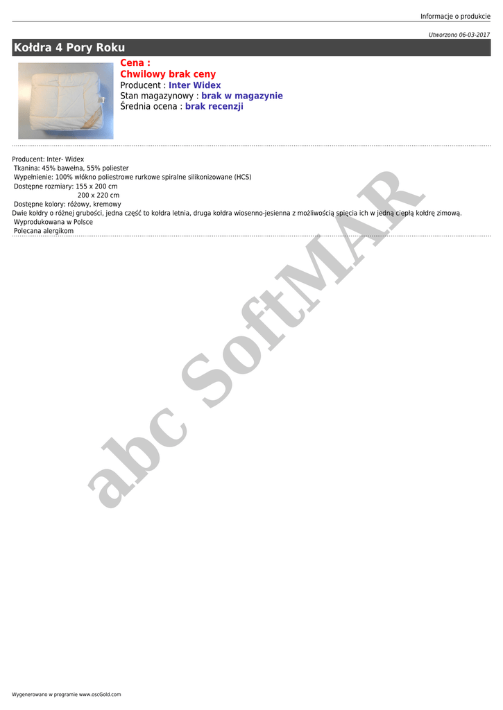 Informacje o produkcie Utworzono 06-03-2017 Kołdra 4 Pory Roku Cena : Chwilowy brak ceny Producent : Inter Widex Stan magazynowy : brak w magazynie Średnia ocena : brak recenzji ab c So ft M AR Producent: Inter- Widex Tkanina: 45% bawełna, 55% poliester Wypełnienie: 100% włókno poliestrowe rurkowe spiralne silikonizowane (HCS) Dostępne rozmiary: 155 x 200 cm 200 x 220 cm Dostępne kolory: różowy, kremowy Dwie kołdry o różnej grubości, jedna część to kołdra letnia, druga kołdra wiosenno-jesienna z możliwością spięcia ich w jedną ciepłą kołdrę zimową. Wyprodukowana w Polsce Polecana alergikom Wygenerowano w programie www.oscGold.com