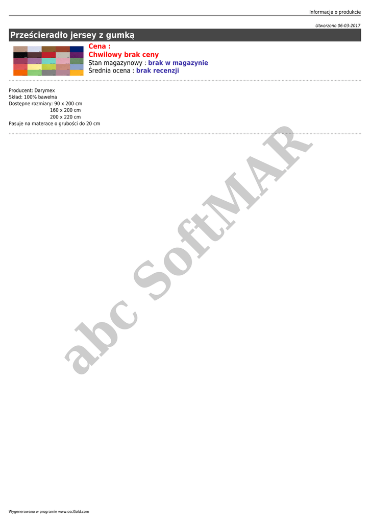 Informacje o produkcie Utworzono 06-03-2017 Prześcieradło jersey z gumką Cena : Chwilowy brak ceny Stan magazynowy : brak w magazynie Średnia ocena : brak recenzji ab c So ft M AR Producent: Darymex Skład: 100% bawełna Dostępne rozmiary: 90 x 200 cm 160 x 200 cm 200 x 220 cm Pasuje na materace o grubości do 20 cm Wygenerowano w programie www.oscGold.com