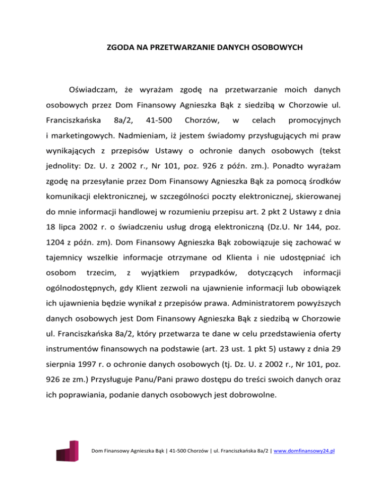 ZGODA NA PRZETWARZANIE DANYCH OSOBOWYCH Oświadczam, że wyrażam zgodę na przetwarzanie moich danych osobowych przez Dom Finansowy Agnieszka Bąk z siedzibą w Chorzowie ul. Franciszkańska 8a/2, 41-500 Chorzów, w celach promocyjnych i marketingowych. Nadmieniam, iż jestem świadomy przysługujących mi praw wynikających z przepisów Ustawy o ochronie danych osobowych (tekst jednolity: Dz. U. z 2002 r., Nr 101, poz. 926 z późn. zm.). Ponadto wyrażam zgodę na przesyłanie przez Dom Finansowy Agnieszka Bąk za pomocą środków komunikacji elektronicznej, w szczególności poczty elektronicznej, skierowanej do mnie informacji handlowej w rozumieniu przepisu art. 2 pkt 2 Ustawy z dnia 18 lipca 2002 r. o świadczeniu usług drogą elektroniczną (Dz.U. Nr 144, poz. 1204 z późn. zm). Dom Finansowy Agnieszka Bąk zobowiązuje się zachować w tajemnicy wszelkie informacje otrzymane od Klienta i nie udostępniać ich osobom trzecim, z wyjątkiem przypadków, dotyczących informacji ogólnodostępnych, gdy Klient zezwoli na ujawnienie informacji lub obowiązek ich ujawnienia będzie wynikał z przepisów prawa. Administratorem powyższych danych osobowych jest Dom Finansowy Agnieszka Bąk z siedzibą w Chorzowie ul. Franciszkańska 8a/2, który przetwarza te dane w celu przedstawienia oferty instrumentów finansowych na podstawie (art. 23 ust. 1 pkt 5) ustawy z dnia 29 sierpnia 1997 r. o ochronie danych osobowych (tj. Dz. U. z 2002 r., Nr 101, poz. 926 ze zm.) Przysługuje Panu/Pani prawo dostępu do treści swoich danych oraz ich poprawiania, podanie danych osobowych jest dobrowolne. Dom Finansowy Agnieszka Bąk | 41-500 Chorzów | ul. Franciszkańska 8a/2 | www.domfinansowy24.pl