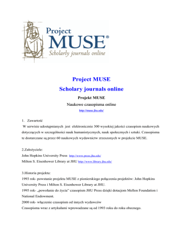 Project MUSE Scholary journals online Projekt MUSE Naukowe czasopisma online http://muse.jhu.edu/ 1. Zawartość W serwisie udostępnianych jest elektronicznie 300 wysokiej jakości czasopism naukowych dotyczących w szczególności nauk humanistycznych, nauk społecznych i sztuki. Czasopisma te dostarczane są przez 60 naukowych wydawnictw zrzeszonych w projekcie MUSE. 2.Założyciele: John Hopkins University Press http://www.press.jhu.edu/ Milton S. Eisenhower Library at JHU http://www.library.jhu.edu/ 3.Historia projektu: 1993 rok- powstanie projektu MUSE z pionierskiego połączenia projektów: John Hopkins University Press i Milton S. Eisenhower Library at JHU. 1995 rok- „powołanie do życia” czasopism JHU Press dzięki dotacjom Mellon Foundation i National Endowment. 2000 rok- włączenie czasopism od innych wydawców Czasopisma wraz z artykułami wprowadzane są od 1993 roku do roku obecnego. 4. Kolekcje: W serwisie znajduje się pięć głównych kolekcji: Standard Collection 282 czasopisma + voluminy za inne roczniki Basic Research Collection 193 czasopisma + voluminy za inne roczniki Basic Undergraduate Collection 112 czasopism + voluminy za inne roczniki Arts and Humanities Collection 205 czasopism + voluminy za inne roczniki Social Sciences Collection 163 czasopisma + voluminy za inne roczniki W obrębie tych kolekcji znajdują się czasopisma na określony temat, do których dostęp jest na ogół pełny ale bywa, że ograniczony. 5. Interfejs jest w języku angielskim. W serwisie możliwe są dwie opcje wyszukiwania: podstawowa i zaawansowana. Przy wyszukiwaniu podstawowym używa się indeksów za pomocą których możemy dotrzeć do konkretnego artykułu. Może to być wyszukiwanie we wszystkich indeksach lub słowo w tekście, autor, hasło przedmiotowe, tytuł artykułu, tytuł czasopisma. Można również wybrać odpowiedni sposób sortowania wyników wyszukiwania oraz ile tych wyników chcemy mieć wyświetlonych na stronie. W wyszukiwaniu zaawansowanym oprócz indeksów są operatory boolowskie oraz można wybrać rodzaj lub inaczej temat artykułów np. Poetry, Drama, Fiction lub wszystkie dokumenty. Jest także opcja umożliwiająca wybór czasopism w jakich chcemy wyszukać artykuły. W serwisie można przeglądać czasopisma i zawarte w nich artykuły według tytułów czasopism ułożonych na liście alfabetycznie, według tematu (przedmiotu) jakim zajmuje się dane czasopismo oraz według pięciu głównych kolekcji. 7. Format zasobów: Artukuły udostępniane są w formacje HTML lub PDF. Artykuł w formacie PDF Źródło: http://muse.jhu.edu/demo/dance_research/ Artykuł w formacie HTML Źródło: http://muse.jhu.edu/demo/dance_research/ 10. Wykorzystane źródła: • Project MUSE http://muse.jhu.edu/ [2007-06-10] • John Hopkins University Press http://www.press.jhu.edu/ [2007-06-10] • Milton S. Eisenhower Library at JHU http://www.library.jhu.edu/ [2007-06-10] Autor: Marzena Prokop Kraków: 2007-06-11 Zgadzam się na publikacje mego teksu w sieci Internet.