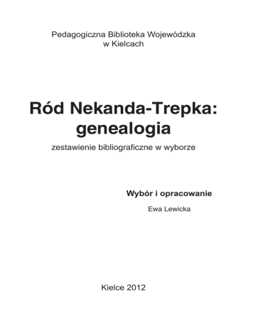 Pedagogiczna Biblioteka Wojewódzka w Kielcach Ród Nekanda-Trepka: genealogia zestawienie bibliograficzne w wyborze Wybór i opracowanie Ewa Lewicka Kielce 2012 Korekta Bożena Lewandowska Redakcja techniczna opracowanie graficzne i skład komputerowy Robert Kardas Wydawca: Pedagogiczna Biblioteka Wojewódzka w Kielcach, ul. Jana Pawła II 5, 25-025 Kielce e-mail: [email protected] www.pbw.kielce.pl Książki 1. Jankowiak, Hanna (1970- ) : Dzieje polskiego rodu szlacheckiego Nekanda-Trepków herbu Topór / Hanna Jankowiak ; [oprac. graf. Piotr Jarecki]. – [Bydgoszcz] : Agencja Reklamowa Grapfit, cop. 2004. – 112 s. : il. – Bibliogr. Czytelnia Historyczna Uniwersytetu Jana Kochanowskiego w Kielcach 2. Małachowski, Piotr Nałęcz (ca 1730-1799) : Zbiór nazwisk szlachty z opisem herbów własnych familiom zostającym w Królestwie Polskim, i Wielkim Xięstwie Litewskim / przez Piotra Nałęcza Małachowskiego ułożony, poprawiony, pomnożony i powtórnie do druku podany. – Lublin : Drukarnia J.C.K. Mci u XX Trynitarzów, 1805. – S. 310 : Nekanda herbu Topor ; S. 785 : Topor Herb Sygn. 181357 S Czytelnia Pedagogicznej Biblioteki Wojewódzkiej w Kielcach [Dostępne także w wersji elektronicznej: http://ebuw.uw.edu.pl/dlibra/ doccontent?id=381&from=FBC] 3. Niesiecki, Kasper (1682-1744) : Herbarz polski Kaspra Niesieckiego S. J. : powiększony dodatkami z późniejszych autorów, rękopismów, dowodów urzędowych i wydany przez Jana Nep. Bobrowicza. T. 9. – Lipsk : Nakł. i dr. Breitkopfa i Hertela, 1842. – S. 115-116 : Trepka herbu Topor Sygn. 148918 S Czytelnia Pedagogicznej Biblioteki Wojewódzkiej w Kielcach [Dostępne także w wersji elektronicznej: http://ebuw.uw.edu.pl/dlibra/ doccontent?id=166&from=FBC] 4 4. Nowaczyk, Małgorzata : Poszukiwanie przodków : genealogia dla każdego / Małgorzata Nowaczyk. – Warszawa : Państwowy Instytut Wydawniczy, cop. 2005. – 431, [1] s. : faks., fot., mapy, portr. – Bibliogr Czytelnia Główna Uniwersytetu Jana Kochanowskiego 5. Paprocki, Bartosz : Herby rycerstwa polskiego / przez Bartosza Paprockiego zebrane i wydane r. p. 1584 ; wyd. Kazimierza Józefa Turowskiego. – Kraków : Wydawnictwo Biblioteki Polskiej, 1858. – S. 101 : „Dom Nekandów, który Trepkami herbu Topór zwani...”; S. 106 ; S. 126 Sygn. 161724 S Czytelnia Pedagogicznej Biblioteki Wojewódzkiej w Kielcach [Dostępne także w wersji elektronicznej: http://www.wbc.poznan.pl/dlibra/doccontent?id=48455&from=FBC] 6. Prinke, Rafał Tadeusz : Poradnik genealoga amatora / Rafał T. Prinke. – Warszawa : „Polonia”, 1992. – 211 s. – Bibliogr. Sygn. 215290 Czytelnia Pedagogicznej Biblioteki Wojewódzkiej w Kielcach Sygn. 220259 Wypożyczalnia Pedagogicznej Biblioteki Wojewódzkiej w Kielcach 7. Święcki, Tomasz : Historyczne pamiątki znamienitych rodzin i osób dawnej Polski / przejrzał w rękopisie, objaśnił i uzupełnił przypisami Juljan Bartoszewicz. T. 2. – Warszawa : Nakładem S. H. Merzbacha Księgarza, 1859. – S. 223 : Trepka Grzegorz, herbu Topór przydomku Nekanda Sygn. 164582 S Czytelnia Pedagogicznej Biblioteki Wojewódzkiej w Kielcach 8. Trepka, Andrzej : Wspominki z Rychłocic / Andrzej Trepka. – Katowice : „Śląsk”, 2002. – 161 s., [1], tabl. 22, il. [Wspomnienia autora ur. w 1923 r., z życia rodziny ziemiańskiej w okresie międzywojennym do przymusowego wysiedlenia z rodzinnego majątku w 1940 r.] 9. Trepka, Walerian Nekanda : Liber generationis Plebeanorum („Liber Chamorum”). Cz. 1, Wstępy wydawców i tekst / pod redakcją Włodzimierza Dworzaczka. – Wrocław ; Warszawa ; Kraków : Zakład Narodowy im. Ossolińskich, 1963. – S. VII-VIII, X-XXVI, XLVIII : [Historia rodu Trepków] ; S. 570 : „Trepkami zwali się Samuel i Jan...” Sygn. 33354 S Czytelnia Pedagogicznej Biblioteki Wojewódzkiej w Kielcach Artykuły w czasopismach 10. Burakowski, Adam : Geografia „Liber chamorum” / Adam Burakowski // „Przegląd Historyczny”. – 1999, z. 1, s. 75-83 [Trepka, Walerian Nekanda] 11. Kalwat, Wojciech : Z plebejusza szlachcic / Wojciech Kalwat // „Mówią Wieki”. – 2006, nr 11, dod. „Mówią Wieki w Szkole”, nr 7, s. 2-3 [Trepka, Walerian Nekanda (ca 1584-1640)] 12. Kowalczyk, Maria : Przenikanie przedstawicieli warstw niższych do stanu szlacheckiego w 1. połowie XVII w. (Na podstawie „Liber Chamorum” Waleriana Nekandy Trepki) / Maria Kowalczyk // „Roczniki Humanistyczne”. – T. 36 (1988), z. 2, s. 71-101 13. Potoniec, Patrycja : „Liber generationis plebeanorum” Waleriana Nekandy Trepki w kontekście piśmiennictwa XVI-XVII wieku : (zarys problematyki) / Patrycja Potoniec // „Acta Universitatis Nicolai Copernici. Filologia Polska”. – Z. 60 (2004), s. 3-28 [Trepka, Walerian Nekanda. – Liber generationis plebeanorum] 14. Pruszyńska, Agnieszka : Skalpel i ekslibris : wystawa: Kazimierz Nekanda-Trepka (1918-1988) życie i twórczość / Agnieszka Pruszyńska // „Biuletyn Głównej Biblioteki Lekarskiej”. – Nr 360, (1999), s. 145-146 [Wystawa w Głównej Bibliotece Lekarskiej w Warszawie] 6 15. Zmarł nestor polskich spawalników // „Biuletyn Instytutu Spawalnictwa w Gliwicach”. – 2003, nr 6, s. 28 [Nekanda-Trepka, Leszek – nekrolog] 16. Żyżka, Danuta : Profesor Edmund Nekanda Trepka (1880-1964) / Danuta Żyżka // „Zeszyty Historyczne Politechniki Łódzkiej”. – Z. 5 (2007), s. 7-12 Dokumenty elektroniczne 17. Genealogia polska [Dokument elektroniczny] [online]. – Tryb dostępu: http://www.genealogiapolska.pl/ [Dostęp: 23 listopada 2011] 18. Geograficzny podział nazwisk „Nekanda-Trepka” w Polsce [Dokument elektroniczny]. – Tryb dostępu: http://www.moikrewni.pl/mapa/kompletny/nekanda-trepka.html [Dostęp: 23 listopada 2011] 19. Jan Nekanda-Trepka h. Topór [Dokument elektroniczny]. – Tryb dostępu: http://www.sejm-wielki.pl/b/sw.153868 [Dostęp: 23 listopada 2011] 20. Joanna Nekanda-Trepka (urodzona z „grubsza” w roku 1730) [Dokument elektr