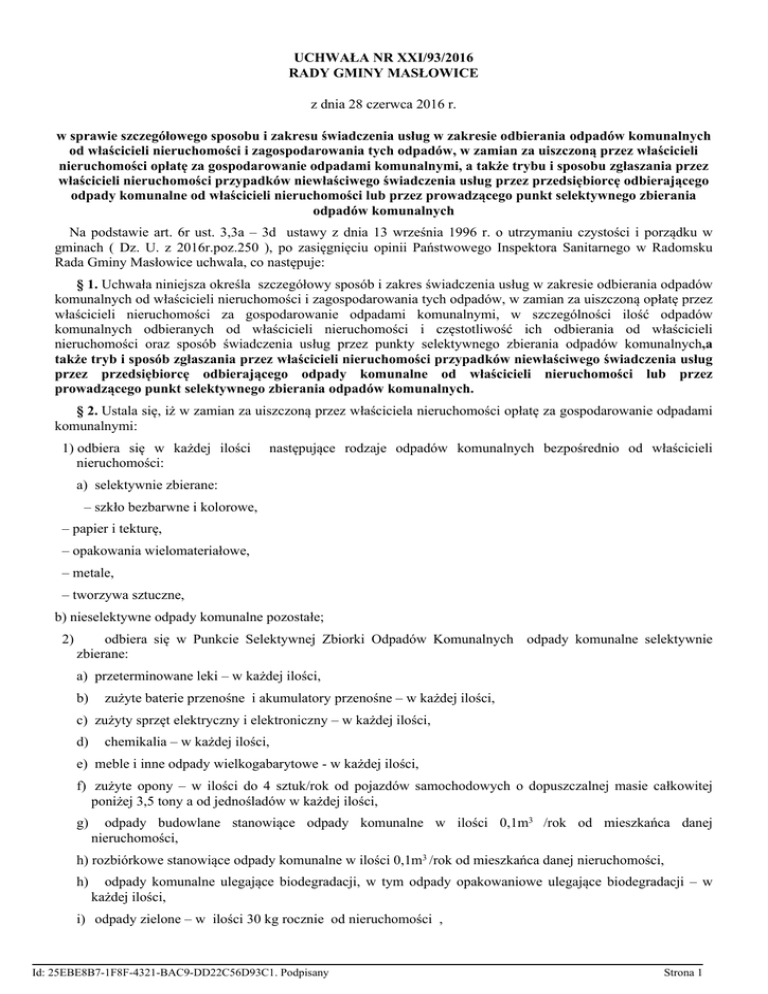 UCHWAŁA NR XXI/93/2016 RADY GMINY MASŁOWICE z dnia 28 czerwca 2016 r. w sprawie szczegółowego sposobu i zakresu świadczenia usług w zakresie odbierania odpadów komunalnych od właścicieli nieruchomości i zagospodarowania tych odpadów, w zamian za uiszczoną przez właścicieli nieruchomości opłatę za gospodarowanie odpadami komunalnymi, a także trybu i sposobu zgłaszania przez właścicieli nieruchomości przypadków niewłaściwego świadczenia usług przez przedsiębiorcę odbierającego odpady komunalne od właścicieli nieruchomości lub przez prowadzącego punkt selektywnego zbierania odpadów komunalnych Na podstawie art. 6r ust. 3,3a – 3d ustawy z dnia 13 września 1996 r. o utrzymaniu czystości i porządku w gminach ( Dz. U. z 2016r.poz.250 ), po zasięgnięciu opinii Państwowego Inspektora Sanitarnego w Radomsku Rada Gminy Masłowice uchwala, co następuje: § 1. Uchwała niniejsza określa szczegółowy sposób i zakres świadczenia usług w zakresie odbierania odpadów komunalnych od właścicieli nieruchomości i zagospodarowania tych odpadów, w zamian za uiszczoną opłatę przez właścicieli nieruchomości za gospodarowanie odpadami komunalnymi, w szczególności ilość odpadów komunalnych odbieranych od właścicieli nieruchomości i częstotliwość ich odbierania od właścicieli nieruchomości oraz sposób świadczenia usług przez punkty selektywnego zbierania odpadów komunalnych,a także tryb i sposób zgłaszania przez właścicieli nieruchomości przypadków niewłaściwego świadczenia usług przez przedsiębiorcę odbierającego odpady komunalne od właścicieli nieruchomości lub przez prowadzącego punkt selektywnego zbierania odpadów komunalnych. § 2. Ustala się, iż w zamian za uiszczoną przez właściciela nieruchomości opłatę za gospodarowanie odpadami komunalnymi: 1) odbiera się w każdej ilości nieruchomości: następujące rodzaje odpadów komunalnych bezpośrednio od właścicieli a) selektywnie zbierane: – szkło bezbarwne i kolorowe, – papier i tekturę, – opakowania wielomateriałowe, – metale, – tworzywa sztuczne, b) nieselektywne odpady komunalne pozostałe; 2) odbiera się w Punkcie Selektywnej Zbiorki Odpadów Komunalnych odpady komunalne selektywnie zbierane: a) przeterminowane leki – w każdej ilości, b) zużyte baterie przenośne i akumulatory przenośne – w każdej ilości, c) zużyty sprzęt elektryczny i elektroniczny – w każdej ilości, d) chemikalia – w każdej ilości, e) meble i inne odpady wielkogabarytowe - w każdej ilości, f) zużyte opony – w ilości do 4 sztuk/rok od pojazdów samochodowych o dopuszczalnej masie całkowitej poniżej 3,5 tony a od jednośladów w każdej ilości, g) odpady budowlane stanowiące odpady komunalne w ilości 0,1m3 /rok od mieszkańca danej nieruchomości, h) rozbiórkowe stanowiące odpady komunalne w ilości 0,1m3 /rok od mieszkańca danej nieruchomości, h) odpady komunalne ulegające biodegradacji, w tym odpady opakowaniowe ulegające biodegradacji – w każdej ilości, i) odpady zielone – w ilości 30 kg rocznie od nieruchomości , Id: 25EBE8B7-1F8F-4321-BAC9-DD22C56D93C1. Podpisany Strona 1 j) popioły z domowych palenisk – w każdej ilości, k) tekstylia, odzież – w każdej ilości, l ) zużyte żarówki - w każdej ilości, m) lampy fluorescencyjne, świetlówki i inne odpady zawierające rtęć – w każdej ilości, n) opakowania po tonerach, katridżach – w każdej ilości , o) odpady komunalne określone w przepisach wydanych na podstawie art.4 a ustawy o utrzymaniu czystości i porządku w gminach – w każdej ilości. § 3. 1. Właściciele nieruchomości , z zastrzeżeniem ust.2 samodzielnie i na własny koszt dostarczą do Punktu Selektywnej Zbiórki Odpadów odpady komunalne zebrane w sposób selektywny określone w § 2 pkt 2. 2. Odbiór mebli i innych odpadów wielkogabarytowych odbywać się będzie również raz w roku metodą objazdową w określonych terminach i godzinach zbiórki. Informacja zostanie przekazana właścicielom nieruchomości przez Wójta Gminy Masłowice. § 4. 1. Określa się, z zastrzeżeniem ust.2 częstotliwość odbioru odpadów komunalnych bezpośrednio od właścicieli nieruchomości: 1) odbiór nieselektywnych odpadów komunalnych pozostałych, od właścicieli nieruchomości - odbywać się będzie w terminach podanych przez odbiorcę odpadów, nie rzadziej niż 1 x miesiąc; 2) odbiór odpadów zbieranych selektywnie: papieru i tektury, opakowań wielomateriałowych, metali, tworzywa sztucznego od właścicieli nieruchomości odbywać się będzie w terminach podanych przez odbiorcę odpadów nie rzadziej niż 1 x miesiąc; 3) odbiór szkła bezbarwnego i kolorowego zbieranego selektywnie przez właścicieli nieruchomości odbywać się będzie w terminach podanych przez odbiorcę odpadów nie rzadziej niż 1 x na kwartał . 2. Odbiór odpadów z nieruchomości, na których znajdują się domki letniskowe wykorzystywanych na cele rekreacyjno-wypoczynkowe, wykorzystywanych jedynie przez część roku, w zamian za uiszczoną opłatę będzie wykonywany z częstotliwością odbioru odpadów nie rzadziej niż raz w miesiącu w okresie od kwietnia do listopada, a w okresie od grudnia do marca 1 raz. § 5. 1. Określa się, że wszelkie nieprawidłowości w świadczeniu usług przez przedsiębiorcę odbierającego odpady komunalne od właścicieli nieruchomości oraz przez prowadzony Punkt Selektywnej Zbiórki Odpadów w Masłowicach należy zgłaszać do Urzędu Gminy w Masłowicach nie później jednak niż w ciągu 2 dni po wystąpieniu nieprawidłowości .Zgłoszenia należy dokonywać w formie pisemnej. 2. Zgłoszenie, o którym mowa w ust. 1, zawiera dane identyfikacyjne właściciela nieruchomości, dane adresowe nieruchomości, na której powstają odpady komunalne, szczegółowy opis zaistniałego niewłaściwego świadczenia usługi przez przedsiębiorcę odbierającego odpady komunal