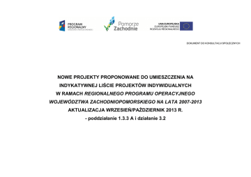 DOKUMENT DO KONSULTACJI SPOŁECZNYCH NOWE PROJEKTY PROPONOWANE DO UMIESZCZENIA NA INDYKATYWNEJ LIŚCIE PROJEKTÓW INDYWIDUALNYCH W RAMACH REGIONALNEGO PROGRAMU OPERACYJNEGO WOJEWÓDZTWA ZACHODNIOPOMORSKIEGO NA LATA 2007-2013 AKTUALIZACJA WRZESIEŃ/PAŹDZIERNIK 2013 R. - poddziałanie 1.3.3 A i działanie 3.2 Lp. Nazwa projektu Orientacyjny koszt całkowity projektu (PLN) 1 2 3 Przewidywany okres realizacji projektu (PLN) Miejsce realizacji Instytucja odpowiedzialna za realizację Uzasadnienie realizacji projektu 4 5 6 7 Oś 1 GOSPODARKA – INNOWACJE – TECHNOLOGIE Działanie 1.3. ZAAWANSOWANE USŁUGI WSPARCIA DLA PRZEDSIĘBIORSTW Koszt całkowity projektu: 1. Budowa drogi wspomagającej drogę S-3 na odcinku węzeł "Święta" - wiadukt "Lubczyna" 18 694 726,00 zł Proponowane dofinansowanie: 5 500 000,00 zł Poddziałanie 1.3.3 Wzrost atrakcyjności inwestycyjnej Schemat A Projekt polega na doprowadzeniu niezbędnej infrastruktury drogowej umożliwiającej rozwój Goleniowskiej Strefy Przemysłowej i firm znajdujących się na jej terenie oraz właściwe skomunikowanie jej z pozostałymi terenami inwestycyjnymi niezbędnymi do rozwoju regionu. Zakres projektu obejmuje bezkolizyjne połączenie terenów inwestycyjnych Strefy z układem komunikacyjnym drogi S3 i miasta obejmujące: połączenie drogi wojewódzkiej nr 113, prowadzącej z Goleniowa w stronę Stepnicy niedaleko węzła drogowego „Święta”, z drogą wychodzącą z Goleniowa w stronę Lubczyny. Będzie to trasa niemal równoległa do przebiegu drogi krajowej nr 3 Szczecin-Świnoujście, przecinająca rzekę Inę nowym mostem w okolicy Domastryjewa. Będzie zatem pełnić rolę drogi wspomagającej wobec drogi nr 3. Dogodna lokalizacja inwestycji daję szansę na pozyskanie w szybkim tempie nowych inwestorów, co w istotny 2013 – 2015 Gmina Goleniów Gmina Goleniów sposób wpłynie na zmianę udziału sektora przemysłowego w gospodarce Woj. Zachodniopom. Celem projektu jest podniesienie poziomu konkurencyjności i innowacyjności gospodarki regionu poprzez wzrost atrakcyjności inwestycyjnej regionu, a w szczególności Goleniowskiego Parku Przemysłowego. Inwestycja poprzez polepszenie warunków prowadzenia działalności - utworzenie niezbędnej infrastruktury technicznej oraz tworzenie lepszych warunków do lokowania inwestycji doprowadzi do zwiększenia poziomu inwestycji firm w strefie, przyczyniając się do rozwoju regionu, zmniejszenia bezrobocia, zwiększenia napływu inwestycji zagranicznych, przynosząc wymierne korzyści dla gospodarki. Cele szczegółowe projektu to: - doprowadzenie infrastruktury drogowej do Lp. Nazwa projektu Orientacyjny koszt całkowity projektu (PLN) 1 2 3 Przewidywany okres realizacji projektu (PLN) Miejsce realizacji Instytucja odpowiedzialna za realizację 4 5 6 Uzasadnienie realizacji projektu 7 skomunikowania strefy - zapewnienie bezkolizyjnego wjazdu - zapewnienie dojazdu do przyległych terenów Uruchomienie nowego, bezpiecznego połączenia drogowego przyczyni się do realizacji postulatów lokalnych przedsiębiorców, których dalszy rozwój uzależniony jest od zapewnienia właściwej komunikacji terenów inwestycyjnych. 2. Budowa komunikacji łączącej Park Przemysłowy Nowoczesnych Technologii w Stargardzie Szczecińskim z siecią drogową miasta i regionu Koszt całkowity projektu: 13 450 000,00 zł Proponowane dofinansowanie: 3 884 696,29 zł 2014 – 2014 Powiat Stargardzki/Gmina Miasto Stargard Szczeciński/obszar miejski Gmina Miasto Stargard Szczeciński Projekt zakłada tworzenie warunków do lokowania inwestycji na terenach inwestycyjnych poprzez budowę drogi wraz z infrastrukturą towarzyszącą, komunikującej Park Przemysłowy Nowoczesnych Technologii w Stargardzie Szczecińskim z siecią drogową miasta i regionu. Planowane przedsięwzięcie polega na budowie drogi o długości ok. 2 400 m wraz z budową kanalizacji deszczowej, oświetleniem, miejscami parkingowymi, zatokami autobusowymi, usunięciem i nasadzeniem zieleni. W obecnym kształcie poziom skomunikowania terenów inwestycyjnych PPNT jest niewystarczający i ze względu na wzrost natężenia ruchu ( wynikający m.in. z rozwoju PPNT) nie zapewnia swobodnej komunikacji. Celem projektu jest tworzenie konkurencyjnych warunków do lokowania inwestycji na terenie PPNT oraz stworzenie przyjaznej przestrzeni gosp. dla przyciągnięcia kapitału. Poprzez budowę drogi komunikującej tereny PPNT z siecią drogową miasta zwiększy się pow. wspartych terenów inwest. zarówno na obszarze miasta (wskazanych jako wskaźnik) ale również otworzą się tereny inwestycyjne o pow. 100 ha należące do gminy wiejskiej Stargard przeznaczone w studium zagospodarowania przestrzennego pod funkcję przemysłową. Tym samym projekt podniesie atrakcyjność inwestycyjną miasta i regionu. Elementem wpływającym na możliwość realizacji inwestycji jest dostępność Lp. Nazwa projektu Orientacyjny koszt całkowity projektu (PLN) 1 2 3 3. Tworzenie dogodnych warunków inwestowania dla mikro- i małych przedsiębiorstw na terenie Podstrefy "Koszalin" Słupskiej Specjalnej Strefy Ekonomicznej Miejsce realizacji Instytucja odpowiedzialna za realizację 4 5 6 3 300 000,00 zł 2013 – 2015 Proponowane dofinansowanie: Uzasadnienie realizacji projektu 7 komunikacyjna. Aktualne rozwiązania komunikacyjne nie zapewniają alternatywnej komunikacji w przypadku nieprzewidzianych zdarzeń na drodze prowadzącej do PPNT oraz w przypadku prac modernizacyjnych powodując utrudnienia dla transportu towarów i dojazdu pracowników, co ma ogromny wpływ na komfort prowadzenia działalności na PPNT. Projekt dotyczy uzbrojenia terenów inwestycyjnych zlokalizowanych na obszarze Podstrefy "Koszalin" Słupskiej Specjalnej Strefy Ekonomicznej, na działkach 25/36, 31/5, 49, 50, 55/1, 55/2 obręb 007, które są własnością Gminy Miasto Koszalin oraz na działce 39/2 – własność prywatna (uzyskana zgoda właściciela). Zgodnie z Miejsc