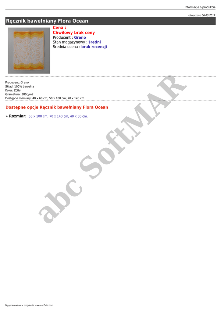 Informacje o produkcie Utworzono 06-03-2017 Ręcznik bawełniany Flora Ocean Cena : Chwilowy brak ceny Producent: Greno Skład: 100% bawełna Kolor: Żółty Gramatura: 380g/m2 Dostępne rozmiary: 40 x 60 cm; 50 x 100 cm; 70 x 140 cm ab c So ft » Rozmiar: 50 x 100 cm, 70 x 140 cm, 40 x 60 cm. M Dostępne opcje Ręcznik bawełniany Flora Ocean AR Producent : Greno Stan magazynowy : średni Średnia ocena : brak recenzji Wygenerowano w programie www.oscGold.com