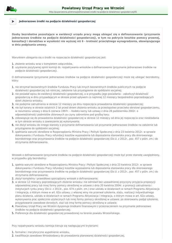 Powiatowy Urząd Pracy we Wrześni http://pupwrzesnia.pl/strona/jednorazowe-srodki-na-podjecie-dzialalnosci-gospodarczej/81 Jednorazowe środki na podjęcie działalności gospodarczej Osoby bezrobotne pozostające w ewidencji urzędu pracy mogą ubiegać się o dofinansowanie (przyznanie jednorazowo środków na podjęcie działalności gospodarczej), w tym na pokrycie kosztów pomocy prawnej, konsultacji i doradztwa w wysokości nie wyższej niż 6 – krotność przeciętnego wynagrodzenia, obowiązującego w dniu podpisania umowy. Warunkiem ubiegania się o środki na rozpoczęcie działalności gospodarczej jest: 1. złożenie wniosku wraz z kompletem załączników, 2. uzyskanie pozytywnej opinii komisji ds. rozpatrywania wniosków o dofinansowanie (przyznanie jednorazowo środków na podjęcie działalności gospodarczej). O dofinansowanie (przyznanie jednorazowo środków na podjęcie działalności gospodarczej) może się ubiegać bezrobotny, który: 1. nie otrzymał bezzwrotnych środków Funduszu Pracy lub innych bezzwrotnych środków publicznych na podjęcie działalności gospodarczej lub rolniczej, założenie lub przystąpienie do spółdzielni socjalnej; 2. nie posiadał wpisu do ewidencji działalności gospodarczej, a w przypadku jego posiadania – zakończył działalność gospodarczą w dniu przypadającym w okresie przed upływem co najmniej 12 miesięcy bezpośrednio poprzedzających dzień złożenia wniosku; 3. nie podejmie zatrudnienia w okresie 12 miesięcy po dniu rozpoczęcia prowadzenia działalności gospodarczej; 4. nie był karany w okresie ostatnich 2 lat przed dniem złożenia wniosku za przestępstwo przeciwko obrotowi gospodarczemu, w rozumieniu ustawy z dnia 6 czerwca 1997r. – Kodeks karny lub ustawy z dnia 28 października 2002r. o odpowiedzialności podmiotów zbiorowych za czyny zabronione pod groźbą kary; 5. zobowiązuje się do prowadzenia działalności gospodarczej w okresie 12 miesięcy od dnia jej rozpoczęcia oraz nieskładania w tym okresie wniosku o zawieszenie jej wykonywania; 6. nie złożył wniosku do innego starosty o przyznanie dofinansowania lub przyznanie jednorazowo środków na założenie lub przystąpienie do spółdzielni socjalnej; 7. spełniania warunki określone w Rozporządzeniu Ministra Pracy i Polityki Społecznej z dnia 23 kwietnia 2012r. w sprawie dokonywania z Funduszu Pracy refundacji kosztów wyposażenia lub doposażenia stanowiska pracy dla skierowanego bezrobotnego oraz przyznawania środków na podjęcie działalności gospodarczej (Dz.U. z 2012r., poz. 457 z późn. zm.) do otrzymania dofinansowania. Wniosek o dofinansowanie (przyznanie środków na podjęcie działalności gospodarczej) może być przez starostę uwzględniony, w przypadku gdy bezrobotny: 1. spełnia warunki określone w Rozporządzeniu Ministra Pracy i Polityki Społecznej z dnia 23 kwietnia 2012r. w sprawie dokonywania z Funduszu Pracy refundacji kosztów wyposażenia lub doposażenia stanowiska pracy dla skierowanego bezrobotnego oraz przyznawania środków na podjęcie działalności gospodarczej (Dz.U. z 2012r., poz. 457 z późn. zm.) do otrzymania dofinansowania; 2. złożył kompletny i prawidłowo sporządzony wniosek o dofinansowanie; 3. w okresie 12 miesięcy poprzedzających złożenie wniosku: nie odmówił bez uzasadnionej przyczyny przyjęcia propozycji odpowiedniej pracy lub innej formy pomocy określonej w ustawie z dnia 20 kwietnia 2004r. o promocji zatrudnienia i instytucjach rynku pracy (Dz.U. z 2013r., poz. 674 z późn. zm.) oraz udziału w działaniach w ramach Programu Aktywizacja i Integracja, o którym mowa w art. 62a ustawy; z własnej winy nie przerwał szkolenia, stażu, realizacji indywidualnego planu działania, udziału w działaniach w ramach Programu Aktywizacja i Integracja, o którym mowa w art. 62a ustawy, wykonywania prac społecznie użytecznych lub innej formy pomocy określonej w ustawie; po skierowaniu podjął szkolenie, przygotowanie zawodowe dorosłych, staż lub inną formę pomocy określoną w ustawie; 4. Powiatowy Urząd Pracy we Wrześni dysponuje środkami finansowymi z przeznaczeniem na przyznanie jednorazowo środków na podjęcie działalności gospodarczej; 5. Preferencje dla działalności gospodarczej prowadzonej na terenie powiatu Wrzesińskiego. Przy rozpatrywaniu wniosku komisja kieruje się następującymi kryteriami: 1. formalne i merytoryczne wypełnienie wniosku, 2. kwalifikacje zawodowe Wnioskodawcy do prowadzenia planowanej działalności gospodarczej, 3. doświadczenie zawodowe Wnioskodawcy do prowadzenia planowanej działalności gospodarczej, 4. przygotowanie Wnioskodawcy do prowadzenia planowanej działalności gospodarczej (poprawnie dokonana analiza rynku konkurencji, poprawnie zdiagnozowane grupy kontrahentów, poprawnie przygotowana analiza SWOT), 5. ocena planowanej działalności gospodarczej (cele i motywy podjęcia działalności gospodarczej; konkurencyjność oferowanego produktu, usługi, towaru; planowany kierunek rozwoju firmy), 6. proponowana forma zabezpieczenia, 7. przeznaczenie środków finansowych z PUP na wydatki związane bezpośrednio i jednoznacznie z rodzajem planowanej działalności gospodarczej, 8. spełnienie warunków określonych w Regulaminie Powiatowego Urzędu Pracy we Wrześni. Środki finansowe przyznane osobom bezrobotnym mogą zostać przeznaczone na zakup środków trwałych, urządzeń, maszyn. Warunkiem ubiegania się przez bezrobotnego o przyznanie dofinansowania jest wskazanie formy zabezpieczenia zwrotu otrzymanych środków. Formę zabezpieczenia zwrotu otrzymanych środków w przypadku nie wywiązania się z warunków prowadzenia działalności gospodarczej może stanowić umowa poręczenia (min. 2 poręczycieli). Umowa o dofinansowanie (przyznanie środków na podjęcie działalności gospodarczej) zawiera w szczególności zobowiązanie bezrobotnego do: 1. prowadzenia działalności gospodarczej przez okres co najmniej 