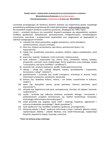 ZAKRES WIEDZY I UMIEJĘTNOŚCI WYMAGANYCH NA POSZCZEGÓLNYCH STOPNIACH WOJEWÓDZKIEGO KONKURSU JĘZYKA ROSYJSKIEGO PRZEPROWADZANEGO W GIMNAZJACH W ROKU SZK. 2014/2015 Uczniowie przystępujący do konkursu powinni wykazać się znajomością języka rosyjskiego przewidzianą podstawą programową dla szkoły gimnazjalnej i wykraczającą poza nią. Na wszystkich etapach konkursu uczestnicy piszą test, składający się z kilku części. Uczeń – uczestnik konkursu (na wszystkich etapach) posługuje się odpowiednim zasobem środków językowych (leksykalnych, gramatycznych, ortograficznych), umożliwiającym rozumienie, tworzenie i przetwarzanie wypowiedzi oraz reagowanie na wypowiedzi w zakresie następujących tematów: 1) człowiek (np. dane personalne, wygląd zewnętrzny, cechy charakteru, zainteresowania, uczucia i emocje), 2) dom (np. miejsce zamieszkania, opis domu, pomieszczeń domu i ich wyposażenia), 3) szkoła (np. przedmioty nauczania, przybory szkolne, zajęcia pozalekcyjne, życie szkoły), 4) praca (np. zawody i związane z nimi czynności, miejsca pracy), 5) życie rodzinne i towarzyskie (np. okresy życia, członkowie rodziny, koledzy, przyjaciele, czynności życia codziennego, formy spędzania czasu wolnego, święta i uroczystości, styl życia, konflikty* i problemy*), 6) żywienie (np. artykuły spożywcze, posiłki, lokale gastronomiczne), 7) zakupy i usługi (np. rodzaje sklepów, towary, sprzedawanie i kupowanie, korzystanie z usług*, reklama*), 8) podróżowanie i turystyka (np. środki transportu, orientacja w terenie, hotel, informacja turystyczna, zwiedzanie, wycieczki), 9) kultura (np. dziedziny kultury, twórcy i ich dzieła, uczestnictwo w kulturze, media*), 10) sport (np. dyscypliny sportu, sprzęt sportowy, imprezy sportowe, sport wyczynowy*), 11) zdrowie (np. higieniczny tryb życia, samopoczucie, choroby, ich objawy i leczenie, uzależnienia*), 12) nauka i technika (np. odkrycia naukowe, wynalazki, obsługa i korzystanie z podstawowych urządzeń technicznych, np. telefon komórkowy, komputer, technologie informacyjno-komunikacyjne*), 13) świat przyrody (np. pogoda, świat roślin i zwierząt, krajobraz, zagrożenie* i ochrona środowiska naturalnego*, klęski żywiołowe*), 14) życie społeczne* (np. konflikty i problemy społeczne, przestępczość), 15) elementy wiedzy o Rosji* (wybrane informacje o kraju i ludziach, główne miasta, najsłynniejsze obiekty i zabytki Moskwy oraz Sankt-Petersburga, najsłynniejsi Rosjanie, popularne święta, zwyczaje, suweniry) *treści nie dotyczą etapu szkolnego Etap szkolny Test składa się z następujących części: - test sprawdzający umiejętność czytania ze zrozumieniem, - test leksykalno-gramatyczny. Struktury gramatyczne: 1. Rzeczownik: formy gramatyczne rzeczowników wszystkich rodzajów liczby pojedynczej i mnogiej, rzeczowniki nieodmienne 2. Czasownik: formy bezokolicznika, czas teraźniejszy, przeszły, przyszły prosty i złożony – koniugacje czasownika, czasowniki nieregularne, czasowniki zwrotne, o odmiennym rządzie, czasowniki dokonane i niedokonane, tryb rozkazujący (2 os. l.poj. i mn.) 3. Przymiotnik: formy gramatyczne przymiotników twardotematowych i miękkotematowych, stopniowanie przymiotników (stopień wyższy) 4. Zaimki: formy gramatyczne zaimków osobowych, pytających, wskazujących 5. Liczebniki: formy liczebników głównych od 1 do 1000, liczebniki porządkowe 6. Przysłówki: miejsca i kierunku, czasu, sposobu, stopniowanie przysłówków 7. Przyimki, konstrukcje przyimkowe 8. Spójniki i partykuły 9. Składnia: zdania pojedyncze i złożone, zdania oznajmujące, przeczące, pytające, zdania współrzędnie złożone (spójniki и, а, но), podrzędnie złożone ze spójnikami потому что, поэтому,чтобы, если, когда 10. Stosowanie zasad ortograficznych – pisownia samogłosek po ж, ч, ш, щ, ц (wyjątki), pisownia ь, ъ, pisownia przedrostków, wyrazy z podwójną spółgłoską (класс) Etap rejonowy Test składa się z następujących części: - rozumienie ze słuchu, - rozumienie tekstu pisanego, - część leksykalno-gramatyczna, - krótka wypowiedź pisemna (życzenia, zaproszenie, pozdrowienia, ogłoszenie). Struktury gramatyczne: 1. Rzeczownik: formy gramatyczne rzeczowników wszystkich rodzajów liczby pojedynczej i mnogiej, rzeczowniki o odmianie przymiotnikowej, rzeczowniki nieodmienne 2. Czasownik: formy bezokolicznika, czas teraźniejszy, przeszły, przyszły prosty i złożony – koniugacje czasownika, czasowniki nieregularne, czasowniki zwrotne, czasowniki dokonane i niedokonane, tryb rozkazujący (formy z wyrazami давай/давайте), rekcja czasowników 3. Przymiotnik: formy gramatyczne przymiotników twardotematowych i miękkotematowych, stopniowanie przymiotników (stopień wyższy i najwyższy) 4. Zaimki: formy gramatyczne zaimków osobowych, pytających, przeczących (никто, ничто), dzierżawczych, wskazujących, zaimek себя i wyrażenie zaimkowe друг друга 5. Liczebniki: formy liczebników głównych od 1 do 1000, liczebniki porządkowe, liczebniki w połączeniu z rzeczownikiem 6. Przysłówki: miejsca i kierunku, czasu, przyczyny, celu, sposobu, przysłówki przeczące, stopniowanie przysłówków 7. Przyimki, konstrukcje przyimkowe 8. Spójniki i partykuły 9. Składnia: zdania pojedyncze i złożone, zdania oznajmujące, przeczące, pytające, zdania współrzędnie złożone (spójniki и, а, но), podrzędnie złożone ze spójnikami потому что, поэтому,чтобы, если, когда, zdania bezpodmiotowe 10. Stosowanie podstawowych zasad ortograficznych Etap wojewódzki Test składa się z następujących części: - rozumienie ze słuchu, - rozumienie tekstu pisanego, - część leksykalno-gramatyczna, - krótka wypowiedź pisemna (e-mail). Struktury gramatyczne: 1. Rzeczownik: formy gramatyczne rzeczowników wszystkich rodzajów liczby pojedync