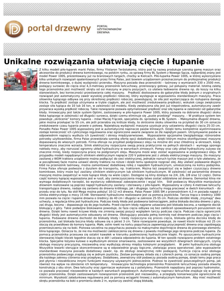 Unikalne rozwiązania ułatwiają cięcie i łupanie Z kilku modeli piło-łuparek marki Palax, firmy Ylistaron Terästakomo, która pod tą nazwą produkuje szeroką gamę maszyn oraz akcesoriów do produkcji drewna kominkowego, na polskim rynku, za sprawą firmy BL System z Nowego Sącza, najbardziej znany jest model Power 100S, prezentowany już na branżowych targach, choćby w Kielcach. Piło-łuparka Power 100S, w której wykorzystano kilka unikalnych rozwiązań opatentowanych przez firmę Palax, jest bowiem urządzeniem przeznaczonym do profesjonalnej produkcji drewna kominkowego, o dużej wydajności przerobu. Maszyna posiada dwa przenośniki – taśmowy o wymiarach 330 x 2500 mm, podający surowiec do cięcia oraz 4,3-metrowy przenośnik łańcuchowy, przenoszący gotowy, już połupany materiał. Istotną zaletą tego przenośnika jest możliwość skrętu od osi maszyny w pięciu pozycjach, co ułatwia ładowanie drewna np. do koszy na kilku stanowiskach, bez konieczności przestawiania całej maszyny. Prędkość dostosowana do gabarytów kłody Jednym z oryginalnych rozwiązań jest automatyczny zawór wysokiej prędkości roboczej, który występuje w wyposażeniu standardowym maszyny. Praca siłownika łupiącego odbywa się przy określonej prędkości roboczej, powodującej, że siła jest wystarczająca do rozłupania danego klocka. Ta prędkość zostaje utrzymana w trybie ciągłym, ale jest możliwość zredukowania prędkości, wskutek czego zwiększona zostaje siła łupiąca do 10 lub 16 ton, w zależności od modelu. Kiedy zwiększona siła jest już niepotrzebna, automatyczny zawór przywraca wysoką prędkość roboczą. Takie rozwiązanie pozwala optymalizować prędkość oraz siłę łupania w zależności od gabarytów kłody. Innowacyjny jest także system Optimi, zastosowany w piło-łuparce Power 100S, który pozwala na dobranie długości skoku tłoka łupiącego w zależności od długości surowca, dzięki czemu eliminuje się „puste przebiegi” maszyny. – W praktyce system ten powoduje „skrócenie” komory łupania – mówi Maciej Frączek, specjalista ds. sprzedaży w BL System. – Maksymalna długość drewna, jakie można przełupać to 55 cm, ale jeśli przerabia się krótsze kłody, to skrócenie skoku siłownika na przykład do 30 cm oznacza zredukowanie czasu łupania prawie o połowę. Największą wydajność maszyna uzyskuje przy ustawieniu długości cięcia 25-33 cm. Ponadto Palax Power 100S wyposażony jest w automatyczne napinacze pasów klinowych. Dzięki temu kompletnie wyeliminowana zostaje konieczność ich cyklicznego regulowania oraz ograniczone awarie związane ze źle napiętym pasem. Utrzymywanie pasów w odpowiednim napięciu wydłuża ich żywotność i okresy międzyserwisowe. Wyposażenie opcjonalne Uwzględniając różnorodne potrzeby użytkowników, firma Palax przewidziała szeroką ofertę opcji dodatkowych, dzięki którym można skonfigurować maszynę dopasowaną do własnych potrzeb. Firma oferuje na przykład podgrzewacz oleju na mroźne dni oraz chłodnicę w okresach, kiedy temperatura znacznie wzrasta. Silnik elektryczny rozpoczyna swoją pracę praktycznie na pełnych obrotach i wymaga sporego nakładu mocy, aby rozruszać ogromny układ hydrauliczny w warunkach zimowych. Pompy oraz cały układ hydrauliczny zużywa się znacznie mniej, kiedy rozpoczyna pracę na podgrzanym oleju. Maszyna może więc zostać wyposażona w podgrzewacz oleju. W przypadku modeli napędzanych silnikiem elektrycznym napięcie 220 V pobierane jest z układu elektrycznego maszyny. Do maszyny zasilanej z WOM traktora urządzenie można podłączyć do sieci elektrycznej, jednakże rozruch tychże maszyn jest o tyle ułatwiony, że w początkowej fazie można ustawić obroty traktora na niższe i dzięki temu spokojnie rozgrzać olej. Aby ułatwić podawanie długich kłód na przenośnik taśmowy, można zamontować dodatkową rolkę z napędem hydraulicznym, umieszczoną na końcu podajnika. Firma Palax oferuje podwozie z dyszlem do transportu, np. traktorem. Można też zaopatrzyć się w bęben czyszczący drewno kominkowe, który może być zasilany silnikiem elektrycznym lub silnikiem hydraulicznym. W zależności od parametrów drewna maszynę można zaopatrzyć w noże łupiące kłody na wiele części. Dostępne są kliny dzielące na 2/4, 2/6, 2/8 oraz 12 części. Dolna część komory łupiącej wyposażona jest w ruszt, aby zanieczyszczenia mogły łatwo zostać oddzielone od drewna. Demontaż klina nie wymaga dodatkowych narzędzi, bo wystarczy odblokować zabezpieczenie i wyjąć klin. Stół podawczy Wszystkie manipulacje drewnem realizowane są poprzez napęd hydrauliczny zasilany i sterowany z piło-łuparki. Wyposażony w cztery 4-metrowe łańcuchy transportujące drewno, nadaje się zarówno do drewna krótkiego, jak i długiego. Łańcuchy mogą pracować w dwóch kierunkach – do przodu oraz do tyłu. Na stół Mega można położyć 10-12 m3 drewna. Palax Power 100S SM z przenośnikiem 4,3 m posiada napęd z silnika elektrycznego o mocy 15 kW. Sterowanie hydrauliczne realizowane jest za pomocą joysticków. Tarcza tnąca o średnicy 1000 mm pozwala na cięcie i łupanie drewna o średnicy do 40 cm i długości w zakresie 25-55 cm. Podczas obróbki kłodę „trzymają” dwa uchwyty, a regulacja klina jest hydrauliczna. Podczas kiedy kłoda jest podawana taśmociągiem, jedna blokada dociska drewno z góry, zaś druga, boczna – dopasowuje się do jego kształtu. Przed cięciem kłody najpierw ustawiana jest blokada boczna, a następnie docisk blokujący z góry. Takie podwójne blokowanie powoduje, że faza cięcia odbywa się bez zakłóceń spowodowanych poruszeniem się drewna. Dzięki temu nawet krzywe kłody nie zmienią swojej pozycji względem tarczy podczas cięcia. Podczas cięcia ogranicznik długości kłody jest automatycznie odsuwany od drewna. Obsługujący posiada pełną kontrol