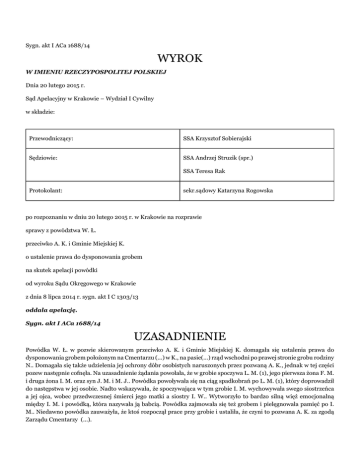 Sygn. akt I ACa 1688/14 WYROK W IMIENIU RZECZYPOSPOLITEJ POLSKIEJ Dnia 20 lutego 2015 r. Sąd Apelacyjny w Krakowie – Wydział I Cywilny w składzie: Przewodniczący: SSA Krzysztof Sobierajski Sędziowie: SSA Andrzej Struzik (spr.) SSA Teresa Rak Protokolant: sekr.sądowy Katarzyna Rogowska po rozpoznaniu w dniu 20 lutego 2015 r. w Krakowie na rozprawie sprawy z powództwa W. Ł. przeciwko A. K. i Gminie Miejskiej K. o ustalenie prawa do dysponowania grobem na skutek apelacji powódki od wyroku Sądu Okręgowego w Krakowie z dnia 8 lipca 2014 r. sygn. akt I C 1303/13 oddala apelację. Sygn. akt I ACa 1688/14 UZASADNIENIE Powódka W. Ł. w pozwie skierowanym przeciwko A. K. i Gminie Miejskiej K. domagała się ustalenia prawa do dysponowania grobem położonym na Cmentarzu (...) w K., na pasie(...) rząd wschodni po prawej stronie grobu rodziny N.. Domagała się także udzielenia jej ochrony dóbr osobistych naruszonych przez pozwaną A. K., jednak w tej części pozew następnie cofnęła. Na uzasadnienie żądania powołała, że w grobie spoczywa L. M. (1), jego pierwsza żona F. M. i druga żona I. M. oraz syn J. M. i M. J.. Powódka powoływała się na ciąg spadkobrań po L. M. (1), który doprowadził do następstwa w jej osobie. Nadto wskazywała, że spoczywająca w tym grobie I. M. wychowywała swego siostrzeńca a jej ojca, wobec przedwczesnej śmierci jego matki a siostry I. W.. Wytworzyło to bardzo silną więź emocjonalną między I. M. i powódką, która nazywała ją babcią. Powódka zajmowała się też grobem i pielęgnowała pamięć po I. M.. Niedawno powódka zauważyła, że ktoś rozpoczął prace przy grobie i ustaliła, że czyni to pozwana A. K. za zgodą Zarządu Cmentarzy (...). Pozwana Gmina Miejska K. wnosiła o „rozpoznanie sprawy w oparciu o istniejące dokumenty” i nieobciążanie jej kosztami postępowania sądowego i przyznała fakt złożenia w przedmiotowym grobie osób wskazanych w pozwie, stwierdzając jednak, że stan prawny grobu jest uregulowany, a jego dysponentem jest A. K., której tytuł wynika z prawomocnego wyroku Sądu Okręgowego w Krakowie z dnia 16 grudnia 2011 r. sygn. akt I C 2209/11. Pozwana A. K. w odpowiedzi na pozew oświadczyła, że uznaje żądanie pozwu odnośnie prawa dysponowania grobem, jednak ustnie na rozprawie sprecyzowała, że uznaje to żądanie w zakresie współdysponowania wraz z nią przedmiotowym grobem. Pozwana ta nie kwestionowała twierdzeń pozwu co do więzi rodzinnych powódki z osobami spoczywającymi w grobie i pielęgnowania przez powódkę kultu osób zmarłych, powoływała się natomiast na swe uprawnienie do grobu wynikające z ww. prawomocnego wyroku. Wyrokiem z dnia 8 lipca 2014 r. Sąd Okręgowy w Krakowie ustalił, że powódce W. Ł. przysługuje prawo do współdysponowania grobem zlokalizowanym na Cmentarzu(...)w K. na pasie (...) rząd wschodni, po prawej stronie grobu rodziny N., razem z obecną dysponentką grobu A. K., oddalił powództwo w pozostałym zakresie, umorzył postępowanie w zakresie powództwa o ochronę dóbr osobistych oraz zniósł wzajemnie koszty postępowania między stronami. Uzasadniając powyższy wyrok sąd I instancji wskazał na bezsporne okoliczności, a to że w przedmiotowym grobie spoczywają L. M. (1), jego pierwsza żona F. M., druga żona I. M., syn J. M. i M. J.. Spadek po L. M. (1) przypadł drugiej żonie I. M., po której dziedziczył jej siostrzeniec L. M. (2), po nim zaś dziedziczyły po ½ części żona D. M. i córka – powódka W. Ł.. Powódkę z I. M. łączyła bardzo silna więź emocjonalna, pochówkiem I. M. zajmował się ojciec powódki, zaś powódka sprawowała opiekę nad grobem. Pozwana A. K. jest dysponentem grobu, a jej tytuł prawny wynika z prawomocnego wyroku Sądu Okręgowego w Krakowie z dnia 16 grudnia 2011 r. sygn. akt I C 2209/11. W swych rozważaniach prawnych sąd I instancji wskazał na mieszany charakter prawa do grobu, łączącego elementy o charakterze majątkowym i osobistym, przy czym wyłącznie charakter majątkowy może mieć prawo do grobu, w którym nie została złożona żadna osoba zmarła. W sytuacji, gdy w grobie jest już ktoś pochowany, na pierwszy plan wysuwają się elementy niemajątkowe, w konsekwencji czego prawo to jest niezbywalne i nie podlega dziedziczeniu. Generalnie prawo do grobu przysługuje osobie, która podpisała z zarządcą cmentarza stosowną umowę i uiściła opłatę, zaś po jej śmierci prawo do pochowania zwłok w grobie przysługuje osobom wymienionym w art. 10 ustawy o cmentarzach i chowaniu zmarłych. W wyjątkowych wypadkach dobro osobiste innej osoby może korzystać z pierwszeństwa przed członkami rodziny z uwagi na szczególnie silna więź emocjonalną. Powódka należy do kręgu osób wymienionych w art. 10 ustawy o cmentarzach i chowaniu zmarłych, faktycznie opiekowała się grobem i kultywowała pamięć zmarłych w tym grobie spoczywających. Ani obecna dysponentka grobu A. K., ani druga z pozwanych – Gmina Miejska K. nie kwestionowały prawa powódki do grobu, co doprowadziło sąd I instancji do ustalenia prawa powódki do współdysponowania grobem z pozwaną A. K.. Zdaniem sądu I instancji nie byłoby prawidłowym ustalenie prawa powódki do dysponowania przedmiotowym grobem, a nie do współdysponowania, gdyż grób ten posiada już dysponenta, zaś gdy prawo takie służy więcej niż jednej osobie, ma miejsce prawo współdysponowania grobem o bezudziałowym charakterze. Sąd wskazał przy tym, że musiał respektować prawo pozwanej A. K., jako wynikające z prawomocnego wyroku. Wyrok powyższy zaskarżyła powódka w części ustalającej je prawo do współdysponowania grobem wraz z pozwaną A. K. i oddalającej powództwo w pozostałej części. Zaskarżonemu wyrokowi apelująca zarzuciła: 1) sprzeczne z literalną treścią odpowiedzi na pozew ustalenie faktyczne, że pozwana Gmina Miejska K. wnosiła o oddalenie powództwa, podczas gdy