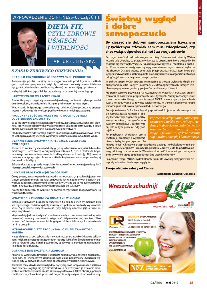 Dieta FIT, czyli zdrowie, uśmiech i witalność A rtur Ł . L igęska 8 zasad zdrowego odżywiania: Dbanie o różnorodność spożywanych produktów Komponując posiłki, starajmy się w ciągu dnia jeść produkty ze wszystkich grup, czyli warzywa, owoce, artykuły zbożowe, produkty wysokobiałkowe (ryby, drób, chude mięso, rośliny strączkowe) oraz mleko i jego przetwory. Najlepiej, jeśli każdy posiłek łączy produkty przynajmniej z trzech grup. Utrzymywanie właściwej wagi Powinniśmy wystrzegać się nawet małej nadwagi, ponieważ szybko prowadzi ona do otyłości, a ta wiąże się z licznymi problemami zdrowotnymi. W trzymaniu linii pomogą nam codzienny ruch i właściwa gospodarka energetyczna – odpowiednia wielkość posiłków i regularne ich spożywanie. Produkty zbożowe, warzywa i owoce podstawą codziennego jadłospisu Są to kluczowe składniki każdej zdrowej diety. Dostarczają dużych ilości błonnika, który jest niezbędny dla właściwej pracy układu pokarmowego, a także obniża ryzyko zachorowania na miażdżycę i nowotwory. Produkty zbożowe dostarczają dużych ilości energii, natomiast warzywa i owoce wzbogacają dietę w cenne witaminy i składniki mineralne, a także wodę. Ograniczenie spożywania tłuszczy, zwłaszcza zwierzęcych Tłuszcze to konieczny element diety, gdyż są składnikiem wszystkich błon komórkowych i uczestniczą w przyswajaniu witamin A, D, E i K. Jednakże bogate w nasycone kwasy tłuszczowe i szkodliwy cholesterol (frakcję LDL) tłuszcze zwierzęce mogą sprzyjać chorobom układu krążenia – zwłaszcza prowadzącej do zawału miażdżycy. Zdrowe tłuszcze to przede wszystkim tłuszcze roślinne zawierające dużą ilość nienasyconych kwasów tłuszczowych. Unikanie prostych węglowodanów Cukry proste, zawarte przede wszystkim w słodyczach, są najłatwiej przyswajalnym źródłem energii, jednak spożywanie ich w nadmiernych ilościach powoduje zaburzenia poziomu glukozy we krwi. Wiąże się to nie tylko z problemami z nadwagą, ale może również prowadzić do cukrzycy. Należy też pamiętać, że wszelkie nadwyżki energetyczne magazynowane są w postaci tłuszczu. ZDROWIE I URODA W P R O WA D Z E N IE DO FITNESS -U, CZĘŚ Ć III: Świetny wygląd i dobre samopoczucie By cieszyć się dobrym samopoczuciem fizycznym i psychicznym człowiek sam musi zdecydować, czy chce wziąć odpowiedzialność za swoje zdrowie Bez tego powrót do zdrowia nie jest możliwy. Człowiek jest całością. Ważna jest nie tyle choroba, co przyczyny tkwiące w organizmie, które pozwoliły, by choroba się rozwinęła. Wszyscy funkcjonujemy: fizycznie, mentalnie i duchowo. Emocje również mają wyraźny wpływ na stan naszego zdrowia i wyleczenie choroby. Dlatego ważne, by terapie przeprowadzane aparatem Mora połączyć z indywidualnie dobraną dietą oraz oczyszczeniem organizmu z toksyn i złogów, jakie odkładają się w naszych jelitach. W trakcie terapii MORA procesy regulacyjne zachodzą wyłącznie dzięki oddziaływaniom ultra słabych informacji elektromagnetycznych, których źródłem są wyłącznie organizmy pacjentów poddawanych terapii. Programy testowe pozwalają na kwantyfikację wszystkich obciążeń organizmu oraz zastosowanie programów terapeutycznych. Należy zaznaczyć, iż nie stwierdzono szkodliwego działania terapii MORA. Nie obciąża pacjenta. Możliwości terapeutyczne są również wielostronne. W trakcie całościowej terapii wspomagana jest również praca układu nerwowego. Esencje kwiatowe Dr Bacha w łagodny sposób redukują stres i złe samopoczucie, wprowadzając harmonię i spokój. Oczyszczając organizm, pozby- Poprzez złe odżywianie, zanieczyszwamy się toksyn, patogenów oraz czenie środowiska naturalnego, siekwasicy komórkowej. Bardzo ważdzący tryb życia czy nadmierne stoną role w tym procesie odgrywasowanie leków zaburzamy równoją jelita. wagę w jelitach. W efekcie tracimy Po przebytych chorobach często występują problemy z wypróżnia- siły witalne, energię i koncentrację. niem, między innymi „syndrom leniwego jelita”. Okresowe przeprowadzanie zabiegu hydrokolonoterapii pozwala oczyścić organizm i usunąć złogi z jelita. Zdrowe jelito to podstawa naszego dobrego samopoczucia. Wzrasta odporność immunologiczna organizmu, w wyniku czego spada podatność na wszelkie choroby. Połączenie terapii MORA, hydrokolonoterapii i stosowanej diety pozwala cieszyć się zdrowiem i świetnym wyglądem. Twoje zdrowie zależy od Ciebie Małgorzata Kopczyk-Gimalska Spożywanie produktów bogatych w białko Białko jest głównym budulcem wszystkich tkanek, tak więc by możliwa była ich regeneracja, codzienną dietę musimy uzupełniać o produkty wysokobiałkowe. Są to przede wszystkim mięsa, ryby, artykuły mleczne, jaja, a także rośliny strączkowe. Mięso należy jednak spożywać z umiarem, a mięso czerwone (wołowinę, wieprzowinę) w miarę możliwości zastępować białym (cielęciną, drobiem). Warto wiedzieć, że mięsa są również bogatym źródłem żelaza, cynku, a także witamin z grupy B. Wzbogacanie diety produktami o dużej zawartości wapnia Nasze dzienne zapotrzebowanie na wapń możemy zaspokoić dwoma szklankami mleka (najlepiej odtłuszczonego), jogurtu lub kefiru. Źródłem tego minerału są również sery, jednak powinniśmy spożywać je z umiarem, gdyż zawierają duże ilości tłuszczu. Ograniczenie spożycia alkoholu Alkohol w większych dawkach jest bardzo szkodliwy dla naszego organizmu. Poza tym, że w znacznym stopniu obciąża układ pokarmowy (zwłaszcza wątrobę), pity w dużych ilościach sieje spustoszenie w układzie nerwowym. Jednakże małe dawki alkoholu (jedna, najwyżej dwie lampki wina lub szklanki piwa dziennie) wydają się być nieszkodliwe, a nawet wykazują działanie zdrowotne. Alkoholowe trunki często zawierają witaminy, a także obniżają poziom ciał tłuszczowych we krwi, przez co korzystn
