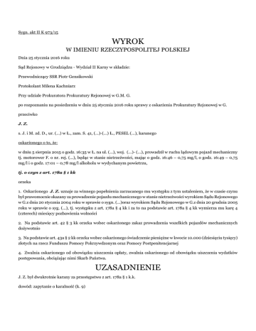 Sygn. akt II K 973/15 WYROK W IMIENIU RZECZYPOSPOLITEJ POLSKIEJ Dnia 25 stycznia 2016 roku Sąd Rejonowy w Grudziądzu - Wydział II Karny w składzie: Przewodniczący SSR Piotr Gensikowski Protokolant Milena Kachniarz Przy udziale Prokuratora Prokuratury Rejonowej w G.M. G. po rozpoznaniu na posiedzeniu w dniu 25 stycznia 2016 roku sprawy z oskarżenia Prokuratury Rejonowej w G. przeciwko J. Z. s. J. i M. zd. D., ur. (...) w Ł., zam. S. 41, (...)-(...) Ł., PESEL (...), karanego oskarżonego o to, że: w dniu 5 sierpnia 2015 o godz. 16:35 w Ł. na ul. (...), woj. (...)- (...), prowadził w ruchu lądowym pojazd mechaniczny tj. motorower F. o nr. rej. (...), będąc w stanie nietrzeźwości, mając o godz. 16:46 – 0,75 mg/l, o godz. 16:49 – 0,75 mg/l i o godz. 17:01 – 0,78 mg/l alkoholu w wydychanym powietrzu, tj. o czyn z art. 178a § 1 kk orzeka 1. Oskarżonego J. Z. uznaje za winnego popełnienia zarzucanego mu występku z tym ustaleniem, że w czasie czynu był prawomocnie skazany za prowadzenie pojazdu mechanicznego w stanie nietrzeźwości wyrokiem Sądu Rejonowego w G.z dnia 20 stycznia 2004 roku w sprawie o sygn. (...)oraz wyrokiem Sądu Rejonowego w G.z dnia 20 grudnia 2005 roku w sprawie o syg. (...), tj. występku z art. 178a § 4 kk i za to na podstawie art. 178a § 4 kk wymierza mu karę 4 (czterech) miesięcy pozbawienia wolności 2. Na podstawie art. 42 § 3 kk orzeka wobec oskarżonego zakaz prowadzenia wszelkich pojazdów mechanicznych dożywotnio 3. Na podstawie art. 43a § 2 kk orzeka wobec oskarżonego świadczenie pieniężne w kwocie 10.000 (dziesięciu tysięcy) złotych na rzecz Funduszu Pomocy Pokrzywdzonym oraz Pomocy Postpenitencjarnej 4. Zwalnia oskarżonego od obowiązku uiszczenia opłaty, zwalnia oskarżonego od obowiązku uiszczenia wydatków postępowania, obciążając nimi Skarb Państwa. UZASADNIENIE J. Z. był dwukrotnie karany za przestępstwo z art. 178a § 1 k.k. dowód: zapytanie o karalność (k. 9) Wyrokiem Sądu Rejonowego w Grudziądzu z dnia 20 stycznia 2004 r. J. Z. był skazany za przestępstwo z art. 178a § 1 k.k. na karę 1 roku pozbawienia wolności. J. Z. odbywał tę karę w okresie od 20 lutego 2007 r. do 20 lutego 2008 r. dowód: wyrok (k. 20 akt (...)obliczenie kary (k. 96 akt (...)), zawiadomienie o zwolnieniu ze sprawy Wyrokiem Sądu Rejonowego w G.z dnia 20 grudnia 2005 r. J. Z. był skazany za przestępstwo z art. 178a § 1 k.k. na karę 8 miesięcy pozbawienia wolności. J. Z. odbywał tę karę w okresie od 20 lutego 2008 r. do 3 lipca 2008 r., gdyż wtedy został warunkowo przedterminowo zwolniony z odbycia reszty kary. dowód: wyrok (k. 30 akt (...)), obliczenie kary (k. 71 akt (...)), zawiadomienie o zwolnieniu ze sprawy W dniu 5 sierpnia 2015 r. od godziny 5-ej do 15-ej J. Z. pracował na budowie w D.. W tym czasie wypił trzy piwa 0,5 litra (...) i nic nie jadł, po czym wsiadł na skutera i pojechał nim do sklepu do Ł. po zakupy. dowód: wyjaśnienia oskarżonego J. Z. (k. 15) Na ulicy (...) w Ł. motorower marki F. o nr rej. (...) kierowany przez J. Z. został zatrzymany przez funkcjonariuszy policji. Po pierwszym zbadaniu funkcjonariusze zabrali J. Z. na posterunek policji w Ł., gdzie ponownie zbadano go na okoliczność zawartości alkoholu. dowód: wyjaśnienia oskarżonego J. Z. (k. 15), zeznania świadka Ł. M. (k. 33v.) O godzinie 16:46 J. Z. miał 0,75 mg/l, o godzinie 16:49 miał 0,75 mg/l, a o godzinie 17:01 miał 0,78 mg/l alkoholu w wydychanym powietrzu. dowód: protokół badania (k. 2), świadectwo wzorcowania (k. 3) Oskarżony J. Z. w toku postępowania przygotowawczego przyznał się do popełnienia zarzucanego mu czynu zabronionego (k. 15). Sąd dał wiarę tym wyjaśnieniom, gdyż były one zgodne z zeznaniami świadka Ł. M. (k. 33v.), a w ocenie Sądu zeznania tego świadka należy uznać za w pełni wiarygodne, gdyż odpowiadały treści wyników badań oskarżonego na zawartość alkoholu w wydychanym powietrzu (k. 2). Sąd dał wiarę temu dokumentowi, a także innym dokumentom zgromadzonym w niniejszej sprawie, których autentyczności ani prawdziwości żadna ze stron postępowania, ani też Sąd z urzędu nie zakwestionował. J. Z. został oskarżony o to, że w dniu 5 sierpnia 2015 o godz. 16:35 w Ł. na ul. (...), woj. (...)- (...), prowadził w ruchu lądowym pojazd mechaniczny tj. motorower F. o nr. rej. (...), będąc w stanie nietrzeźwości, mając o godz. 16:46 – 0,75 mg/l, o godz. 16:49 – 0,75 mg/l i o godz. 17:01 – 0,78 mg/l alkoholu w wydychanym powietrzu, tj. o czyn z art. 178a § 1 kk Oskarżony w swych wyjaśnieniach przyznał się do popełnienia zarzucanego mu czynu, a w ocenie Sądu w świetle pozostałego materiału dowodowego zebranego w niniejszej sprawie jego wyjaśnienia nie budziły wątpliwości. Na tej podstawie należało uznać, że popełnienie przez oskarżonego J. Z. zarzucanego mu czynu przestępnego określonego w art. 178a § 1 k.k. nie ulegało wątpliwości. Oskarżony był wcześniej dwukrotnie skazany za przestępstwo z art. 178a § 1 k.k. na karę pozbawienia wolności, którą odbył. Z uwagi na treść art. 107 § 1 k.k. skazania za wymienione przestępstwa nie uległy zatarciu, bo w chwili czynu, jak również w chwili orzekania nie nastąpiło przedawnienie wykonania orzeczonych kar pozbawienia wolności. Dlatego też należało uzupełnić opis czynu przypisanego oskarżonemu o przesłanki określone w art. 178a § 4 k.k. oraz konsekwentnie zakwalifikować zachowanie oskarżonego jako występek z art. 178a § 4 k.k. Występek przewidziany w art. 178a § 4 k.k. jest zagrożony karą pozbawienia wolności od 3 miesięcy do lat 5. Rozważając w tych ramach wymiar kary wobec oskarżonego Sąd uwzględnił następujące okoliczności. Sąd, uwzględniając dyrektywę proporcjonalności kary do stopnia społecznej szkodliwości czynu przestępnego, na niekorzyść oskarżonego potraktował dość znaczny stopień nietrzeźwości, z jakim osk