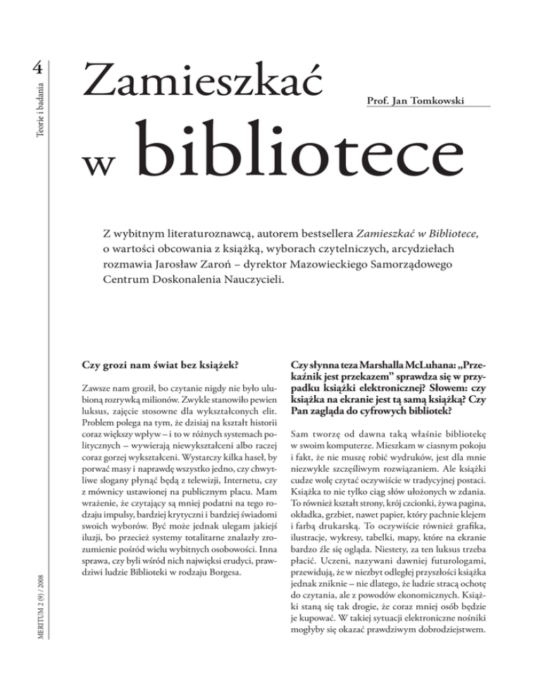 Teorie i badania Zamieszkać w Prof. Jan Tomkowski bibliotece Z wybitnym literaturoznawcą, autorem bestsellera Zamieszkać w Bibliotece, o wartości obcowania z książką, wyborach czytelniczych, arcydziełach rozmawia Jarosław Zaroń – dyrektor Mazowieckiego Samorządowego Centrum Doskonalenia Nauczycieli. MERITUM 2 (9) / 2008 Czy grozi nam świat bez książek? Zawsze nam groził, bo czytanie nigdy nie było ulubioną rozrywką milionów. Zwykle stanowiło pewien luksus, zajęcie stosowne dla wykształconych elit. Problem polega na tym, że dzisiaj na kształt historii coraz większy wpływ – i to w różnych systemach politycznych – wywierają niewykształceni albo raczej coraz gorzej wykształceni. Wystarczy kilka haseł, by porwać masy i naprawdę wszystko jedno, czy chwytliwe slogany płynąć będą z telewizji, Internetu, czy z mównicy ustawionej na publicznym placu. Mam wrażenie, że czytający są mniej podatni na tego rodzaju impulsy, bardziej krytyczni i bardziej świadomi swoich wyborów. Być może jednak ulegam jakiejś iluzji, bo przecież systemy totalitarne znalazły zrozumienie pośród wielu wybitnych osobowości. Inna sprawa, czy byli wśród nich najwięksi erudyci, prawdziwi ludzie Biblioteki w rodzaju Borgesa. Czy słynna teza Marshalla McLuhana: „Przekaźnik jest przekazem” sprawdza się w przypadku książki elektronicznej? Słowem: czy książka na ekranie jest tą samą książką? Czy Pan zagląda do cyfrowych bibliotek? Sam tworzę od dawna taką właśnie bibliotekę w swoim komputerze. Mieszkam w ciasnym pokoju i fakt, że nie muszę robić wydruków, jest dla mnie niezwykle szczęśliwym rozwiązaniem. Ale książki cudze wolę czytać oczywiście w tradycyjnej postaci. Książka to nie tylko ciąg słów ułożonych w zdania. To również kształt strony, krój czcionki, żywa pagina, okładka, grzbiet, nawet papier, który pachnie klejem i farbą drukarską. To oczywiście również grafika, ilustracje, wykresy, tabelki, mapy, które na ekranie bardzo źle się ogląda. Niestety, za ten luksus trzeba płacić. Uczeni, nazywani dawniej futurologami, przewidują, że w niezbyt odległej przyszłości książka jednak zniknie – nie dlatego, że ludzie stracą ochotę do czytania, ale z powodów ekonomicznych. Książki staną się tak drogie, że coraz mniej osób będzie je kupować. W takiej sytuacji elektroniczne nośniki mogłyby się okazać prawdziwym dobrodziejstwem. Jakimi kryteriami kierował się Pan, tworząc listę 20 książek – kanonu literatury współczesnej? Są to książki dla czytelnika żyjącego w XXI wieku, opublikowane w wieku XX, czyli taki spadek po odchodzącym stuleciu. Dlatego na mojej liście (opublikowanej w książce Zamieszkać w Bibliotece) nie ma Kafki, Céline`a ani Sołżenicyna. Pomyślałem – chyba nazbyt optymistycznie – że dwudziestowieczne koszmary może nie będą straszyły w następnym stuleciu? Są za to inni wielcy: Rilke, Proust, Joyce, Herbert, Eliot, Tomasz Mann… Każdy z tych autorów jest oczywiście postacią kluczową dla literatury XX wieku i ten fakt stanowił dla mnie najważniejsze kryterium. Z drugiej strony, z każdą z tych książek wiąże się jakaś oso- Teorie i badania W tej kwestii opinie są podzielone. Bibliotekarze, których spotykałem, mówili nieraz: lepiej, żeby ludzie czytali cokolwiek niż popadali w tak zwany wtórny analfabetyzm. Z drugiej strony, jeśli czytają tylko dlatego, że wypada znać modny bestseller, „książkę, którą kupiło 20 milionów Amerykanów”, książkę nagrodzoną w jakimś plebiscycie czy konkursie, wreszcie – książkę, o której dużo się mówi – to może lepiej, by poszli na spacer, pobiegali, zajęli się ogrodem, uporządkowali komputer, posłuchali muzyki, zastanowili się nad swoim życiem? Zawsze przerażało mnie wyznanie: „przeczytam coś dla zabicia czasu”. To zdumiewające, że chociaż czasu dano nam tak niewiele, niektórych stać na podobne marnotrawstwo. Stefan Żeromski, który jest autorem rzadko już dziś czytanym, napisał w swoich Dziennikach, że nie wolno zmarnować żadnej godziny! A przecież od czasów Żeromskiego przybyło wiele ważnych książek. Trzeba szanować swój czas. Mogę być jednak niesprawiedliwy, bo czytanie głośnych, ale marnych „pięciominutowych bestsellerów” nigdy mnie nie pociągało. Wolę czytać Dantego niż romans albo kryminał, choć mam również wielu wykształconych kolegów czytających od dawna wyłącznie gazety. bista historia. Czarodziejską górę czytałem jeszcze w szkole, w gorączce… Prousta podczas ciężkiej choroby, prawie na pożegnanie. Ziemię jałową – przed laty nie do kupienia – przepisałem odręcznie, najpiękniej jak umiałem. Elegie duinejskie towarzyszyły mi chyba przez całe życie. Wybrałem lektury z tak zwanej literatury współczesnej, ale oczywiście każdy, kto zechce po nie sięgnąć, powinien poznać również arcydzieła klasyczne. Biblia, Dante, Szekspir, Goethe, Dostojewski, Flaubert – bez znajomości Odysei czy Don Kichota nie ma klucza do kultury. Stajemy – jak ów Rosjanin z epoki Chruszczowa – przed obrazem wielkiego mistrza. Wychowani jak należy, to znaczy w duchu wojującego ateizmu, pytamy bezradni: mały strzela z procy do dużego? Co to może znaczyć? Jaki Pana zdaniem powinien być klucz do tworzenia szkolnego kanonu lektur? Czy możemy dalej upierać się w proponowaniu naszym uczniom obszernych powieści Sienkiewicza, Orzeszkowej, Kossak-Szczuckiej? Jaką funkcję ów kanon powinien spełniać? Myślę, że listy szkolnych lektur nie powinni tworzyć politycy ani ludzie, dla których polityka ważniejsza jest od literatury i edukacji. Przyjęło się sądzić, że obecność w szkolnych programach, to dla pisarza swego rodzaju nobilitacja. Jeśli dotyczy to autora żyjącego, to może on liczyć na wysokie nakłady i zwiększone honoraria. W pozostałych przypadkach zarabia głównie