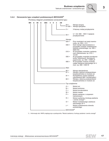 Budowa urządzenia Tabliczki znamionowe i oznaczenia typu 3.4.4 3 Oznaczenie typu urządzeĔ podstawowych MOVIAXIS® PoniĪszy diagram przedstawia oznaczenie typu: MX A 80 A -004 5 0 3 - 00 00 = Wersja seryjna 01-99 = Wersja specjalna 3= 3-fazowy rodzaj przyáączenia 50 = U = AC 380 – 500 V napiĊcie przyáączeniowe Wersje: 004 = Przy moduáach osi prąd znamionowy, np. 004 = 4 A 050 = IloĞü energii odprowadzana w przypadku moduáu rozáadowania obwodu poĞredniego, np. 050 = 5000 Ws W przypadku moduáów zasilania 010 = moc znamionowa, np. 010 = 10 kW W przypadku moduáów kondensa050 = torów, buforowych, táumiących pojemnoĞü, np. 050 = 5000 µF W przypadku moduáu rozdziel060 = czego zasilacza sieciowego 24 V moc, np. 060 = 600 W Stan 80 = 81 = 81 = 82 = Wersja standardowa Wersja z jednym przekaĨnikiem bezpieczeĔstwa w module osi Kompaktowy moduá zasilania (wbudowany BW i kondensator) Wersja z dwoma przekaĨnikami bezpieczeĔstwa w module osi Typ urządzenia: A= B= C= M= P= R= S= z= Moduá osi Moduá buforowy Moduá kondensatora Moduá master Moduá zasilania z czoperem hamulcowym Moduá zasilania z funkcją zasilania i zwrotu energii1) Moduá rozdzielczego zasilacza sieciowego 24 V Moduá rozáadowania obwodu poĞredniego MOVIAXIS® 1) Informacje dot. MXR znajdują siĊ w podrĊczniku "Moduá zasilania z funkcją zasilania i zwrotu energii" Instrukcja obsáugi – Wieloosiowe serwowzmacniacze MOVIAXIS® 17 3 Budowa urządzenia Tabliczki znamionowe i oznaczenia typu Oznaczenie typu moduáu osi MXA80A-004-503-00 = Moduá osi z prądem znamionowym 4 A Oznaczenie typu dodatkowego podzespoáu moduáu buforowego MXB80A-050-503-00 = Moduá buforowy o pojemnoĞci 5000 µF Oznaczenie typu dodatkowego podzespoáu moduáu kondensatora MXC80A-050-503-00 = Moduá kondensatora o pojemnoĞci 5000 µF Oznaczenie typu dodatkowego podzespoáu moduáu master z bramką fieldbus MXM80A-000-000-00/UFF41B MXM80A-000-000-00/UFR41B = = Moduá Master z PROFIBUS / DeviceNet Moduá Master z EtherNet/IP / PROFINET Modbus/TCP Oznaczenie typu dodatkowego podzespoáu moduáu master ze sterowaniem MXM80A-000-00000/DHF41B/OMH41B MXM80A-000-00000/DHR41B/OMH41B = Moduá Master z PROFIBUS / DeviceNet = Moduá Master z EtherNet/IP / PROFINET Modbus/TCP Wersje: T0 – T25 Oznaczenie typu moduáu zasilania: MXP81A-010-503-00 MXP80A-010-503-00 MXR80A-075-503-001) = = = Kompaktowy moduá zasilania 10 kW z wbudowanym C i BW Moduá zasilania 10 kW Moduá zasilania 50/75 kW z funkcją zasilania i zwrotu energii 1) Informacje dot. MXR znajdzują siĊ w podrĊczniku "Moduá zasilania z funkcją zasilania i zwrotu energii" Oznaczenie typu dodatkowego podzespoáu – moduáu rozdzielczego zasilacza sieciowego 24 V MXS80A-060-503-00 = Moduá rozdzielczego zasilacza sieciowego 24 V Oznaczenie typu dodatkowego podzespoáu moduáu rozáadowania obwodu poĞredniego MXZ80A-050-503-00 18 = Moduá rozáadowania obwodu poĞredniego z odprowadzaną iloĞcią energii 5000 Ws Instrukcja obsáugi – Wieloosiowe serwowzmacniacze MOVIAXIS® Budowa urządzenia Tabliczki znamionowe i oznaczenia typu 3.4.5 3 Oznaczenie typu opcjonalnych podzespoáów MOVIAXIS® PoniĪszy diagram przedstawia oznaczenie typu: X _ _ 11 A Stan Stan wersji Wersja: GH, GS= FP = FA = FE = SE = IO = IA = Karta multienkodera Záącze fieldbus PROFIBUS DP V1 Záącze fieldbus K-Net Záącze fieldbus EtherCAT® Magistrala Systembus kompatybilna z EtherCAT® Karta wejĞcia/wyjĞcia Karta wejĞcia/wyjĞcia Opcjonalny podzespóá dla MOVIAXIS® Instrukcja obsáugi – Wieloosiowe serwowzmacniacze MOVIAXIS® 19