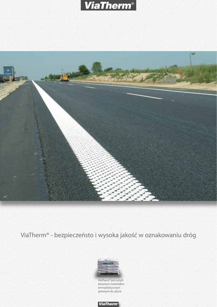 ViaTherm® - bezpieczeństo i wysoka jakość w oznakowaniu dróg ViaTherm® jest certyfikowanym materiałem termoplastycznym gotowym do użycia www.lkf.dk ViaTherm® jest certyfikowanym materiałem termoplastycznym o doskonałych parametrach i wysokiej trwałości ViaTherm® jest certyfikowanym materiałem termoplastycznym nowej generacji, o szerokim spektrum zastosowań w zakresie poziomego oznakowania dróg: standardowego, specjalnego i strukturalnego. Opakowanie jest dodawane bezpośrednio do kotła jako spoiwo, a zastosowane pigmenty organiczne nie są szkodliwe dla środowiska. Poprzez lata Geveko stało się silnym i doświadczonym partnerem dla firm przemysłu oznakowania drogowego. Obecnie oferujemy idealny typ materiału termoplastycznego ViaTherm®, który jest w stanie spełnić najwyższe wymagania . Nasze produkty są rezultatem wieloletniego doświadczenia naszego i naszych klientów, wykonujacych oznakowanie na całym swiecie. Materiał Termoplastyczny ViaTherm® charakteryzuje się dużą wydajnością i trwałością, jest produktem gotowym do użycia bez potrzeby dodawania domieszek innych substancji chemicznych w celu utwardzenia. ViaTherm® szybko uzyskuje przejezdność po aplikacji, skracając tym samym do minimum zakłócenia w ruchu drogowym. Produkty ViaTherm® może być stosowany w maszynach z butem ciągnionym, z ekstruderem, z natryskiem albo do ręcznej aplikacji. ViaTherm® jest dostępny w blokach lub workach. 1. Bloki 31.25 kg – 32 szt. na palecie. 2. Worki 20.00 kg – 54 szt. na palecie. Same worki stanowią jeden ze składników spoiwa ViaTherm® i są dodawane bezpośrednio do kotła. ViaTherm® doskonale nadaje się do oznakowań drogowych typu I i II. Typ I: ViaTherm® jest zaprojektowany dla oznakowania typu I. Powierzchniowe mikrokulki szklane oraz mikrokulki zatopione w masie termoplastycznej gwarantują podwyższoną widzialność w nocy. Typ II: Poprzez intensywne i kompleksowe badania, stworzyliśmy ViaTherm® dedykowany dla oznakowania specjalnego i strukturalnego. Oznakowanie to zwiększa bezpieczeństwo ruchu drogowego i zapewnia bardzo dobrą widzialność w nocy, nawet w podczas deszczu. Oznakowanie zaprojektowane jest tak, że woda spływa z niego, a duże mikrokulki rozbijają film wodny. Nasz Wydział Badań i Rozwoju wciąż pracuje nad ulepszaniem i wytwarzaniem nowych rodzajów ViaTherm® odpowiednich dla różnych typów nawierzchni i zróżnicowanych warunków pogodowych. ViaTherm® jest stosowany do apliakcji oznakowania standardowego i specjalnego. ViaTherm® jest dostępny w workach i blokach w sześciu standardowych kolorach. Opakowania są dodawane do kotła jako składnik spoiwa - bez zanieczyszczania środowiska. ViaTherm® ma szerokie zastosowanie przy oznakowaniu specjalnym i strukturalnym, w tym przypadku w systemie ViziSpot® Oto przykład aplikacji ViaTherm® w systemie strukturalnym nieregularnym. Metoda Combiline łączy linię ciągłą z systemem ViziSpot® Aplikacja ViaTherm® jako MultiDotLine® Wytrzymałość materiału ViaTherm® sprawia, że jest idealny na ruchliwe drogi całego świata. ViaTherm® spełnia wymagania stawiane przez instytuty certyfikacji takie jak IBDiM, BAST, ATG i Kiwa Kolory i środowisko ViaTherm® jest dostępny w standardowych kolorach, stosowanych na drogach, takich jak : biały, niebieski, czerwony, żółty i zielony. Pozostałe kolory są również dostepne na zamówienie. Pigmeny organiczne i wszystkie pozostałe składniki stosowane do produkcji ViaTherm® nie są szkodliwe dla środowiska. Kompetencje i certyfikaty Głównym elementem naszej polityki jakości jest certyfikat ISO 9001. Ponadto, ze wzgledu na to, że ViaTherm® został przetestowany i zaaprobowany przez miedzynarodowe Instytuty Badawcze, stosowany jest w wielu krajach na całym świecie. ViaTherm® posiada certyfikaty w takich krajach jak Polska (IBDiM), Belgia (ATG), Francja (NF), Niemcy (BASt), Holandia (KIWA), Republika Czeska, Bułgaria i Islandia. Nasze nowoczesne, elastyczne zaplecze produkcyjne w połączeniu z badaniami laboratorium badawczorozwojowego pozwalają nam utrzymać posiadane certyfikaty oraz pozyskiwać nowe. Wysiłki naszego laboratorium oraz zaawansowanie lini produkcyjnych zapewniają ciagłe podnoszenie jakości oraz powstawania nowych, wysoko zaawansowanych produktów. Wysoką jakość naszych produktów osiągamy poprzez jednolity proces produkcji, częste kontrole jakości i niezliczone testy drogowe. ViaTherm® jest dostępny w standardowych kolorach RAL : żóltym, czerwonym, zielonym, niebieskim, białym i czarnym, a inne kolory są równiez dostępne na zamówienie. www.SvendborgTryk.dk · 03.2010 541 2 - 07 Przedstawiciel: Longelsevej 34 • Sdr. Longelse • DK-5900 Rudkøbing • Tel: +45 63 51 71 71 • Fax: +45 63 51 71 72 • E-mail: [email protected] www.viatherm.com Printed Matter Produktywność i dostawa Każdego roku , Geveko produkuje i dostarcza tysiące ton masy termoplastycznej na kilkanaście rynków na całym swiecie. Nasz elastyczny proces produkcyjny i obszerne magazyny zapewniają klientom sprawne przetwarzanie zamówień i krótki czas dostawy. Obecnie, produkujemy ponad 50 różnych typów ViaTherm®, każdy dostosowany do potrzeb naszych klientów. Zapraszamy do współpracy!