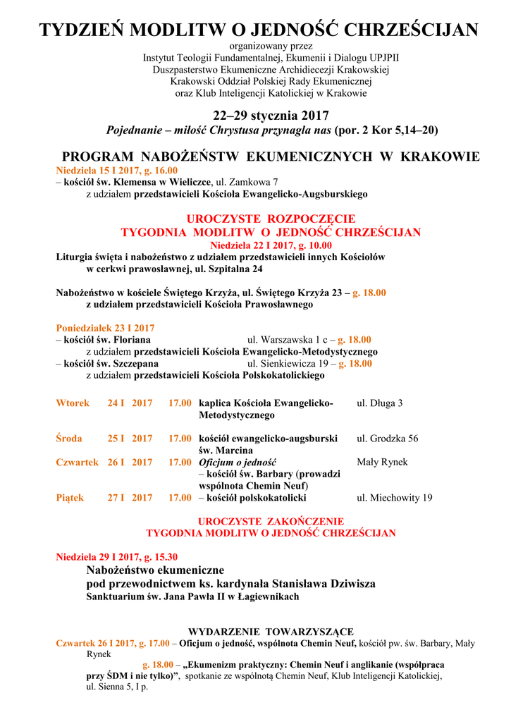 TYDZIEŃ MODLITW O JEDNOŚĆ CHRZEŚCIJAN organizowany przez Instytut Teologii Fundamentalnej, Ekumenii i Dialogu UPJPII Duszpasterstwo Ekumeniczne Archidiecezji Krakowskiej Krakowski Oddział Polskiej Rady Ekumenicznej oraz Klub Inteligencji Katolickiej w Krakowie 22–29 stycznia 2017 Pojednanie – miłość Chrystusa przynagla nas (por. 2 Kor 5,14–20) PROGRAM NABOŻEŃSTW EKUMENICZNYCH W KRAKOWIE Niedziela 15 I 2017, g. 16.00 – kościół św. Klemensa w Wieliczce, ul. Zamkowa 7 z udziałem przedstawicieli Kościoła Ewangelicko-Augsburskiego UROCZYSTE ROZPOCZĘCIE TYGODNIA MODLITW O JEDNOŚĆ CHRZEŚCIJAN Niedziela 22 I 2017, g. 10.00 Liturgia święta i nabożeństwo z udziałem przedstawicieli innych Kościołów w cerkwi prawosławnej, ul. Szpitalna 24 Nabożeństwo w kościele Świętego Krzyża, ul. Świętego Krzyża 23 – g. 18.00 z udziałem przedstawicieli Kościoła Prawosławnego Poniedziałek 23 I 2017 – kościół św. Floriana ul. Warszawska 1 c – g. 18.00 z udziałem przedstawicieli Kościoła Ewangelicko-Metodystycznego – kościół św. Szczepana ul. Sienkiewicza 19 – g. 18.00 z udziałem przedstawicieli Kościoła Polskokatolickiego Wtorek 24 I 2017 17.00 kaplica Kościoła EwangelickoMetodystycznego ul. Długa 3 Środa 25 I 2017 17.00 kościół ewangelicko-augsburski św. Marcina 17.00 Oficjum o jedność – kościół św. Barbary (prowadzi wspólnota Chemin Neuf) 17.00 – kościół polskokatolicki ul. Grodzka 56 Czwartek 26 I 2017 Piątek 27 I 2017 Mały Rynek ul. Miechowity 19 UROCZYSTE ZAKOŃCZENIE TYGODNIA MODLITW O JEDNOŚĆ CHRZEŚCIJAN Niedziela 29 I 2017, g. 15.30 Nabożeństwo ekumeniczne pod przewodnictwem ks. kardynała Stanisława Dziwisza Sanktuarium św. Jana Pawła II w Łagiewnikach WYDARZENIE TOWARZYSZĄCE Czwartek 26 I 2017, g. 17.00 – Oficjum o jedność, wspólnota Chemin Neuf, kościół pw. św. Barbary, Mały Rynek g. 18.00 – „Ekumenizm praktyczny: Chemin Neuf i anglikanie (współpraca przy ŚDM i nie tylko)”, spotkanie ze wspólnotą Chemin Neuf, Klub Inteligencji Katolickiej, ul. Sienna 5, I p.