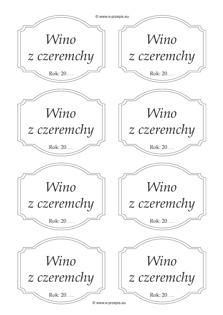 © www.e-przepis.eu Wino z czeremchy Wino z czeremchy Rok: 20.............. Rok: 20.............. Wino z czeremchy Wino z czeremchy Rok: 20.............. Rok: 20.............. Wino z czeremchy Wino z czeremchy Rok: 20.............. Rok: 20.............. Wino z czeremchy Wino z czeremchy Rok: 20.............. Rok: 20.............. © www.e-przepis.eu