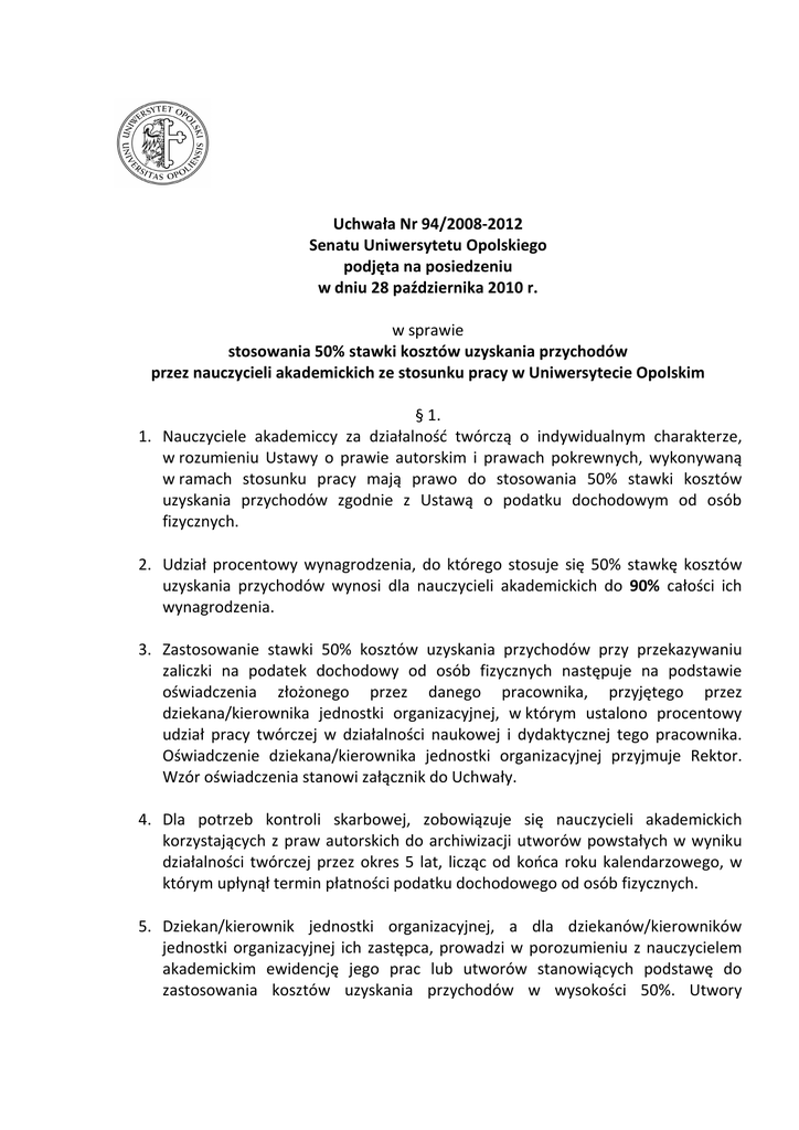 Uchwała Nr 94/2008-2012 Senatu Uniwersytetu Opolskiego podjęta na posiedzeniu w dniu 28 października 2010 r. w sprawie stosowania 50% stawki kosztów uzyskania przychodów przez nauczycieli akademickich ze stosunku pracy w Uniwersytecie Opolskim § 1. 1. Nauczyciele akademiccy za działalność twórczą o indywidualnym charakterze, w rozumieniu Ustawy o prawie autorskim i prawach pokrewnych, wykonywaną w ramach stosunku pracy mają prawo do stosowania 50% stawki kosztów uzyskania przychodów zgodnie z Ustawą o podatku dochodowym od osób fizycznych. 2. Udział procentowy wynagrodzenia, do którego stosuje się 50% stawkę kosztów uzyskania przychodów wynosi dla nauczycieli akademickich do 90% całości ich wynagrodzenia. 3. Zastosowanie stawki 50% kosztów uzyskania przychodów przy przekazywaniu zaliczki na podatek dochodowy od osób fizycznych następuje na podstawie oświadczenia złożonego przez danego pracownika, przyjętego przez dziekana/kierownika jednostki organizacyjnej, w którym ustalono procentowy udział pracy twórczej w działalności naukowej i dydaktycznej tego pracownika. Oświadczenie dziekana/kierownika jednostki organizacyjnej przyjmuje Rektor. Wzór oświadczenia stanowi załącznik do Uchwały. 4. Dla potrzeb kontroli skarbowej, zobowiązuje się nauczycieli akademickich korzystających z praw autorskich do archiwizacji utworów powstałych w wyniku działalności twórczej przez okres 5 lat, licząc od końca roku kalendarzowego, w którym upłynął termin płatności podatku dochodowego od osób fizycznych. 5. Dziekan/kierownik jednostki organizacyjnej, a dla dziekanów/kierowników jednostki organizacyjnej ich zastępca, prowadzi w porozumieniu z nauczycielem akademickim ewidencję jego prac lub utworów stanowiących podstawę do zastosowania kosztów uzyskania przychodów w wysokości 50%. Utwory wykazane w ewidencji są przechowywane w jednostce organizacyjnej zatrudniającej nauczyciela akademickiego. 6. Dziekan/kierownik jednostki organizacyjnej i odpowiednio jego zastępca jest zobowiązany do bieżącego monitorowania zgodności treści złożonego oświadczenia z ewidencją, o której mowa w ust. 5., dokonywania na bieżąco korekt oświadczeń w przypadku stwierdzenia niezgodności oraz informowania o tym Kwestury. § 2. 1. Warunkiem zastosowania stawki 50% kosztów uzyskania przychodu z tytułu korzystania z praw autorskich jest złożenie przez nauczyciela akademickiego, najpóźniej do dnia 5 grudnia roku poprzedzającego rok podatkowy, oświadczenia według załączonego do Uchwały wzoru. Nauczycielom akademickim, którzy nie złożą w terminie oświadczenia, zaliczka na podatek dochodowy zostanie naliczona bez uwzględnienia 50% kosztów uzyskania przychodu. 2. W przypadku zmiany w otrzymywanym wynagrodzeniu udziału procentowego honorarium za pracę twórczą w rozumieniu prawa autorskiego, nauczyciel akademicki obowiązany jest złożyć nowe oświadczenie, o którym mowa w ust. 1, najpóźniej do piątego dnia miesiąca poprzedzającego miesiąc, od którego zmiana ta ma obowiązywać. § 3. 1. Za wynagrodzenie, o którym mowa w § 1 ust. 2 uznaje się: a) wynagrodzenie zasadnicze; b) wynagrodzenie za godziny ponadwymiarowe; c) wynagrodzenie za płatny urlop dla celów naukowych, jeśli w czasie jego trwania powstanie utwór w rozumieniu ustawy o prawie autorskim i prawach pokrewnych; d) wynagrodzenie za płatny urlop naukowy na przygotowanie rozprawy doktorskiej lub habilitacyjnej. 2. Nie stosuje się 50% stawki kosztów uzyskania przychodu do wynagrodzeń wypłacanych m. in. za okres: a) urlopu wypoczynkowego – wynagrodzenie wypłacane za miesiąc sierpień każdego roku; b) urlopu dla poratowania zdrowia; c) urlopu wychowawczego; d) zwolnienia lekarskiego; e) innej usprawiedliwionej nieobecności w pracy przewidzianej przepisami prawa, za którą pracownik otrzymuje wynagrodzenia (m.in. macierzyńskie). § 4. W całości objęte 50% stawką kosztów uzyskania przychodów jest: a) wynagrodzenie za recenzję rozprawy doktorskiej i habilitacyjnej oraz w postępowaniu o nadanie tytułu naukowego profesora, a także za opracowanie oceny dorobku naukowego, dydaktycznego i organizacyjnego w postępowaniu kwalifikacyjnym poprzedzającym zatrudnienie na stanowisku profesora zwyczajnego lub nadzwyczajnego; b) dodatek specjalny do wynagrodzenia, jeśli został przyznany w związku z realizacją pracy, w wyniku, której powstał lub powstanie utwór w rozumieniu ustawy o prawie autorskim i prawach pokrewnych; c) zwiększone wynagrodzenie wypłacane na podstawie art. 151 ust. 8 ustawy Prawo o szkolnictwie wyższym, jeżeli zostało przyznane w związku z realizacją pracy, w wyniku której powstał lub powstanie utwór w rozumieniu ustawy o prawie autorskim i prawach pokrewnych. § 5. Przedmiotem prawa autorskiego jest każdy przejaw działalności twórczej o indywidualnym charakterze, ustalony w jakiejkolwiek postaci, niezależnie od wartości, przeznaczenia i sposobu wyrażenia, a w szczególności: a) wszelkie formy indywidualnej prezentacji odkryć oraz metod i wyników badań naukowych; b) publikacje naukowe, dydaktyczne i popularnonaukowe; c) opinie i ekspertyzy naukowe; d) referaty i koreferaty; e) projekty prac naukowo-badawczych; f) raporty i sprawozdania naukowe; g) recenzje; h) konspekty zajęć dydaktycznych; i) programy nauczania; j) opracowania metod nauczania; k) pomocnicze materiały dla studentów (komentarze, konspekty, szkice, materiały multimedialne, prezentacje multimedialne – w tym filmy, streszczenia, wybory, analogie, tłumaczenia urywków i wyjątków literatury obcej, wyciągi z literatury), jeżeli posiadają cechy określone w § 1 ust. 1; l) zajęcia dydaktyczne – o objęciu ochroną prawno-autorską zajęć dydaktycznych decyduje oryginalność i indywidualność m.in. formy, układu, wyboru materiału lub sposobu, w którym wykład, seminarium zostają przedstawione słuchaczom; m) inne prace twórcze z