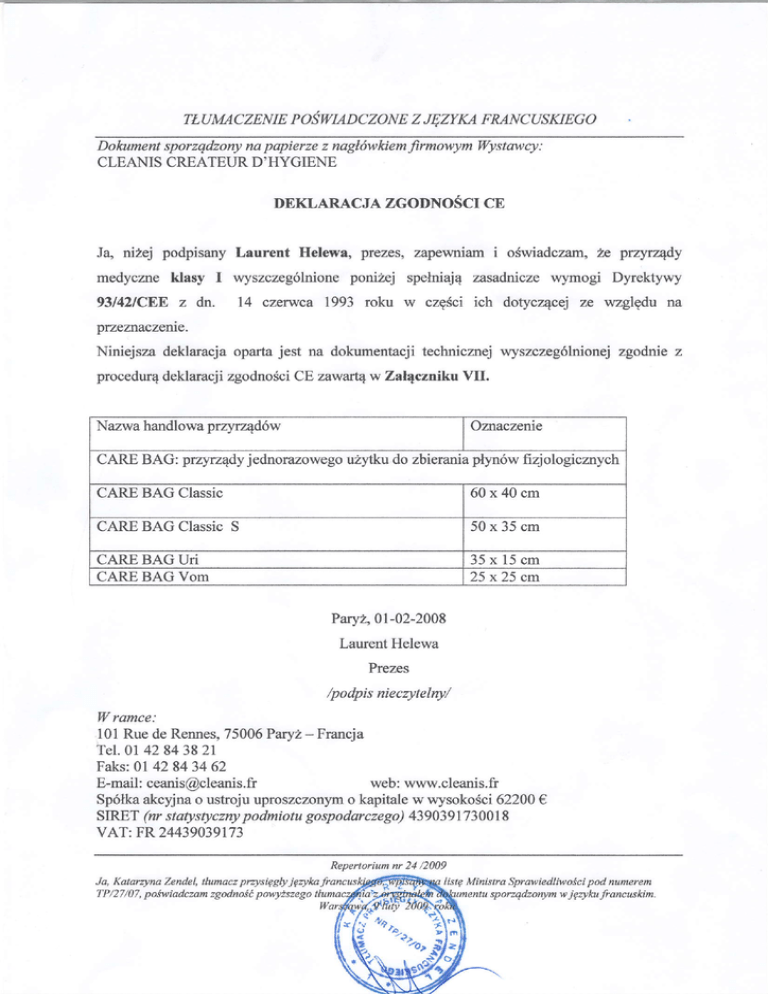 TT,UMACZENIEPOSW'IADCZONE Z JEZYKAFMNC USKIEGO Dolatmentsporzqdzonynapapierzez nagl6wkiemJirmowym Wystawcy: CLEANIS CREATEURD'HYGIENE DEKLARACJA ZGODNOSCI CE Ja nzej podpisany Laurent Helewa, prezes, zapewniam i odwiadczarfl,ze przyn4dy medyczne klasy I wyszczeg6lnioneponizej spelniaj4 zasadniczewymogi Dyrektywy 93l42lC&E z dn. 14 czenvca 1993 roku w czg6ci ich dotyczqcej ze wzglgdu na przeznaczerie. Niniejsza deklaracja opartajest na dokumentacjitechnicmej wyszczeg6lnionejzgodnie z procedur4deklaracjizgodno6ciCE zawart4w T,al4cznikuVII. Nazwahandlowapr zyz4d6w Oznaczente CARE BAG: pnynqdy jednorazowegouzytku do zbieraniaplyn6w fizjologicznych CARE BAG Classic 60x40cm CARE BAG Classic S 50x35cm CAREBAGUTi CAREBAGVoM 35x15cm 25 x25 cm PNyz,01-02-2008 LaurentHelewa Prezes /podpisnieczytelny/ Wramce: 101RuedeRennes,75006Paryz- Francja Tel.0l 42 84 38 21 Faks:0l 42 84 34 62 web: www.cleanis.fr E-mail: [email protected] Sp6lkaakcyjnao ustroju uproszczonymo kapitalew wysokoSci62200€ podmiotugospodarczego)439039173001 SIRET (nr statystyczny 8 VAT: FR 24439039173 Ja, KatarzynaZendel,ttundczpr4siegty jezyka TP/27/07,poiwiadczamzgodnoit povy2szego Repertoriurnnr 24 /2009 listg Ministr(r Sprawiedliwoicipod numerem sporzqdzokymwjgzyhr francuskim.