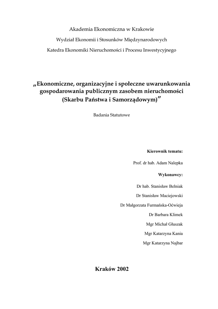 Akademia Ekonomiczna w Krakowie Wydział Ekonomii i Stosunków Międzynarodowych Katedra Ekonomiki Nieruchomości i Procesu Inwestycyjnego „Ekonomiczne, organizacyjne i społeczne uwarunkowania gospodarowania publicznym zasobem nieruchomości (Skarbu Państwa i Samorządowym)” Badania Statutowe Kierownik tematu: Prof. dr hab. Adam Nalepka Wykonawcy: Dr hab. Stanisław Belniak Dr Stanisław Maciejowski Dr Małgorzata Furmańska-Oćwieja Dr Barbara Klimek Mgr Michał Głuszak Mgr Katarzyna Kania Mgr Katarzyna Najbar Kraków 2002 Spis treści: Rozdział 1. Istota i funkcje nieruchomości .....................................................................................................3 1.1 Podstawowe aspekty określania i pojmowania kategorii „nieruchomość” ..............................................3 1.2 Klasyfikacja rodzajowa nieruchomości ...................................................................................................3 1.3 Zakres funkcjonalny gospodarowania nieruchomością............................................................................8 1.4 Uwarunkowania gospodarowania nieruchomościami............................................................................14 Rozdział 2. Klasyfikacja podmiotowa nieruchomości w Polsce ..................................................................16 2.1 Uwarunkowania prawne klasyfikacji podmiotowej nieruchomości w Polsce........................................16 2.2 Zasób nieruchomości Skarbu Państwa...................................................................................................20 2.3 Zasób nieruchomości samorządu terytorialnego ....................................................................................30 2.3.1 Gminny zasób nieruchomości..........................................................................................................30 2.3.2 Zasoby nieruchomości powiatów i województw ..............................................................................33 Rozdział 3. Analiza gospodarowania zasobem nieruchomości Skarbu Państwa ......................................36 3.1 Klasyfikacja rodzajowa zasobu nieruchomości Skarbu Państwa ...........................................................36 3.2 Cele i zasady gospodarowania zasobem Skarbu Państwa ......................................................................39 3.3 Organy Skarbu Państwa a obrót skarbowym zasobem nieruchomości ..................................................41 3.4 Zakres funkcjonalny gospodarowania nieruchomościami Skarbu Państwa ...........................................43 Rozdział 4. Gospodarowanie zasobem nieruchomości przedsiębiorstw państwowych.............................54 4.1 Charakterystyka przedsiębiorstw państwowych i ich liczba ..................................................................54 4.2 Klasyfikacja rodzajowa zasobu nieruchomości przedsiębiorstw państwowych.....................................60 4.3 Strategie przedsiębiorstwa a kierunki działań związane z gospodarowaniem nieruchomościami .........66 4.4 Kierunki i sposoby wykorzystania nieruchomości.................................................................................71 4.4.1 Dysponowanie majątkiem przedsiębiorstwa przez organ założycielski...........................................71 4.4.2 Gospodarowanie majątkiem przez organy zarządzające przedsiębiorstwem ..................................81 Rozdział 5. Gospodarowanie Zasobem Własności Rolnej Skarbu Państwa ..............................................87 5.1 Podstawy prawne powstania i organizacji Agencji Własności Rolnej Skarbu Państwa (AWRSP) .......87 5.2 Źródła i struktura nieruchomości Zasobu Własności Rolnej Skarbu Państwa ......................................91 5.3 Sposoby zagospodarowania przejętego mienia przez AWRSP.............................................................96 5.3.1 Sprzedaż nieruchomości. ................................................................................................................97 5.3.2 Oddawanie w najem i dzierżawę ..................................................................................................101 5.3.3 Nieodpłatne przekazywanie ..........................................................................................................104 5.3.4 Inne sposoby zagospodarowania nieruchomości ZWRSP ............................................................106 5.4 Spełnianie innych zadań przez AWRS................................................................................................107 5.4.1 Spłata zobowiązań byłych ppgr ....................................................................................................107 5.4.2 Rozwiązywanie problemów społecznych byłych pracowników pgr ..............................................108 5.4.3 Sprawowanie nadzoru właścicielskiego .......................................................................................109 5.4.4 Działania w zakresie ochrony środowiska ...................................................................................109 5.5 Zasadność dalszego istnienia Agencji Własności rolnej Skarbu Państwa..........................................110 Rozdział 6. Agencja Mienia Wojskowego (AMW) jako zarządca nieruchomości. .................................113 6.1 Podstawy prawne powstania i organizacja AMW................................................................................113 6.2 Źródła i struktura rodzajowa zasobu nieruchomości AMW.................................................................119 6.3 Sposoby zagospodarowania nieruchomości przez AMW ....................................................................124 6.4 Ekonomiczne i społeczne aspekty gospodarowania nieruchomościami AMW ...................................128 1