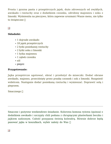 Prosta i pyszna pasta z przepiórczych jajek, dużo zdrowszych od zwykłych, awokado i rzeżuchy oraz z dodatkiem czosnku, odrobiny majonezu i soku z limonki. Wyśmienita na pieczywo, która zapewne urozmaici Wasze menu, nie tylko to świąteczne Składniki: 1 dojrzałe awokado 18 jajek przepiórczych 2 łyżki posiekanej rzeżuchy 2 łyżki soku z limonki 1 łyżka majonezu 1 ząbek czosnku sól pieprz Przygotowanie: Jajka przepiórcze ugotować, obrać i przełożyć do miseczki. Dodać obrane awokado, majonez, przeciśnięty przez praskę czosnek i sok z limonki. Rozgnieść widelcem. Następnie dodać posiekaną rzeżuchę i wymieszać. Doprawić solą i pieprzem. Smacznego Smaczne i pożywne weekendowe śniadanie. Kolorowa komosa ryżowa (quinoa) z dodatkiem awokado i szczypty chili podana z chrupiącymi plasterkami boczku i jajkiem sadzonym. Całość posypana świeżą kolendrą. Równie dobrze będą pasować jajka w koszulkach, wybór należy do Was Składniki: 50 g kolorowej komosy ryżowej 4 plasterki boczku 1/2 dojrzałego awokado 2 jajka 1 mała szalotka 1/2 ząbka czosnku (lub 1 malutki) 1 łyżeczka soku z limonki szczypta chili 1 łyżeczka oliwy z oliwek 1 łyżka posiekanej kolendry sól Przygotowanie: Komosę ryżową ugotować według przepisu na opakowaniu. Na patelni rozgrzać oliwę z oliwek, wrzucić drobniutko posiekaną szalotkę i czosnek. Zeszklić. Dodać ugotowaną komosę ryżową, chili, obrane i pokrojone w kosteczkę awokado i sok z limonki. Mieszając smażyć przez 1-2 minuty. Doprawić solą. Na oddzielnej patelni usmażyć z dwóch stron plasterki boczku. Wyjąć. Na tej samej patelni usmażyć jajka sadzone (doprawić solą i pieprzem) i przełożyć razem z boczkiem na komosę. Całość posypać świeżą kolendrą. Smacznego Sałatka z pokrojonym w kosteczkę awokado, chrupiącymi szparagami i krewetkami. Całość wymieszałam z serkiem „Apetina” i majonezem. Dodałam czosnek, odrobinę chili, soku z limonki i posypałam uprażonymi orzechami nerkowca. Tak powstała szybka sałatka, która nie tylko fajnie się prezentuje, ale również świetnie smakuje. Polecam Składniki na 2 porcje: 170 g krewetek (małych) 1 awokado 2 szparagi zielone 1/2 opakowania serka Pesto i rukola „Apetina” 1 łyżka majonezu 1 łyżka soku z limonki szczypta chili 1 mały ząbek czosnku 1 łyżka oliwy z oliwek 1 łyżka orzechów nerkowca sól Przygotowanie: Szparagi myjemy i odłamujemy, twarde końce. Gotujemy na parze lub w małej ilości lekko osolonej wody przez około 4 minuty. Wyjmujemy i kroimy na kawałki (około 2 cm). Krewetki rozmrażamy, osuszamy, jeżeli trzeba oczyszczamy. Na patelni rozgrzewamy oliwę z oliwek, wrzucamy krewetki, lekko solimy i smażymy. Awokado myjemy, osuszamy, przekrawamy na pół (wzdłuż), usuwamy pestkę i za pomocą łyżeczki wyjmujemy miąższ, uważając aby nie uszkodzić łupin. Miąższ kroimy w kosteczkę i przekładamy do miseczki. Dodajemy pokrojone szparagi, krewetki, serek, majonez, sok z limonki, przeciśnięty przez praskę czosnek i chili. Wszystko dokładnie mieszamy i doprawiamy solą. Gotową sałatką nadziewamy łupiny i posypujemy posiekanymi i uprażonymi na suchej patelni orzechami nerkowca. Smacznego Myślicie, że orzechy nerkowca nie pasują do jajecznicy? Nic bardziej mylnego. Uprażone w połączeniu z awokado i orzechowym aromatem beurre noisette wznoszą jajecznicę na wyższy poziom. Musicie spróbować Składniki: 4 duże jajka 1/2 dojrzałego awokado 2 pełne łyżki orzechów nerkowca 1 łyżka masła 1 łyżka beurre noisette natka pietruszki do dekoracji sól pieprz Przygotowanie: Orzechy nerkowca uprażyć na suchej patelni i utrzeć w moździerzu. Awokado przekroić wzdłuż na pół, wyjąć miąższ i pokroić w kostkę. Na patelnię włożyć masło, wbić jajka i dodać orzechy. Doprawić solą i pieprzem. Smażyć mieszając, aż jajka się zetną. Pod koniec smażenia dodać pokrojone awokado i ponownie wymieszać. Gotową jajecznicę przełożyć na talerz, posypać posiekaną natką pietruszki i polać odrobiną podgrzanego beurre noisette. Smacznego Guacamole to meksykańska salsa przyrządzona z awokado. Może być dodatkiem do tortilli, tacos lub do jakiegokolwiek meksykańskiego posiłku. Szybko się ją robi i świetnie smakuje. Składniki: 2 dojrzałe awokado sok z 1 limonki 2 ząbki czosnku sól pieprz Przygotowanie: Awokado obrać, rozgnieść widelcem lub zmiksować. Dodać sok z limonki i drobno pokrojony czosnek. Wymieszać i doprawić. Smacznego