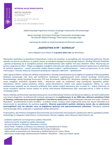 Zakład Socjologii Pogranicza Instytutu Socjologii Uniwersytetu Wrocławskiego oraz Sekcja Socjologii Etniczności Polskiego Towarzystwa Socjologicznego Wrocławski Oddział Polskiego Towarzystwa Socjologicznego zapraszają do udziału w międzynarodowej konferencji naukowej „SĄSIEDZTWA III RP – SŁOWACJA” która odbędzie się w dniach 1–2 grudnia 2016 roku we Wrocławiu. Wprawdzie sąsiedztwa są zjawiskiem temporalnym, trudno nie zauważyć, że porządkują one rzeczywistość społeczną. Chociaż sąsiedzi nie zawsze są widoczni, to jednak zawsze są nośnikami jakiegoś emocjonalnego ładunku. Według Richarda Grathoffa, „sąsiedzi przejawiają się w szczególnej postaci intersubiektywności jako najbliżsi Inni poza obrębem milieu. Wyznaczają oni granice i pogranicza milieu”. Mając na względzie rozległość materiału, jaki udaje się zebrać badaczom społecznym w odniesieniu do polskich pograniczy – owych pomostów między dwoma krajami i społeczeństwami – można przypuszczać, że nie mniej interesujące i treściwe okażą się rozważania poświęcone większym całościom – sąsiedztwom. Takie ujęcie problemu zachęca do refleksji nad pytaniem o sposoby praktykowania poszczególnych sąsiedztw III Rzeczpospolitej. Realizacji powyższego celu służy cykl konferencji naukowych, organizowanych przez Instytut Socjologii Uniwersytetu Wrocławskiego, Sekcję Socjologii Etniczności PTS oraz Wrocławski Oddział PTS. Wyrażamy nadzieję, że spotkania te obejmą swym zasięgiem wszystkich sąsiadów Polski – dotychczas udało się zrealizować sesje poświęcone sąsiedztwu polskolitewskiemu (2011), polsko-czeskiemu (2012), polsko-ukraińskiemu (2014) oraz polsko-rosyjskiemu (2015), na rynku wydawniczym pojawiły się zaś stosowne publikacje (tom polsko-rosyjski planowany jest na jesień b.r.; więcej informacji na temat wszystkich zbiorów można znaleźć na stronie internetowej Wydawnictwa Gajt: www.gajt.com.pl, a także na końcu niniejszego pliku). Mamy nadzieję zainteresować zaproponowaną przez nas problematyką możliwie szerokie grono badaczy, ale także publicystów oraz innych ekspertów i przedstawicieli instytucji zajmujących się współczesnym, tj. po 1989 roku, obliczem sąsiedztwa Polski ze Słowacją, widzianym przez pryzmat zagadnień o charakterze społecznym. Naszą ambicją jest zebranie tych osób – Polaków, Słowaków i przedstawicieli innych narodów – w jednym czasie i miejscu celem wygłoszenia przez nich swych referatów oraz dostarczenie im sposobności do wymiany poglądów. Wzorem poprzednich spotkań, dołożymy starań, aby na zakończenie poszczególnych sesji nie zabrakło czasu na pogłębione dyskusje nad zaprezentowanymi referatami. Planujemy wydanie recenzowanego zbioru artykułów o sąsiedztwie polsko-słowackim. Proponujemy, aby Państwa wystąpienia koncentrowały się na kwestiach stanowiących o społecznym obliczu sąsiedztwa polskosłowackiego w mijającym ćwierćwieczu. Prezentowane referaty mogłyby zatem dotyczyć takich kwestii, jak: - problemy społeczne na transgraniczu polsko-słowackim; - społeczny wymiar współpracy polsko-słowackiej; - sytuacja Polaków na Słowacji i Słowaków w Polsce; - obraz Polski i Polaków na Słowacji oraz Słowacji i jej mieszkańców w Polsce; - sąsiedztwo polsko-słowackie w kontekście idei Europy Środkowej; - wątki polskie w słowackiej oraz słowackie w polskiej literaturze, sztuce, filmie; - płaszczyzny wzajemnego zainteresowania Polaków i Słowaków – sobą oraz krajem sąsiad Na końcu niniejszego załącznika znajdują się spisy treści tomów z cyklu Sąsiedztwa III RP, które ukazały się dotychczas. Mamy nadzieję, że również one pozwolą Państwu zorientować się w bogactwie tematyki składającej się na interesujące nas zagadnienie społecznego oblicza polskich sąsiedztw. Patronat naukowy konferencji: prof. Zbigniew Kurcz Organizatorzy konferencji: dr hab. Julita Makaro, dr Marcin Dębicki Sekretarz naukowy konferencji: dr Kamilla Dolińska Językami konferencji są język polski i angielski. Opłata konferencyjna wynosi 350 zł (dla doktorantów – 250 zł) i obejmuje: obiady (1 i 2 XII), napoje podczas konferencji, wieczorny spacer po Wrocławiu z przewodnikiem lub zwiedzanie wybranych obiektów Muzeum UWr (1 XII), publikację artykułu w tomie pokonferencyjnym (po przejściu procesu recenzyjnego). Organizatorzy nie pośredniczą w rezerwacji noclegów. Zgłoszenia tematów wystąpień 15 października 2016 roku na adres: Uniwersytet Wrocławski ul. Koszarowa 3, 51-149 Wrocław lub na adres e-mail: [email protected] oraz abstrakt (maks. 1000 znaków) prosimy wysyłać do O akceptacji referatu poinformujemy do 20 października 2016 roku. Karta zgłoszenia oraz inne informacje o konferencji znajdują się na: http://www.socjologia.uni.wroc.pl w zakładce: działalność naukowa Opłatę konferencyjną należy uiścić do 10 listopada 2016 roku na konto: Wydział Nauk Społecznych Uniwersytetu Wrocławskiego ul. Koszarowa 3, 51-149 Wrocław przelew w złotówkach – BZ WBK S.A. 4 O/Wrocław, ul. Kuźnicza 17/19, 50-950 Wrocław nr: 09 1090 2503 0000 0001 1110 6022 przelew w euro – BZ WBK S.A. 1 O/Wrocław, ul. Rynek 9/11, 50-950 Wrocław nr: PL 56 1090 2398 0000 0001 1108 0646 Kod Swift: WBK PPL PP W tytule przelewu prosimy wpisać: „Sąsiedztwa – Słowacja” Recenzja: prof. Władysław Misiak Marcin Dębicki, Julita Makaro, Dwie dekady sąsiedztwa polsko-litewskiego – kluczowe kwestie. Wprowadzenie (s. 8–40) Marcin Dębicki, Skojarzenia Polaków z Litwą i Litwinami. Materiały do hipotetycznego ujęcia problemu (s. 41–65) Irena Wolska-Zogata, Sąsiedztwo polsko-litewskie. Analiza portali internetowych poświęconych Kresom (s. 66–76) Bożena Domagała, Stosunki polsko-litewskie w dyskursie publicznym na przykładzie Wspólnoty Kulturowej „Borussia” w Olsztynie oraz Ośrodka „Pogranicze – Sztuk, Kult