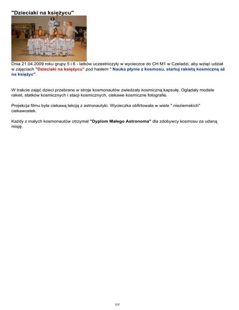 "Dzieciaki na księżycu" Dnia 21.04.2009 roku grupy 5 i 6 - latków uczestniczyły w wycieczce do CH M1 w Czeladzi, aby wziąć udział w zajęciach "Dzieciaki na księżycu" pod hasłem " Nauka płynie z kosmosu, startuj rakietą kosmiczną aż na księżyc". W trakcie zajęć dzieci przebrane w stroje kosmonautów zwiedzały kosmiczną kapsułę. Oglądały modele rakiet, statków kosmicznych i stacji kosmicznych, ciekawe kosmiczne fotografie. Projekcja filmu była ciekawą lekcją z astronautyki. Wycieczka obfirtowała w wiele " nieziemskich" ciekawostek. Każdy z małych kosmonautów otrzymał "Dyplom Małego Astronoma" dla zdobywcy kosmosu za udaną misję. 1/1