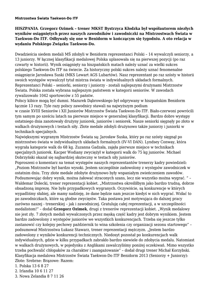 Mistrzostwa Świata Taekwon-Do ITF HISZPANIA. Grzegorz Ozimek – trener MKST Bystrzyca Kłodzka był współautorem niezłych wyników osiągniętych przez naszych zawodników i zawodniczki na Mistrzostwach Świata w Taekwon-Do ITF. Odbywały się one w Benidorm w kończącym się tygodniu. A oto relacja w wydaniu Polskiego Związku Taekwon-Do. Dwadzieścia siedem medali MŚ zdobyli w Benidorm reprezentanci Polski – 14 wywalczyli seniorzy, a 13 juniorzy. W łącznej klasyfikacji medalowej Polska uplasowała się na pierwszej pozycji (po raz czwarty w historii). Wynik osiągnięty na hiszpańskich matach należy uznać za wielki sukces polskiego Taekwon-Do ITF na świecie. Za historyczny polski sukces należy uznać fenomenalne osiągnięcie Jarosława Suski (MKS Lewart AGS Lubartów). Nasz reprezentant po raz szósty w historii swoich występów wywalczył tytuł mistrza świata w indywidualnych układach formalnych. Reprezentanci Polski – seniorki, seniorzy i juniorzy - zostali najlepszymi drużynami Mistrzostw Świata. Polska została wybrana najlepszym państwem w kategorii seniorów. W zawodach rywalizowało 1042 sportowców z 55 państw. Polscy kibice mogą być dumni. Mazurek Dąbrowskiego był odgrywany w hiszpańskim Benidorm łącznie 13 razy. Tyle razy polscy zawodnicy stawali na najwyższym podium w czasie XVIII Seniorów i XII Juniorów Mistrzostw Świata Taekwon-Do ITF. Biało-czerwoni powrócili tym samym po sześciu latach na pierwsze miejsce w generalnej klasyfikacji. Bardzo dobre występy ostatniego dnia zanotowały drużyny juniorek, juniorów i seniorek. Nasze seniorki sięgnęły po złoto w walkach drużynowych i testach siły. Złote medale zdobyli drużynowo także juniorzy i juniorki w technikach specjalnych. Największymi wygranym Mistrzostw Świata są: Jarosław Suska, który po raz szósty sięgnął po mistrzostwo świata w indywidualnych układach formalnych (IV-VI DAN). Lyndsey Conway, która wygrała kategorie walk do 68 kg. Zuzanna Gadzała, zajęła pierwsze miejsce w technikach specjalnych juniorek. Kacper Wodiany zwyciężył w kategorii walk do 75 kg juniorów. Michael Dobrzyński okazał się najbardziej skuteczny w testach siły juniorów. Poproszeni o komentarz na temat występów naszych reprezentantów trenerzy kadry powiedzieli: „Poziom Mistrzostw był bardzo wysoki. Jestem szczególnie zadowolony z występów zawodniczek w ostatnim dniu. Trzy złote medale zdobyte drużynowo były wspaniałym zwieńczeniem zawodów. Podsumowując dobry wynik, można żałować straconych szans, lecz nie wszystko można wygrać. ” – Waldemar Dolecki, trener reprezentacji kobiet. „Mistrzostwa określiłbym jako bardzo trudną, dobrze obsadzoną imprezę. Nie było przypadkowych wygranych. Oczywiście, są konkurencje w których wypadliśmy słabiej, ale mamy nadzieję, że dane będzie nam jeszcze kiedyś w nich wygrać. Widać to po zawodniczkach, które są głodne zwycięstw. Taka postawa jest motywująca do dalszej pracy zarówno naszej - trenerskiej – jak i zawodniczej. Gratuluję całej reprezentacji, a w szczególności medalistom!” – dodał Grzegorz Ozimek, drugi z trenerów reprezentacji kobiet. „Wynik medalowy nie jest zły. 7 złotych medali wywalczonych przez męską część kadry jest dobrym wynikiem. Jestem bardzo zadowolony z występów juniorów we wszystkich konkurencjach. Trzeba się jeszcze tylko zastanowić czy kolejny pechowy październik to wina szkolenia czy organizacji sezonu startowego” – podsumował Mistrzostwa Łukasz Stawarz, trener reprezentacji mężczyzn. „Jestem bardzo zadowolony z wyników konkurencji technicznych. Niedosyt pozostał po konkurencjach walk indywidualnych, gdzie w kilku przypadkach zabrakło bardzo niewiele do zdobycia medalu. Natomiast w walkach drużynowych, w pojedynku z Anglikami zawalczyliśmy poniżej oczekiwań. Mimo wszystko trzeba pochwalić chłopaków za charakter i zaangażowanie” – dodał drugi trener Michał Korzybski. Klasyfikacja medalowa Mistrzostw Świata Taekwon-Do ITF Benidorm 2013 (Seniorzy + Juniorzy): Złote: Srebrne: Brązowe: Razem: 1. Polska 13 6 8 27 2. Irlandia 10 6 11 27 3. Nowa Zelandia 8 7 11 26 Klasyfikacja medalowa Mistrzostw Świata Taekwon-Do ITF Benidorm 2013 (Seniorzy): Złote: Srebrne: Brązowe: Razem: 1. Polska 6 5 3 14 2. Nowa Zelandia 6 3 6 15 3. Rosja 4 4 3 11 Klasyfikacja medalowa Mistrzostw Świata Taekwon-Do ITF Benidorm 2013 (Juniorzy): Złote: Srebrne: Brązowe: Razem: 1. Irlandia 7 6 8 21 2. Polska 7 1 5 13 3. Nowa Zelandia 2 4 5 11 Łącznie, w Benidorm, Polacy zdobyli 27 medali: Seniorki: Medale złote: • Lyndsey Conway (MKS Lewart AGS Lubartów) – indywidualne walki do 68 kg, • Drużyna w składzie – Lyndsey Conway, Ilona Omiecińska, Ewelina Zając i Dorota Mazur – w drużynowych testach siły, • Drużyna w składzie – Anna Dąbrowska, Ilona Działa, Aleksandra Nowak, Ilona Omiecińska, Joanna Paprocka i Ewelina Zając – w drużynowych walkach. Medale srebrne: • Anna Dąbrowska (SKS Start Olsztyn) – indywidualne techniki specjalne, • Ewelina Zając (WSKT Wrocław) – indywidualne walki do 68 kg, • Aleksandra Nowak (CzAT Częstochowa) – indywidualne walki do 75 kg, • Ilona Omiecińska (LKS Matsogi Ciechanów) – indywidualne walki do 62 kg, • Ilona Działa (MKS Lewart AGS Lubartów) – indywidualne walki do 56 kg. Medale brązowe: • Joanna Paprocka (LKS Lotos Jabłonna) – indywidualne walki do 62 kg. Seniorzy: Medale złote: • Jarosław Suska (MKS Lewart AGS Lubartów) – indywidualne układy IV-VI Dan, • Drużyna w składzie - Jarosław Suska, Paweł Szwejkowski, Piotr Szwejkowski, Marcin Wronowski, Maciej Żuk i Łukasz Sudak – w drużynowych układach, • Drużyna w składzie – Mateusz Kamiński, Mateusz Mróz, Piotr Pełka, Łukasz Sudak, Radosław Zazulak i Jarosław Suska – w drużynowych technikach specjalnych. Medale brązowe: • Paweł Dąbrowski (LKT Legnica) – indywidualne