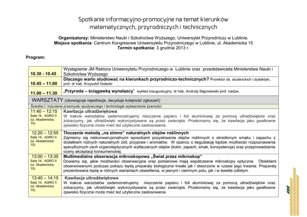 Spotkanie informacyjno-promocyjne na temat kierunków matematycznych, przyrodniczych i technicznych Organizatorzy: Ministerstwo Nauki i Szkolnictwa Wyższego, Uniwersytet Przyrodniczy w Lublinie. Miejsce spotkania: Centrum Kongresowe Uniwersytetu Przyrodniczego w Lublinie, ul. Akademicka 15 Termin spotkania: 3 grudnia 2013 r. Program: 10.30 - 10.45 10.45 – 11.00 11.00 – 11.30 Wystąpienie JM Rektora Uniwersytetu Przyrodniczego w Lublinie oraz przedstawiciela Ministerstwa Nauki i Szkolnictwa Wyższego Dlaczego warto studiować na kierunkach przyrodniczo-technicznych? Prorektor ds. studenckich i dydaktyki, prof. dr hab. Krzysztof Gołacki „Przyroda – ściągawką wynalazcy” wykład inauguracyjny: dr hab. Andrzej Stępniewski prof. nadzw. WARSZTATY (obowiązuje rejestracja, decyduje kolejność zgłoszeń) Ścieżka I: inżynieria przemysłu spożywczego i technologie wytwarzania żywności 11:40 – 12:15 Kawitacja ultradźwiękowa Sala 14, AGRO II (ul. Akademicka 15) W trakcie warsztatów zademonstrujemy niszczenie papieru i foli aluminiowej za pomocą ultradźwięków oraz zobaczymy, jak ultradźwięki wykorzystywane są przez zwierzęta. Przekonamy się, że kawitacja jako gwałtowne zjawisko fizyczne może mieć też użyteczne zastosowania. 12:20 – 12:55 Sala 14, AGRO II (ul. Akademicka 15) 13:00 – 13:35 Sala 14, AGRO II (ul. Akademicka 15) 13:40 – 14:15 Sala 14, AGRO II (ul. Akademicka 15) Tłoczenie metodą „na zimno” naturalnych olejów roślinnych Zajmiemy się niekonwencjonalnymi sposobami pozyskiwania olejów roślinnych o określonym smaku i zapachu z dodatkiem różnych naturalnych ziół, przypraw i aromatów. W oparciu o degustację będzie możliwość rozpoznawania specyficznych cech organoleptycznych wytłaczanych olejów (kolor, zapach, smak, konsystencja) oraz przeprowadzenie oceny akceptacji konsumenckiej. Multimedialna obserwacja mikroskopowa „Świat przez mikroskop” Dowiemy się, jakie możliwości obserwacyjne oraz pomiarowe mają współczesne mikroskopy optyczne. Obiektami obserwowanymi podczas pokazu będą preparaty biologiczne trwałe jak i stworzone w czasie jego trwania. Preparaty prezentowane będą w różnych wariantach oświetlenia, w jasnym i ciemnym polu, jak i w świetle odbitym. Kawitacja ultradźwiękowa W trakcie warsztatów zademonstrujemy niszczenie papieru i foli aluminiowej za pomocą ultradźwięków oraz zobaczymy, jak ultradźwięki wykorzystywane są przez zwierzęta. Przekonamy się, że kawitacja jako gwałtowne zjawisko fizyczne może mieć też użyteczne zastosowania. Ścieżka II: kształtowanie środowiska i architektura krajobrazu 11:40 – 13:30 Sala nr 15, AGRO II (ul. Akademicka 15) Sprawdź się jako architekt krajobrazu! Warsztaty związane z architekturą krajobrazu w formie gry z nagrodami za aktywność. Zmierzymy się z zadaniem rysunkowym, kreowaniem przestrzeni w małej skali – makietowaniem, a także z florystyką w małych wnętrzach ogrodowych. Ścieżka III: biotechnologia, technologia żywności i żywienie człowieka, dietetyka 11.40 – 12.15 sala nr 4, AGRO II (ul. Akademicka 15) 12.20 – 12:55 sala nr 4, AGRO II (ul. Akademicka 15) Czy możliwy jest dzień bez chemii? Poprzez ciekawe przykłady z życia codziennego będziemy poszukiwać odpowiedzi na pytanie postawione w tytule warsztatu. Chemia w kuchni Udowodnimy, że doświadczenia chemiczne niekoniecznie muszą być wykonywane w naukowym laboratorium, a każdy z nas - często nieświadomie - jest ich wykonawcą. Spróbujemy zajrzeć do królestwa chemii przez kuchenne drzwi. To dzięki chemicznym prawom radzimy sobie z wieloma niedogodnościami życia codziennego np. wiemy jak oczyścić srebro czy jak pozbyć się kamienia z czajnika, jednocześnie nie wiedząc, że wykonujemy reakcje chemiczne. 1. POKAZY, PREZENTACJE POPULARNONAUKOWE oraz STOISKA PROMOCYJNE 11.30 – 14.15 Lody z „fantazją” – ocena konsumencka (prezentacja technologii otrzymywania lodów oraz degustacja Holl Centrum Kongresowego (ul. Akademicka 15) nietypowych lodów przygotowanych w laboratoriach) Przekąski zbożowe (prezentacja technologii wytwarzania przekąsek ekstrudowanych z surowców zbożowych z dodatkami wzbogacającymi oraz degustację przekąsek o różnych smakach) Wystawa prac wykonywanych w ramach działalności studenckich kół naukowych (prace studenckie wykonane w ramach zajęć z rysunku i rzeźby, malarstwa, projektowania obiektów architektury krajobrazu) Pokaz działania przydomowej oczyszczalni ścieków (pokaz związany z kierunkiem zamawianym inżynieria środowiska) STOISKA promujące kierunki przyrodniczo-techniczne: MNiSW oraz UP w Lublinie (można bezpłatnie pobrać informatory oraz gadżety promocyjne) SPACER PO KAMPUSIE Uniwersytetu Przyrodniczego w Lublinie: Od 13.30 Centrum Innowacyjno-Wdrożeniowe Nowych Technik i Technologii w Inżynierii Rolniczej, ul. Głęboka dla chętnych 28 (prezentacja nowego budynku, sal, zaplecza laboratoryjnego; możliwość uczestnictwa w zajęciach zgodnie z otwartych na kierunku architektura krajobrazu): Wydział Inżynierii Produkcji oraz Wydział Ogrodnictwa zapisami w i Architektury Krajobrazu elektronicznej Wydział Nauk o Żywności i Biotechnologii, ul. Skromna 8 (wykład: „Owoce i warzywa w diecie rejestracji młodzieży”, zapoznanie z pracowniami i laboratoriami, pokaz badania właściwości fizycznych żywności, prezentacja osiągnięć Studenckiego Koła Naukowego Technologii Żywności) *** Około godziny 13 dla uczestników spotkania przewidziany jest poczęstunek