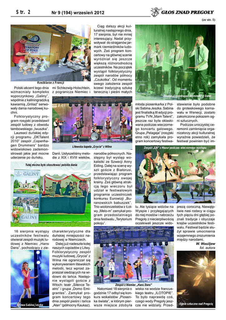 Str. 2 Nr 9 (194) wrzesień 2012 (ze str. 1) Rzeźbiarze z Francji Polski akcent tego dnia wzmacniały kompleks wypoczynkowy „Galiny”, wspólnie z kaliningradzką kawiarnią „Griliaż” serwowały dania narodowej kuchni. Folklorystyczny program rosyjski przedstawił zespół ludowy z obwodu tambowskiego „Iwuszka”. Laureaci duńskiej edycji programu „DKTalent 2010” zespół „Copenhagen Drummers” bardzo widowiskowo zademonstrowali jakie jest mocne uderzenie po duńsku. mi Schlezwig-Holschtein, z pogranicza Niemiec i Ciąg dalszy akcji kulturalnej następnego dnia, 17 sierpnia, był nie mniej interesujący. Nadal przywoływał do straganów jarmark rzemieślników ludowych. Zaś program koncertowy na głównej scenie wyróżniał się jeszcze większą różnorodnością uczestników. Na początek wystąpił folklorystyczny zespół narodów północy „Czukotka”. Od momentu swego założenia zespół krzewi tradycyjną sztukę taneczną i pieśni małych Zespół „Copenhagen drummek” z Danii młoda piosenkarka z Polski Sabina Jeszka. Sabina jest finalistką III edycji programu TVN „Mam Talent”, jeszcze raz była oklaskiwana podczas wieczornego koncertu galowego. Grupa „Pelageja” (rosyjski etno rok) zamykała program koncertowy festiwaLitewska kapela „Grycia” z Wilno Zespół „Ełk” z Mazur podczas wieczornego występu Danii. Usłyszeliśmy melo- narodów północnych. Nadie z XIX i XVIII wieków, stępny był występ wokalistki ze Szwecji Anny Tutaj można było skosztować polskie dania Eiding. Dalej na scenę wyszli goście z Białorusi, przedstawiając program folklorystyczny swojej krainy. Zaś główną atrakcją tego wieczoru by ł udział w festiwalowym programie uczestniczek konkursu Eurowizji „Buranowskich babuszek”. Trio wiolonczelistów z Łotwy „Melo-m” zamykał program przedostatniego dnia festiwalu „Terytorium pokoju”. 16 sierpnia wyst ępy uczestników festiwalu otwierał zespól muzyki ludowej z Niemiec „Hans Dans”, pochodzący z zie- Śpiewa Sabina Jeszka charakterystyczne dla duńskiej mniejszości narodowej w Niemczech. Dalej już nadeszła kolej naszych sąsiadów z Litwy. Folklorystyczny zespó ł muzyki ludowej „Grycia” z Wilna nie ograniczał się wykonywaniem litewskich melodii, lecz wprost zapraszał siedzących na widowni do tańca. Następnie wystąpili goście z Włoch: teatr „Silence Teatro” i grupa „Domo Emigrantes”. Zamykał program koncertowy tego dnia zespół pieśni i tańca „Ałan” (północny Kaukaz). stawienie było podobne do groteskowego karnawału w Wenecji, zostało zakończone pokazem ogni sztucznych. Podczas uroczystej ceremonii zamknięcia organizatorzy akcji kulturalnej wyraźnie powiedzieli, że festiwal powinien być im- lu. Ale tysiące widzów na Wyspie i przylegających do niej mostów i nabrzeżu Pregoły z niecierpliwością oczekiwali jeszcze wido- prezą coroczną. Niewątpliwie nasi rodacy w ciągu tych pięciu dni głębiej poznali tradycje i obyczaje krajów uczestników festiwalu. Festiwal będzie służył sprawie umocnienia wzajemnego zrozumienia między narodami. W. Wasiljew fot. autora Zespół z Niemiec „Hans Dans” Natomiast 18 sierpnia o godzinie 17 odbył się konkurs wokalistów „Piosenka świata”, w którym pierwsze miejsce zdoby ła wiska na wodzie francuskiego teatru „ILOTOPIE”. To było naprawdę coś, czego wody Pregoły jeszcze nie widziały. Przed- Ognie sztuczne nad Pregołą