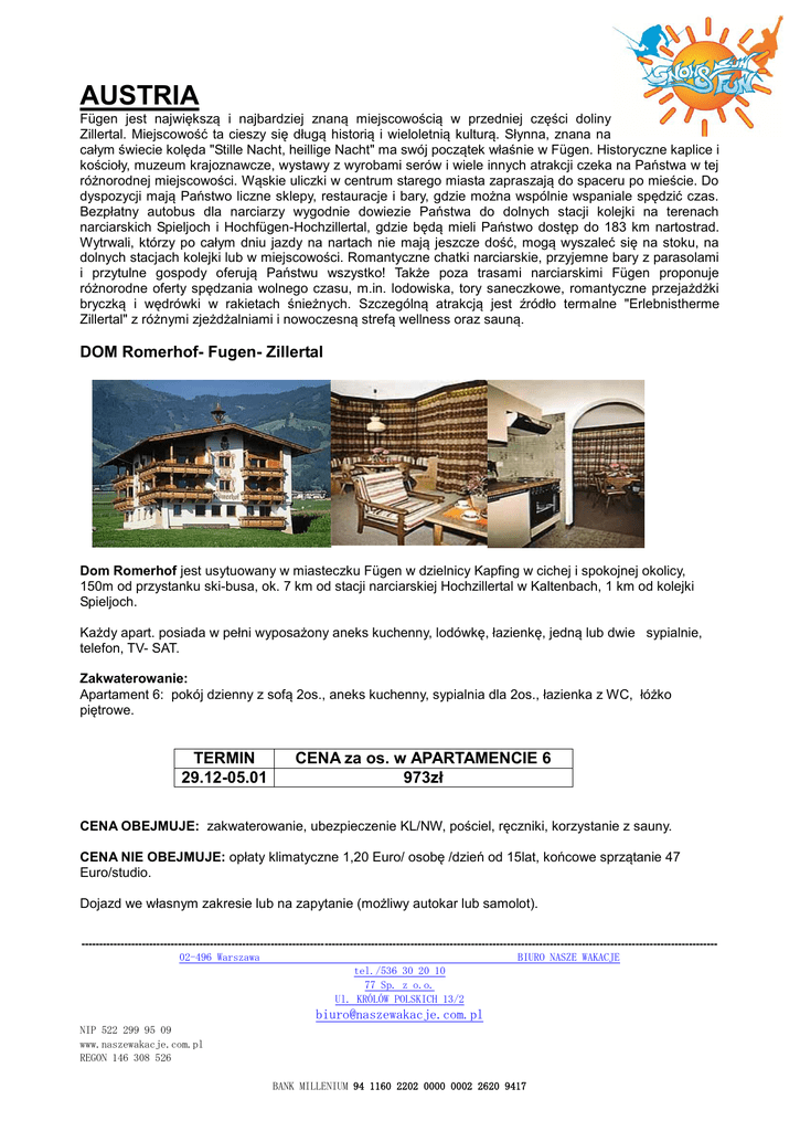 AUSTRIA Fügen jest największą i najbardziej znaną miejscowością w przedniej części doliny Zillertal. Miejscowość ta cieszy się długą historią i wieloletnią kulturą. Słynna, znana na całym świecie kolęda "Stille Nacht, heillige Nacht" ma swój początek właśnie w Fügen. Historyczne kaplice i kościoły, muzeum krajoznawcze, wystawy z wyrobami serów i wiele innych atrakcji czeka na Państwa w tej różnorodnej miejscowości. Wąskie uliczki w centrum starego miasta zapraszają do spaceru po mieście. Do dyspozycji mają Państwo liczne sklepy, restauracje i bary, gdzie można wspólnie wspaniale spędzić czas. Bezpłatny autobus dla narciarzy wygodnie dowiezie Państwa do dolnych stacji kolejki na terenach narciarskich Spieljoch i Hochfügen-Hochzillertal, gdzie będą mieli Państwo dostęp do 183 km nartostrad. Wytrwali, którzy po całym dniu jazdy na nartach nie mają jeszcze dość, mogą wyszaleć się na stoku, na dolnych stacjach kolejki lub w miejscowości. Romantyczne chatki narciarskie, przyjemne bary z parasolami i przytulne gospody oferują Państwu wszystko! Także poza trasami narciarskimi Fügen proponuje różnorodne oferty spędzania wolnego czasu, m.in. lodowiska, tory saneczkowe, romantyczne przejażdżki bryczką i wędrówki w rakietach śnieżnych. Szczególną atrakcją jest źródło termalne "Erlebnistherme Zillertal" z różnymi zjeżdżalniami i nowoczesną strefą wellness oraz sauną. DOM Romerhof- Fugen- Zillertal Dom Romerhof jest usytuowany w miasteczku Fügen w dzielnicy Kapfing w cichej i spokojnej okolicy, 150m od przystanku ski-busa, ok. 7 km od stacji narciarskiej Hochzillertal w Kaltenbach, 1 km od kolejki Spieljoch. Każdy apart. posiada w pełni wyposażony aneks kuchenny, lodówkę, łazienkę, jedną lub dwie sypialnie, telefon, TV- SAT. Zakwaterowanie: Apartament 6: pokój dzienny z sofą 2os., aneks kuchenny, sypialnia dla 2os., łazienka z WC, łóżko piętrowe. TERMIN 29.12-05.01 CENA za os. w APARTAMENCIE 6 973zł CENA OBEJMUJE: zakwaterowanie, ubezpieczenie KL/NW, pościel, ręczniki, korzystanie z sauny. CENA NIE OBEJMUJE: opłaty klimatyczne 1,20 Euro/ osobę /dzień od 15lat, końcowe sprzątanie 47 Euro/studio. Dojazd we własnym zakresie lub na zapytanie (możliwy autokar lub samolot). ---------------------------------------------------------------------------------------------------------------------------------------------------------------------------------02-496 Warszawa BIURO NASZE WAKACJE tel./536 30 20 10 77 Sp. z o.o. Ul. KRÓLÓW POLSKICH 13/2 [email protected] NIP 522 299 95 09 www.naszewakacje.com.pl REGON 146 308 526 BANK MILLENIUM 94 1160 2202 0000 0002 2620 9417