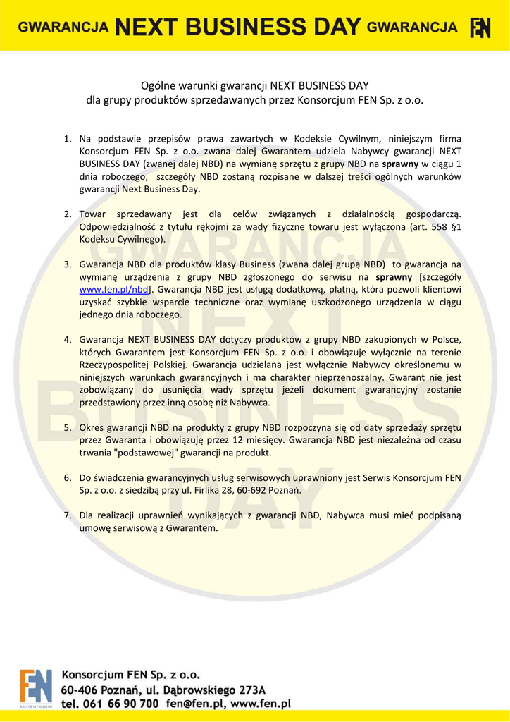 Ogólne warunki gwarancji NEXT BUSINESS DAY dla grupy produktów sprzedawanych przez Konsorcjum FEN Sp. z o.o. 1. Na podstawie przepisów prawa zawartych w Kodeksie Cywilnym, niniejszym firma Konsorcjum FEN Sp. z o.o. zwana dalej Gwarantem udziela Nabywcy gwarancji NEXT BUSINESS DAY (zwanej dalej NBD) na wymianę sprzętu z grupy NBD na sprawny w ciągu 1 dnia roboczego, szczegóły NBD zostaną rozpisane w dalszej treści ogólnych warunków gwarancji Next Business Day. 2. Towar sprzedawany jest dla celów związanych z działalnością gospodarczą. Odpowiedzialność z tytułu rękojmi za wady fizyczne towaru jest wyłączona (art. 558 §1 Kodeksu Cywilnego). 3. Gwarancja NBD dla produktów klasy Business (zwana dalej grupą NBD) to gwarancja na wymianę urządzenia z grupy NBD zgłoszonego do serwisu na sprawny [szczegóły www.fen.pl/nbd]. Gwarancja NBD jest usługą dodatkową, płatną, która pozwoli klientowi uzyskać szybkie wsparcie techniczne oraz wymianę uszkodzonego urządzenia w ciągu jednego dnia roboczego. 4. Gwarancja NEXT BUSINESS DAY dotyczy produktów z grupy NBD zakupionych w Polsce, których Gwarantem jest Konsorcjum FEN Sp. z o.o. i obowiązuje wyłącznie na terenie Rzeczypospolitej Polskiej. Gwarancja udzielana jest wyłącznie Nabywcy określonemu w niniejszych warunkach gwarancyjnych i ma charakter nieprzenoszalny. Gwarant nie jest zobowiązany do usunięcia wady sprzętu jeżeli dokument gwarancyjny zostanie przedstawiony przez inną osobę niż Nabywca. 5. Okres gwarancji NBD na produkty z grupy NBD rozpoczyna się od daty sprzedaży sprzętu przez Gwaranta i obowiązuję przez 12 miesięcy. Gwarancja NBD jest niezależna od czasu trwania "podstawowej" gwarancji na produkt. 6. Do świadczenia gwarancyjnych usług serwisowych uprawniony jest Serwis Konsorcjum FEN Sp. z o.o. z siedzibą przy ul. Firlika 28, 60-692 Poznań. 7. Dla realizacji uprawnień wynikających z gwarancji NBD, Nabywca musi mieć podpisaną umowę serwisową z Gwarantem. strona 1 / 6 PROCEDURA SERWISOWA W PRZYPADKU GWARANCJI NBD 1. W ramach udzielonej gwarancji NBD, Nabywca kontaktuje się z serwisem Gwaranta w celu zgłoszenia problemów z urządzeniem z grupy NBD. Po konsultacji, serwis Gwaranta podejmuje decyzję, czy urządzenie podlega warunkom gwaranacji NBD. 2. Nabywca wypełnia formularz wymiany gwarancyjnej NBD (patrz aneks 1 do umowy), parafuje podpisem i pięczątką firmy, następnie wysyła e-mailem lub faksem do serwisu Konsorcjum FEN. 3. Na podstawie formularza wymiany gwarancyjnej NBD, serwis Gwaranta, wysyła pod wskazany przez Nabywcę adres, sprawne urządzenie NBD oraz rejestruje zdarzenie w systemie serwisowym Gwaranta. 4. Nabywca jest zobowiązany w przeciągu 3 dni roboczych odesłać uszkodzony egzemplarz objęty gwarancją NBD na własny koszt na adres serwisu Gwaranta. 5. Za każdy dzień zwłoki w odesłaniu uszkodzonego urządzenia NBD, Nabywca obarczony zostanie karą umowną w wysokości 20PLN netto. 6. Warunkiem uznania zgłoszenia w okresie gwarancji NBD jest dostarczenie sprzętu do serwisu w stanie kompletnym tj. wraz z instrukcjami, podręcznikami, oprogramowaniem, oryginalnym opakowaniem zabezpieczającym lub opakowaniem zastępczym zapewniającym bezpieczne warunki transportu i przechowywania analogicznie do warunków zapewnianych przez opakowanie fabryczne. Sprzęt powinien być dostarczony wraz z pełnym wyposażeniem (zasilacz, okablowanie, anteny itp.). Na opakowaniu należy nakleić etykietę NBD (aneks 2), która została dołączona do towaru podczas sprzedaży. 7. W przypadku gdy urządzenie NBD zgłoszone do serwisu będzie sprawne i nie potwierdzą się zgłoszone w formularzu usterki, Nabywca pokryje koszty wysyłki oraz diagnozy. 8. Urządzenie NBD, w którym zostaną ujawnione w okresie gwarancji NBD wady uniemożliwiające eksploatację sprzętu zgodnie z przeznaczeniem, będzie wymienione na sprawne w terminie 1 dnia roboczego od momentu przysłania formularza wymiany gwarancyjnej NBD. W wyjątkowych przypadkach spowodowanych przez okoliczności niezależne od Konsorcjum FEN Sp. z o.o., termin wymiany może ulec wydłużeniu. 9. Wszelkie zmiany w treści formularza wymiany gwarancyjnej NBD są ważne jedynie wtedy, gdy dokonywane są przez Serwis Gwaranta. 10. Z tytułu udzielonej gwarancji NBD, Gwarant nie odpowiada za utratę spodziewanych korzyści i poniesionych kosztów wynikłych z użytkowania lub niemożności użytkowania zakupionego sprzętu. strona 2 / 6 11. Gwarancja NBD obejmuje wyłącznie produkty z grupy NBD oznakowane specjalną etykietą gwarancyjną NBD (patrz aneks 2 do umowy). Gwarancja NBD nie obejmuje uszkodzeń lub nieprawidłowego działania sprzętu wynikającego z: − uszkodzeń mechanicznych i wywołanych nimi wad, − uszkodzeń powstałych na skutek nieprzestrzegania powszechnych zasad eksploatacji i konserwacji sprzętu elektronicznego oraz wszystkich innych uszkodzeń powstałych z winy lub niewiedzy Nabywcy lub stosowania nieoryginalnych materiałów eksploatacyjnych, − uszkodzeń spowodowanych bezpośrednio lub pośrednio zdarzeniami zewnętrznymi takimi jak np.: powódź, pożar, przepięcie linii energetycznej, lub teletechnicznej, uderzeniem pioruna, itp. − uszkodzeń będących następstwem oddziaływania zewnętrznych czynników chemicznych i termicznych, − uszkodzeń będących następstwem zalania sprzętu jakimkolwiek płynem lub jego zanieczyszczeniem, − uszkodzeń powstałych z winy działania oprogramowania takiego jak: wirusy komputerowe, programy śledzące, dialery, konie trojańskie, itp. 12. Gwarancja NBD nie obejmuje problemów współpracy zakupionego sprzętu z urządzeniami i oprogramowaniem firm trzecich. 13. Konsorcjum FEN Sp. z o.o. nie ponosi odpowiedzialności za utratę danych oraz inne szkody powstałe na skutek awarii zakupionego sprzętu. 14. Gwarancją NBD nie są objęte materiały eksploatacyjne i podzespoły podlegające naturalnemu zużyciu w czasie użytkowani