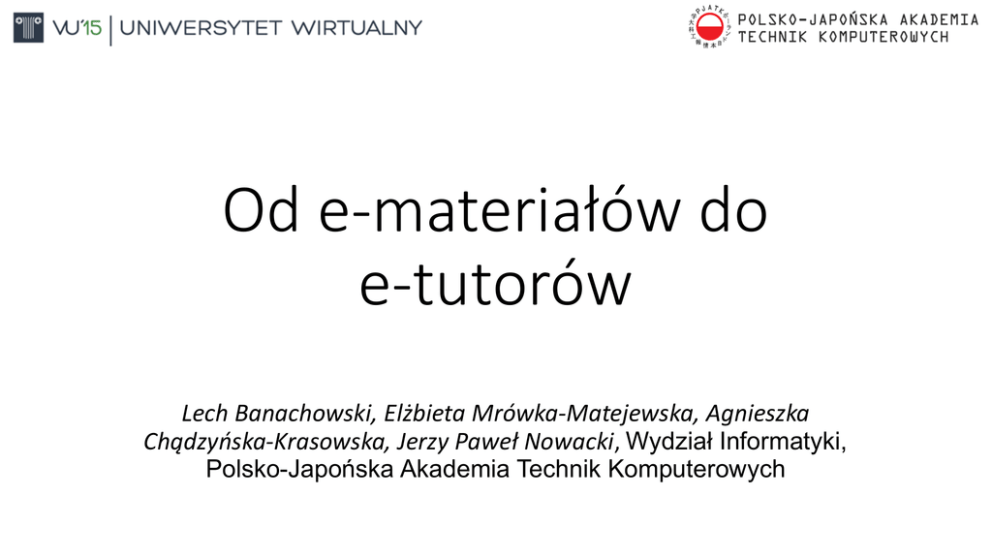 Od e-materiałów do e-tutorów Lech Banachowski, Elżbieta Mrówka-Matejewska, Agnieszka Chądzyńska-Krasowska, Jerzy Paweł Nowacki, Wydział Informatyki, Polsko-Japońska Akademia Technik Komputerowych Plan prezentacji 1. 2. 3. 4. 5. Gromadzenie e-materiałów Budowa e-tutora Baza danych dziedziny wiedzy Analiza danych Prototyp aplikacji L.Banachowski, E.Mrówka-Matejewska, A. Chądzyńska-Krasowska, J.P. Nowacki, Od e-materiałów do e-tutorów Rozwój e-materiałów na Wydziale Informatyki PJATK • Lata dziewięćdziesiąte: tworzenie e-materiałów do tradycyjnych zajęć • 2000-01: Budowa uczelnianego systemu do zarządzania e-materiałami i e-kursami (Edu) • 2001-06: Wychodząc od istniejących e-materiałów tworzenie podręczników elektronicznych w formacie HTML z prezentacjami multimedialnymi • 2012: Powstanie repozytoriów: materiałów naukowych oraz materiałów w Edu • 2013: Zarządzanie e-materiałami przez studentów: Wiki, Blogi, E-portfolia • 2013- : Kontynuowanie tworzenia e-materiałów: • Tworzenie krótkich kursów elearningowych odbywających się automatycznie, bez udziału nauczyciela (projekt Nomad) • Tworzenie nowych e-materiałów do studiów elearningowych L.Banachowski, E.Mrówka-Matejewska, A. Chądzyńska-Krasowska, J.P. Nowacki, Od e-materiałów do e-tutorów Od e-materiałów do e- tutorów Tworzenie e-materiałów wspomagających prowadzenie tradycyjnych zajęć Tworzenie e-materiałów wspomagających prowadzenie zajęć on-line E-tutor Repozytorium Gromadzenie prac studenckich: blogi, wiki, eportfolia Automatyzacja czynności jak wyszukiwanie, dostosowywanie podawanych materiałów do poziomu i potrzeb studenta L.Banachowski, E.Mrówka-Matejewska, A. Chądzyńska-Krasowska, J.P. Nowacki, Od e-materiałów do e-tutorów Problem • Uczelnia dysponuje dużą liczbą elektronicznych materiałów dydaktycznych i będzie ich coraz więcej • Potrzebny jest system informatyczny spełniający rolę korepetytora studentów ułatwiający korzystanie z materiałów niezależnie od trybu studiowania • Program komputerowy ma działać dla wszystkich dziedzin wiedzy • Proste, mało kosztowne wprowadzanie danych specyficznych dla dziedziny wiedzy L.Banachowski, E.Mrówka-Matejewska, A. Chądzyńska-Krasowska, J.P. Nowacki, Od e-materiałów do e-tutorów Przykład rozwiązania problemu: iMANIC w University of Massachusetts Amherst • Dla kursów z dowolnej dziedziny wiedzy • Oparty na tradycyjnych e-materiałach jak wykładowe slajdy, nagrania wykładów, prezentacje, ćwiczenia • System proponuje studentowi kolejne tematy w oparciu o sieć semantyczną tematów i informacje o dotychczasowych aktywnościach studenta – student sam dokonuje wyboru • Materiał jest dynamicznie generowany i dostosowany do poziomu studenta i jego aktualnych potrzeb L.Banachowski, E.Mrówka-Matejewska, A. Chądzyńska-Krasowska, J.P. Nowacki, Od e-materiałów do e-tutorów Rozwiązanie problemu w PJATK: E-korepetytor System informatyczny realizujący zadania korepetytora na życzenie studenta: 1. 2. 3. 4. 5. 6. Sprawdzenie wiedzy Nadrobienie zaległości Dodatkowa pomoc Powtórzenie materiału Rozszerzenie materiału Pomoc w samodzielnym uczeniu się L.Banachowski, E.Mrówka-Matejewska, A. Chądzyńska-Krasowska, J.P. Nowacki, Od e-materiałów do e-tutorów E-korepetytor c.d. W tle system dokonuje analizy zachowania się i postępów studenta: 1. może ocenić aktualne potrzeby studenta i zaproponować odpowiednie akcje 2. w oparciu o analizę profili i wyników uczenia się poprzednich studentów może zarekomendować odpowiednie akcje kolejnym studentom 3. może wskazać partie materiałów wymagające poprawy przez autorów L.Banachowski, E.Mrówka-Matejewska, A. Chądzyńska-Krasowska, J.P. Nowacki, Od e-materiałów do e-tutorów Cechy E-korepetytora • Punkt wyjścia: • podręcznik elektroniczny • wspomagające materiały elektroniczne • Składowanie elementów wiedzy oraz wyników aktywności studentów w bazie danych • Możliwość generowania materiałów z bazy danych dopasowanych do potrzeb studenta • Możliwość eksploracji zgromadzonych danych L.Banachowski, E.Mrówka-Matejewska, A. Chądzyńska-Krasowska, J.P. Nowacki, Od e-materiałów do e-tutorów Reprezentowanie wiedzy dziedzinowej studenta • Informacje o tym co wie student są umieszczane na modelu danych dziedziny wiedzy • Każdy element modelu dziedziny może być scharakteryzowany jako znany lub nieznany dla studenta ewentualnie z oceną, stopniem opanowania lub prawdopodobieństwem opanowania • Model ten wskazuje jak daleko zaszedł student w poznaniu dziedziny L.Banachowski, E.Mrówka-Matejewska, A. Chądzyńska-Krasowska, J.P. Nowacki, Od e-materiałów do e-tutorów Tworzenie bazy danych dziedziny wiedzy Wybranie podręczników elektronicznych pokrywających dziedzinę wiedzy Zgromadzenie materiałów elektronicznych Identyfikacja sekcji Identyfikacja fragmentów, elementów wiedzy i tematów wiedzy Identyfikacja słów kluczowych i relacji między Podział sekcjami Model danych dziedziny wiedzy Baza danych dziedziny wiedzy Rejestrowanie aktywności studentów L.Banachowski, E.Mrówka-Matejewska, A. Chądzyńska-Krasowska, J.P. Nowacki, Od e-materiałów do e-tutorów Zasady korzystania z materiałów • Student może: • Zrealizować sekcję: kolejną lub wybraną ze spisu treści podręcznika • Przejść do sekcji materiałów zaproponowanej przez system • Przejść do sekcji materiałów wskazanych przez relacje między sekcjami • Wyszukać sekcje materiałów przy użyciu słów kluczowych • Wyświetlić pytania, testy, zestawienia, prezentacje generowane z bazy danych L.Banachowski, E.Mrówka-Matejewska, A. Chądzyńska-Krasowska, J.P. Nowacki, Od e-materiałów do e-tutorów Zasady korzystania z materiałów dydaktycznych c.d. • Student sam decyduje, czy zapoznał się z kursem/ sekcją materiałów/ tematem – nie system • Student może w