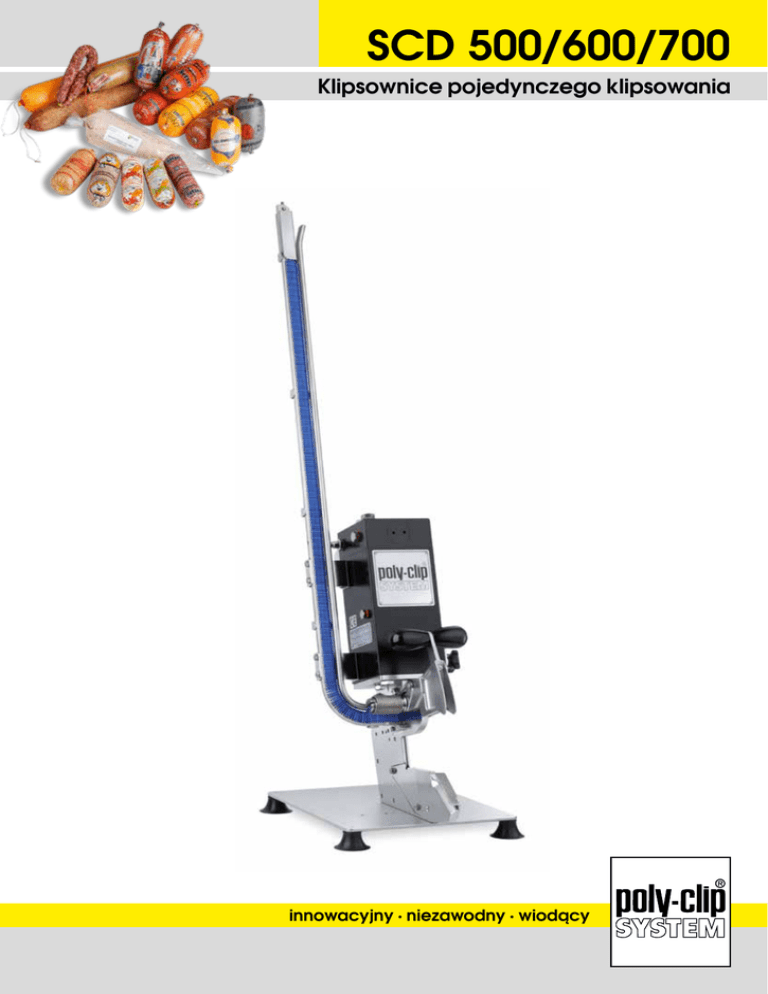 SCD 500/600/700 Klipsownice pojedynczego klipsowania innowacyjny · niezawodny · wiodący SCD 500/600/700 Do wszystkich osłonek sztucznych, jelit naturalnych, woreczków i siatek Ze stali nierdzewnej i tworzywa sztucznego dopuszczonego do kontaktu z żywnością Specjalna wersja dla delikatnych jelit naturalnych Zastosowanie Zalety Urządzenie pneumatyczne Łatwe utrzymanie w czystości dzięki gładkiej powierzchni Łatwe w obsłudze – prosta wymiana matryc i noża odcinającego SCD 500 Specjalnie przeznaczona do zamykania delikatnych jelit naturalnych: baranich, wieprzowych jak również jelit wołowych i osłonek sztucznych o małym kalibrze. SCD 500 może być zintegrowana z liniami do odwieszania jelit naturalnych i osłonek białkowych Możliwości wyposażenia Zespół oczyszczająco-smarujący SCD 600/700 w wersji poziomej Rynna boczna z ogranicznikiem wielkości porcji SCD 600/700: Dodatkowe wyposażenie maszyn bazowych: – nóż pneumatyczny (PM) – podajnik pętelek (GSE) – dławik i reduktor ciśnienia Inne warianty: – zespół kodujący do SCD 700 – wersja pozioma – klipsy S na szpuli (SP) Funkcje i obsługa Klipsownice pojedynczego klipsowania serii SCD 500/600/700 są urządzeniami pneumatycznymi. Przez zamknięcie klapy rozpieracza farszu osłonka zostaje zmarszczona, a następnie automatycznie zostaje założony klips. Siłę docisku klipsa w każdym urządzeniu typu SCD 600/700 z nożem pneumatycznym i automatycznym podajnikiem pętelek GSE SCD można regulować indywidualnie według skali. Za pomocą dławika i reduktora ciśnienia można regulować prędkość i ciśnienie klipsowania w zależności od rodzaju zamykanego produktu. Dane techniczne: SCD 500*/600/700 maszyna bazowa GSE PM SP szerokość (w mm): 250 290 250 250 głębokość (w mm): 390 650 390 390 wysokość (w mm): 940 940 940 810 waga (w kg): 12 17 12 12 sprężone powietrze: 3-6 bar/0,3-0,6 MPa zapotrzebowanie powietrza (w NL/cykl): 3,3 3,4 3,8 3,3 Stosowane rozmiary klipsów: SCD 500: S 522/524/526/528/532 SCD 600: S 625/628/632/638 SCD 700: S 735/740/744/747 pętelki: GS 22 * SCD 500 dostępne tylko w wersji bazowej. Przedstawicielem firmy Poly-clip System w Polsce jest: „PROMAR” Przedsiębiorstwo Produkcyjno Handlowe Sp. z o.o. ul. 11-go Listopada 96 · 05-092 Łomianki k/Warszawy tel.: +48 22 768 64 00 do…09 fax + 48 22 768 64 10 e-mail:[email protected] · www.promar.pl SCD 500/600/700-PL-04/13-HA Prawo zmian technicznych zastrzezone. Klipsownice serii SCD są idealnie przystosowane do klipsowania pojedynczych batonów. Maszyny klipsują wszystkie rodzaje osłonek do kalibru 120 mm. Modułowa konstrukcja umożliwia wyposażenie w pojedyncze komponenty. W przypadku typu 700 można opcjonalnie kodować zamykane porcje bezpośrednio na klipsie. Stempel kodujący składa się z trzech przestawnych znaków. W prosty sposób możemy zakodować datę pro dukcji, numer szarży/partii.