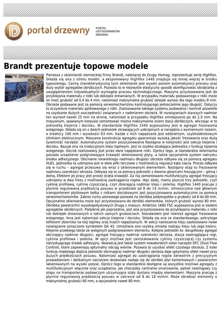Brandt prezentuje topowe modele Pierwsza z okleiniarek niemieckiej firmy Brandt, należącej do Grupy Homag, reprezentuje serię Highflex. Składa się ona z ośmiu modeli, a eksponowany Highflex 1440 znajduje się mniej więcej w środku typoszeregu. Cechą charakterystyczną tych okleiniarek jest wysoki poziom automatyzacji procesu oraz duży wybór agregatów obróbczych. Pozwala to w niezwykle elastyczny sposób skonfigurować obrabiarkę z uwzględnieniem indywidualnych wymogów procesu technologicznego. Maszyna przystosowana jest do przyklejania materiału z rolki lub doklejek drewnianych. W przypadku materiału podawanego z rolki może on mieć grubość od 0,4 do 4 mm, natomiast maksymalna grubość oklejek wynosi dla tego modelu 8 mm. Obrzeże podawane jest za pomocą serwomechanizmu kontrolującego jednocześnie jego długość. Dotyczy to oczywiście materiału aplikowanego z rolki. Zastosowanie takiego systemu podawania i kontroli pozwoliło na uzyskanie dużych oszczędności związanych z nadmiarem obrzeża. W rozwiązaniach starszych nadmiar ten wynosił nawet 25 mm na stronę, natomiast w przypadku Highflex zmniejszono go do 2,5 mm. Na masywnym, spawanym korpusie zamontować można maksymalnie osiem stacji obróbczych, wliczając w to jednostkę klejenia i docisku. W standardzie Highflex 1440 wyposażony jest w agregat frezowania wstępnego. Składa się on z dwóch jednostek skrawających uzbrojonych w narzędzia z wymiennymi nożami, o średnicy 100 mm i wysokości 63 mm. Każde z nich napędzane jest oddzielnym, szybkoobrotowym silnikiem elektrycznym. Masywna konstrukcja agregatu gwarantuje wysoką jakość frezowania oraz dużą żywotność narzędzi. Automatyczny system pozycjonowania Następna w kolejności jest sekcja klejenia i docisku. Bazuje ona na tradycyjnym kleju topliwym. Jest to szybko działająca jednostka z funkcją topienia wstępnego. Docisk realizowany jest przez dwie napędzane rolki. Oprócz tego, w standardzie okleiniarka posiada urządzenie podgrzewające krawędź okleinowanej płyty, a także opcjonalnie system natrysku środka adhezyjnego. Obcinanie niewielkiego nadmiaru długości obrzeża odbywa się za pomocą agregatu HL81. Jednostka ta uzbrojona jest w dwie piłki tarczowe z możliwością regulacji kąta cięcia. Proces odbywa się w ruchu – agregat przesuwa się wraz z okleinowanym elementem. Następny etap to frezowanie nadmiaru szerokości obrzeża. Odbywa się to za pomocą jednostki z dwoma głowicami frezującymi – górną i dolną. Efektem jej pracy jest prosto ścięta krawędź. Za nią zamontowano multifunkcyjny agregat frezujący uzbrojony w dwa frezy z możliwością zaokrąglania rogów. Idąc dalej, mamy jeszcze trzy jednostki, czyli cyklinę profilową, cyklinę czyszczącą, czyli zbierającą nadmiar kleju i polerkę. Highflex 1440 pracuje z płynnie regulowaną prędkością posuwu w przedziale od 8 do 14 m/min. Umieszczona nad głównym transporterem płytkowym belka z rolkami dociskowymi jest pozycjonowana automatycznie za pomocą serwomechanizmów. Zakres ruchu pionowego pozwala na obróbkę podzespołów o grubości od 8 do 60 mm. Opcjonalnie okleiniarka może być przystosowana do obróbki elementów, których grubość wynosi 80 mm. Obróbka powierzchni wysokopołyskowych Druga z maszyn, Ambition 1660 FSC wyposażona jest w siedem agregatów obróbczych. Podobnie jak poprzednia, jest ona przystosowana do przyklejania materiału z rolki lub doklejek drewnianych o takich samych grubościach. Standardem jest również agregat frezowania wstępnego. Inna jest natomiast sekcja klejenia i docisku. Składa się ona ze standardowego, pokrytego teflonem zbiornika na klej topliwy oraz trzech napędzanych. W sekcji nanoszenia kleju zastosowano nowe rozwiązanie oznaczone symbolem QA 45. Umożliwia ono szybką zmianę rodzaju kleju lub jego koloru. Klejenie przebiega także ze wstępnym podgrzewaniem elementu. Kolejne jednostki to: dwupiłkowy agregat obcinający nadmiar długości, agregat frezujący nadmiar szerokości obrzeża, stacja zaokrąglająca rogi, cyklina profilowa i polerka. W opcji możliwe jest zainstalowanie cykliny czyszczącej czy systemu natryskującego środek adhezyjny. Nowością jest także system nowatorskich osłon narzędzi DFC (Dust Flow Control), które zapewniają optymalny odciąg wiórów. Pozwala to uzyskać efekt czystego obrzeża. Z kolei funkcja miękkiego dojścia jednostki obcinającej nadmiar długości obrzeża daje optymalny efekt nawet przy dużych prędkościach posuwu. Natomiast agregat do zaokrąglania rogów Serwotrim z precyzyjnym prowadzeniem i delikatnym naciskiem doskonale nadaje się do obróbki płyt komórkowych i powierzchni lakierowanych na wysoki połysk. Oprócz tego w standardzie dostępne są wszystkie możliwe agregaty z multifunkcyjnym włącznie oraz urządzenia, jak chociażby centralne smarowanie, pakiet nestingowy czy stopy na transporterze podawczym utrzymujące stały dystans między elementami. Maszyna pracuje z płynnie regulowaną prędkością posuwu w zakresie od 8 do 18 m/min. Może obrabiać elementy o maksymalnej grubości 60 mm, a opcjonalnie nawet 80 mm.