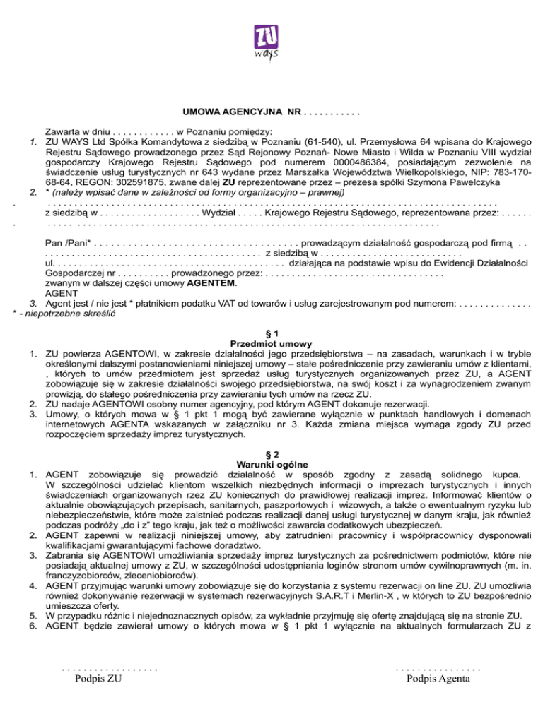 UMOWA AGENCYJNA NR . . . . . . . . . . . . . Zawarta w dniu . . . . . . . . . . . . w Poznaniu pomiędzy: 1. ZU WAYS Ltd Spółka Komandytowa z siedzibą w Poznaniu (61-540), ul. Przemysłowa 64 wpisana do Krajowego Rejestru Sądowego prowadzonego przez Sąd Rejonowy Poznań- Nowe Miasto i Wilda w Poznaniu VIII wydział gospodarczy Krajowego Rejestru Sądowego pod numerem 0000486384, posiadającym zezwolenie na świadczenie usług turystycznych nr 643 wydane przez Marszałka Województwa Wielkopolskiego, NIP: 783-17068-64, REGON: 302591875, zwane dalej ZU reprezentowane przez – prezesa spółki Szymona Pawelczyka 2. * (należy wpisać dane w zależności od formy organizacyjno – prawnej) ..................................................................................... z siedzibą w . . . . . . . . . . . . . . . . . . . Wydział . . . . . Krajowego Rejestru Sądowego, reprezentowana przez: . . . . . . ..... ......................... ........................................... Pan /Pani* . . . . . . . . . . . . . . . . . . . . . . . . . . . . . . . . . . . . prowadzącym działalność gospodarczą pod firmą . . . . . . . . . . . . . . . . . . . . . . . . . . . . . . . . . . . . . . . . . . . z siedzibą w . . . . . . . . . . . . . . . . . . . . . . . . . . . ul. . . . . . . . . . . . . . . . . . . . . . . . . . . . . . . . . . . . . . . . . . . . działająca na podstawie wpisu do Ewidencji Działalności Gospodarczej nr . . . . . . . . . . prowadzonego przez: . . . . . . . . . . . . . . . . . . . . . . . . . . . . . . . . . . zwanym w dalszej części umowy AGENTEM. AGENT 3. Agent jest / nie jest * płatnikiem podatku VAT od towarów i usług zarejestrowanym pod numerem: . . . . . . . . . . . . . . * - niepotrzebne skreślić §1 Przedmiot umowy 1. ZU powierza AGENTOWI, w zakresie działalności jego przedsiębiorstwa – na zasadach, warunkach i w trybie określonymi dalszymi postanowieniami niniejszej umowy – stałe pośredniczenie przy zawieraniu umów z klientami, , których to umów przedmiotem jest sprzedaż usług turystycznych organizowanych przez ZU, a AGENT zobowiązuje się w zakresie działalności swojego przedsiębiorstwa, na swój koszt i za wynagrodzeniem zwanym prowizją, do stałego pośredniczenia przy zawieraniu tych umów na rzecz ZU. 2. ZU nadaje AGENTOWI osobny numer agencyjny, pod którym AGENT dokonuje rezerwacji. 3. Umowy, o których mowa w § 1 pkt 1 mogą być zawierane wyłącznie w punktach handlowych i domenach internetowych AGENTA wskazanych w załączniku nr 3. Każda zmiana miejsca wymaga zgody ZU przed rozpoczęciem sprzedaży imprez turystycznych. 1. 2. 3. 4. 5. 6. §2 Warunki ogólne AGENT zobowiązuje się prowadzić działalność w sposób zgodny z zasadą solidnego kupca. W szczególności udzielać klientom wszelkich niezbędnych informacji o imprezach turystycznych i innych świadczeniach organizowanych rzez ZU koniecznych do prawidłowej realizacji imprez. Informować klientów o aktualnie obowiązujących przepisach, sanitarnych, paszportowych i wizowych, a także o ewentualnym ryzyku lub niebezpieczeństwie, które może zaistnieć podczas realizacji danej usługi turystycznej w danym kraju, jak również podczas podróży „do i z” tego kraju, jak też o możliwości zawarcia dodatkowych ubezpieczeń. AGENT zapewni w realizacji niniejszej umowy, aby zatrudnieni pracownicy i współpracownicy dysponowali kwalifikacjami gwarantującymi fachowe doradztwo. Zabrania się AGENTOWI umożliwiania sprzedaży imprez turystycznych za pośrednictwem podmiotów, które nie posiadają aktualnej umowy z ZU, w szczególności udostępniania loginów stronom umów cywilnoprawnych (m. in. franczyzobiorców, zleceniobiorców). AGENT przyjmując warunki umowy zobowiązuje się do korzystania z systemu rezerwacji on line ZU. ZU umożliwia również dokonywanie rezerwacji w systemach rezerwacyjnych S.A.R.T i Merlin-X , w których to ZU bezpośrednio umieszcza oferty. W przypadku różnic i niejednoznacznych opisów, za wykładnie przyjmuję się ofertę znajdującą się na stronie ZU. AGENT będzie zawierał umowy o których mowa w § 1 pkt 1 wyłącznie na aktualnych formularzach ZU z .................. Podpis ZU ................ Podpis Agenta 7. 8. 9. 10. 11. 12. 13. 1. 2. 3. 4. 5. aktualnymi warunkami uczestnictwa w imprezie turystycznej oraz warunkami ubezpieczenia podając pełne dane teleadresowe klienta. AGENT zobowiązany jest do przestrzegania przepisów ustawy o usługach turystycznych w zakresie zawierania umów o świadczenie usług turystycznych. AGENTA obowiązuje bezwzględny zakaz dokonywania zmian w zawieranych umowach w szczególności w zakresie świadczeń turystycznych, warunków uczestnictwa i warunków ubezpieczeń, terminów płatności oraz udzielania rabatów lub obciążania klientów dodatkowymi kosztami. Agent zobowiązany jest do przekazania klientom w formie pisemnej wszystkich informacji otrzymanych od ZU, dotyczących umowy klienta (np. zmiany świadczeń, zmiana godzin wyjazdu). ZU nie odpowiada za ewentualne negatywne skutki udzielania klientom przez AGENTA błędnych lub nierzetelnych informacji dotyczących imprez turystycznych. W przypadku zaś niezachowania formy pisemnej informacji dotyczących istotnej treści realizowanych usług turystycznych, AGENT zobowiązany jest do zwrotu wszelkich kosztów poniesionych przez ZU w celu zaspokojenia ewentualnych roszczeń klienta, wynikających ze szkody wyrządzonej na skutek udzielenia przez AGENTA błędnych lub nieprawdziwych informacji klientowi jak też udzielenia ich w innej formie niż pisemna. AGENT zobowiązuje się do przechowywania przez okres pięciu lat i udostępniania na każde żądanie ZU pełnej dokumentacji związanej z obsługa klientów. AGENT zobowiązany jest do poinformowania w formie pisemnej ZU o zmianach własnościowych oraz teleadresowych dotyczących prowadzonej działalności gospodarczej oraz danych wskazanych w załączniku nr 3 w term