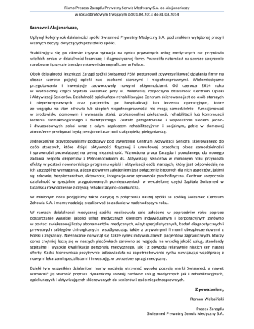 Pismo Prezesa Zarządu Prywatny Serwis Medyczny S.A. do Akcjonariuszy w roku obrotowym trwającym od 01.04.2013 do 31.03.2014 Szanowni Akcjonariusze, Upłynął kolejny rok działalności spółki Swissmed Prywatny Medyczny S.A. pod znakiem wytężonej pracy i ważnych decyzji dotyczących przyszłości spółki. Stabilizująca się po okresie kryzysu sytuacja na rynku prywatnych usług medycznych nie przyniosła wielkich zmian w działalności leczniczej i diagnostycznej firmy. Pozwoliła natomiast na szersze spojrzenie na obecne i przyszłe trendy rynkowe i demograficzne w Polsce. Obok działalności leczniczej Zarząd spółki Swissmed PSM postanowił zdywersyfikować działania firmy na obszar szeroko pojętej opieki nad osobami starszymi i niepełnosprawnymi. Wielomiesięczne przygotowania i inwestycje zaowocowały nowymi aktywnościami. Od czerwca 2014 roku w wydzielonej części Szpitala Swissmed przy ul. Wileńskiej rozpoczyna działalność Centrum Opieki i Aktywizacji Seniorów. Działalność opiekuńczo-rehabilitacyjna Centrum skierowana jest do osób starszych i niepełnosprawnych oraz pacjentów po hospitalizacji lub leczeniu operacyjnym, które ze względu na stan zdrowia lub stopień niepełnosprawności nie mogą samodzielnie funkcjonować w środowisku domowym i wymagają stałej, profesjonalnej pielęgnacji, rehabilitacji lub kontynuacji leczenia farmakologicznego i dietetycznego. Zostało przygotowane i wyposażone siedem jednoi dwuosobowych pokoi wraz z całym zapleczem rehabilitacyjnym i socjalnym, gdzie w domowej atmosferze przebywać będą pensjonariusze pod stałą opieką pielęgniarską. Jednocześnie przygotowaliśmy podstawy pod stworzenie Centrum Aktywizacji Seniora, skierowanego do osób starszych, które dzięki aktywności fizycznej i umysłowej przedłużą okres samodzielności i sprawności pozwalającej na pełną niezależność. Wzmożona praca Zarządu i powołanego do nowego zadania zespołu ekspertów z Pełnomocnikiem ds. Aktywizacji Seniorów w minionym roku przyniosła efekty w postaci nowatorskiego programu opieki i aktywizacji osób starszych, który jest odpowiedzią na ich szczególne wymagania, a jego głównym założeniem jest połączenie istotnych dla nich aspektów, jakimi są: zdrowie, bezpieczeństwo, aktywność, integracja oraz sprawność psychofizyczna. Centrum rozpocznie działalność w specjalnie przygotowanych pomieszczeniach w wydzielonej części Szpitala Swissmed w Gdańsku równocześnie z częścią rehabilitacyjno-opiekuńczą. W minionym roku podjęliśmy także decyzję o połączeniu naszej spółki ze spółką Swissmed Centrum Zdrowia S.A. i mamy nadzieję zrealizować to zadanie w nadchodzącym roku. W ramach działalności medycznej spółka realizowała cele założone w poprzednim roku poprzez dostarczanie wysokiej jakości usług medycznych klientom indywidualnym i korporacyjnym zarówno w postaci zwiększonej liczby abonamentów medycznych, wizyt specjalistycznych, badań diagnostycznych i prywatnych zabiegów chirurgicznych, współpracując także z prywatnymi firmami ubezpieczeniowymi z Polski i zagranicy. Nieznacznie rozwinął się także rynek indywidualnych pacjentów zagranicznych, którzy coraz chętniej leczą się w naszych placówkach zarówno ze względu na wysoką jakość usług, standardy szpitalne i wysokie kwalifikacje personelu medycznego, jak i z powodu relatywnie niskich cen naszej oferty. Kadra kierownicza pozytywnie odpowiadała na zapotrzebowanie rynku nawiązując współpracę z nowymi lekarzami specjalistami i inwestując w potrzebny sprzęt medyczny. Dzięki tym wszystkim działaniom mamy nadzieję utrzymać wysoką pozycję marki Swissmed, a nawet wzmocnić jej wartość poprzez dynamiczny rozwój zarówno usług medycznych jak i rehabilitacyjnych, opiekuńczych i aktywizujących skierowanych do seniorów i osób niepełnosprawnych. Z poważaniem, Roman Walasiński Prezes Zarządu Swissmed Prywatny Serwis Medyczny S.A.