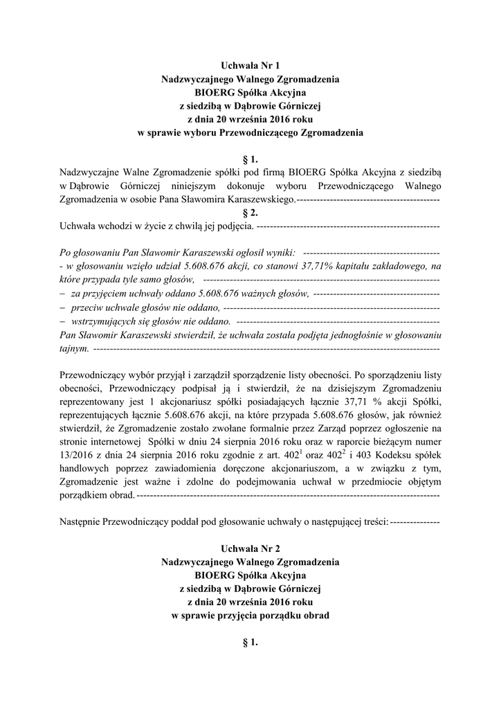 Uchwała Nr 1 Nadzwyczajnego Walnego Zgromadzenia BIOERG Spółka Akcyjna z siedzibą w Dąbrowie Górniczej z dnia 20 września 2016 roku w sprawie wyboru Przewodniczącego Zgromadzenia § 1. Nadzwyczajne Walne Zgromadzenie spółki pod firmą BIOERG Spółka Akcyjna z siedzibą w Dąbrowie Górniczej niniejszym dokonuje wyboru Przewodniczącego Walnego Zgromadzenia w osobie Pana Sławomira Karaszewskiego. ------------------------------------------§ 2. Uchwała wchodzi w życie z chwilą jej podjęcia. ------------------------------------------------------Po głosowaniu Pan Sławomir Karaszewski ogłosił wyniki: ----------------------------------------- w głosowaniu wzięło udział 5.608.676 akcji, co stanowi 37,71% kapitału zakładowego, na które przypada tyle samo głosów, ----------------------------------------------------------------------− za przyjęciem uchwały oddano 5.608.676 ważnych głosów, -------------------------------------− przeciw uchwale głosów nie oddano, ----------------------------------------------------------------− wstrzymujących się głosów nie oddano. ------------------------------------------------------------Pan Sławomir Karaszewski stwierdził, że uchwała została podjęta jednogłośnie w głosowaniu tajnym. -------------------------------------------------------------------------------------------------------Przewodniczący wybór przyjął i zarządził sporządzenie listy obecności. Po sporządzeniu listy obecności, Przewodniczący podpisał ją i stwierdził, że na dzisiejszym Zgromadzeniu reprezentowany jest 1 akcjonariusz spółki posiadających łącznie 37,71 % akcji Spółki, reprezentujących łącznie 5.608.676 akcji, na które przypada 5.608.676 głosów, jak również stwierdził, że Zgromadzenie zostało zwołane formalnie przez Zarząd poprzez ogłoszenie na stronie internetowej Spółki w dniu 24 sierpnia 2016 roku oraz w raporcie bieżącym numer 13/2016 z dnia 24 sierpnia 2016 roku zgodnie z art. 4021 oraz 4022 i 403 Kodeksu spółek handlowych poprzez zawiadomienia doręczone akcjonariuszom, a w związku z tym, Zgromadzenie jest ważne i zdolne do podejmowania uchwał w przedmiocie objętym porządkiem obrad. ------------------------------------------------------------------------------------------Następnie Przewodniczący poddał pod głosowanie uchwały o następującej treści: --------------Uchwała Nr 2 Nadzwyczajnego Walnego Zgromadzenia BIOERG Spółka Akcyjna z siedzibą w Dąbrowie Górniczej z dnia 20 września 2016 roku w sprawie przyjęcia porządku obrad § 1. Nadzwyczajne Walne Zgromadzenie spółki pod firmą BIOERG Spółka Akcyjna z siedzibą w Dąbrowie Górniczej niniejszym przyjmuje następujący porządek obrad: -------------------------1) Otwarcie Nadzwyczajnego Walnego Zgromadzenia; ------------------------------------------2) Wybór Przewodniczącego Nadzwyczajnego Walnego Zgromadzenia; ---------------------3) Stwierdzenie prawidłowości zwołania Nadzwyczajnego Walnego Zgromadzenia oraz jego zdolności do podejmowania ważnych uchwał; --------------------------------------------4) Przyjęcie porządku obrad Nadzwyczajnego Walnego Zgromadzenia; ----------------------5) Podjęcie uchwały w sprawie podwyższenia kapitału zakładowego Spółki w drodze subskrypcji zamkniętej oraz zmiany Statutu Spółki; -------------------------------------------6) Podjęcie uchwały w sprawie zmiany siedziby Spółki oraz zmiany Statutu Spółki; -------7) Podjęcie uchwały w sprawie zmiany nazwy Spółki oraz zmiany Statutu Spółki; ---------8) Podjęcie uchwał w sprawie zmiany składu Rady Nadzorczej Spółki; -----------------------9) Zamknięcie obrad. -----------------------------------------------------------------------------------§ 2. Uchwała wchodzi w życie z chwilą jej podjęcia. ------------------------------------------------------Po głosowaniu Przewodniczący ogłosił wyniki: ------------------------------------------------------- w głosowaniu wzięło udział 5.608.676 akcji, co stanowi 37,71% kapitału zakładowego, na które przypada tyle samo głosów, ----------------------------------------------------------------------− za przyjęciem uchwały oddano 5.608.676 ważnych głosów, -------------------------------------przeciw uchwale głosów nie oddano, -------------------------------------------------------------------− wstrzymujących się głosów nie oddano. ------------------------------------------------------------Przewodniczący stwierdził, że uchwała została podjęta jednogłośnie w głosowaniu jawnym. -Do punktów 5 - 6 porządku obrad: --------------------------------------------------------------------Przewodniczący poddał pod głosowanie uchwały o następującej treści: --------------------------Uchwała Nr 3 Nadzwyczajnego Walnego Zgromadzenia BIOERG Spółka Akcyjna z siedzibą w Dąbrowie Górniczej z dnia 20 września 2016 roku w sprawie podwyższenia kapitału zakładowego Spółki w drodze subskrypcji zamkniętej oraz zmiany Statutu Spółki Nadzwyczajne Walne Zgromadzenie Bioerg S. A. z siedzibą w Dąbrowie Górniczej (dalej: „Spółka”) na podstawie art. 430, art. 431 § 1 i § 2 pkt 2, art. 432 w związku z art. 310 § 2, art. 433 § 1 i art. 436 Kodeksu spółek handlowych postanawia podwyższyć kapitał zakładowy Spółki na następujących zasadach: -----------------------------------------------------------------------§ 1. 1. Podwyższa się kapitał zakładowy Spółki z kwoty 1.487.500,00 zł (słownie: jeden milion czterysta osiemdziesiąt siedem tysięcy pięćset złotych) do kwoty nie niższej niż 1.487.500,10 zł (słownie: jeden milion czterysta osiemdziesiąt siedem tysięcy pięćset złotych dziesięć groszy) i nie wyższej niż 11.900.000,00 zł (słownie: jedenaście milionów dziewięćset tysięcy złotych), to jest o kwotę nie mniejszą niż 0,10 zł (słownie: dziesięć groszy) i nie większą niż 10.412