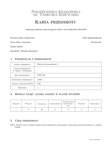 Politechnika Krakowska im. Tadeusza Kościuszki Karta przedmiotu obowiązuje studentów rozpoczynających studia w roku akademickim 2014/2015 Kierunek studiów: Budownictwo Profil: Ogólnoakademicki Forma sudiów: stacjonarne Kod kierunku: Stopień studiów: Specjalności: Wszystkie specjalności 1 Informacje o przedmiocie Nazwa przedmiotu Efektywna komunikacja () Nazwa przedmiotu w języku angielskim Kod przedmiotu Kategoria przedmiotu ogólny Liczba punktów ECTS 2.00 1 Semestry 2 3 CPiP/EK Rodzaj zajęć, liczba godzin w planie studiów Semestr Wykład Ćwiczenia Laboratorium Laboratorium komputerowe Projekt Seminarium 1 0 30 0 0 0 0 Cele przedmiotu Cel 1 Nabycie przez studenta praktycznych umiejętności poprawnego i skutecznego porozumiewania się z innymi ludźmi. Kod archiwizacji: Politechnika Krakowska im. Tadeusza Kościuszki 4 Wymagania wstępne w zakresie wiedzy, umiejętności i innych kompetencji 1 brak 5 Efekty kształcenia EK1 Wiedza Student posiada wiedzę dotyczącą procesów komunikowania interpersonalnego i społecznego, ich prawidłowości i zakłóceń. EK2 Umiejętności Student potra posługiwać się podstawowymi pojęciami teoretycznymi w celu analizowania motywów i wzorów ludzkich zachowań. EK3 Umiejętności Student ma rozwinięte umiejętności w zakresie komunikacji interpersonalnej, potra porozumiewać się w sposób precyzyjny i spójny przy użyciu różnych kanałów i technik komunikacyjnych. EK4 Kompetencje społeczne Student ma przekonanie o wadze zachowania się w sposób profesjonalny, jest przygotowany do aktywnego uczestnictwa w grupach i zdolny do porozumiewania się z ludźmi. 6 Treści programowe Ćwiczenia 7 Lp Tematyka zajęć Opis szczegółowy bloków tematycznych C1 Typy osobowości i ich znaczenie w relacjach międzyludzkich. 3 C2 Poprawna komunikacja werbalna: sztuka tworzenia pełnego komunikatu, analiza wewnętrznych stanów biorących udział w komunikacji. 5 C3 Sztuka słuchania: cele pseudosłuchania; bariery utrudniające uważne słuchanie; zasady skutecznego słuchania. 3 C4 Komunikacja niewerbalna: zależności przestrzenne; szczegółowa analiza gestów i postawy ciała; mimika twarzy a emocje. 8 C5 Parajęzyk: artykulacja, rezonans, tempo mówienia, siła głosu, wysokość dźwięku. Metakomunikaty oraz modykatory werbalne. 3 C6 Psychologiczne taktyki wywierania wpływu. 4 C7 Powszechnie stosowane taktyki autoprezentacyjne. 2 C8 Ukryte programy. 2 Narzędzia dydaktyczne N1 Prezentacje multimedialne N2 Inne Strona 2/6 Liczba godzin Politechnika Krakowska im. Tadeusza Kościuszki 8 Obciążenie pracą studenta Średnia liczba godzin na zrealizowanie aktywności Forma aktywności Godziny kontaktowe z nauczycielem akademickim, w tym: Godziny wynikające z planu studiów 30 Konsultacje przedmiotowe 15 Egzaminy i zaliczenia w sesji 0 Godziny bez udziału nauczyciela akademickiego wynikające z nakładu pracy studenta, w tym: Przygotowanie się do zajęć, w tym studiowanie zalecanej literatury 15 Opracowanie wyników 0 Przygotowanie raportu, projektu, prezentacji, dyskusji 0 Sumaryczna liczba godzin dla przedmiotu wynikająca z całego nakładu pracy studenta Sumaryczna liczba punktów ECTS dla przedmiotu 9 60 2.00 Sposoby oceny Ocena formująca F1 Ćwiczenie praktyczne Ocena podsumowująca P1 Zaliczenie ustne Kryteria oceny Efekt kształcenia 1 Na ocenę 3.0 Student słabo opanował wiedzę dotyczącą procesów komunikowania interpersonalnego i społecznego, ich prawidłowości i zakłóceń. Na ocenę 3.5 Student zadowalająco opanował wiedzę dotyczącą procesów komunikowania interpersonalnego i społecznego, ich prawidłowości i zakłóceń. Na ocenę 4.0 Student dobrze opanował wiedzę dotyczącą procesów komunikowania interpersonalnego i społecznego, ich prawidłowości i zakłóceń. Na ocenę 4.5 Student lepiej niż dobrze opanował wiedzę dotyczącą procesów komunikowania interpersonalnego i społecznego, ich prawidłowości i zakłóceń. Strona 3/6 Politechnika Krakowska im. Tadeusza Kościuszki Na ocenę 5.0 Student bardzo dobrze opanował wiedzę dotyczącą procesów komunikowania interpersonalnego i społecznego, ich prawidłowości i zakłóceń. Efekt kształcenia 2 Na ocenę 3.0 Student słabo potra posługiwać się podstawowymi pojęciami teoretycznymi w celu analizowania motywów i wzorów ludzkich zachowań. Na ocenę 3.5 Student zadowalająco potra posługiwać się podstawowymi pojęciami teoretycznymi w celu analizowania motywów i wzorów ludzkich zachowań. Na ocenę 4.0 Student dobrze potra posługiwać się podstawowymi pojęciami teoretycznymi w celu analizowania motywów i wzorów ludzkich zachowań. Na ocenę 4.5 Student lepiej niż dobrze potra posługiwać się podstawowymi pojęciami teoretyczny- mi w celu analizowania motywów i wzorów ludzkich zachowań. Na ocenę 5.0 Student bardzo dobrze potra posługiwać się podstawowymi pojęciami teoretycznymi w celu analizowania motywów i wzorów ludzkich zachowań. Efekt kształcenia 3 Na ocenę 3.0 Student ma słabo rozwinięte umiejętności w zakresie komunikacji interpersonalnej, w słabym stopniu potra porozumiewać się w sposób precyzyjny i spójny przy użyciu różnych kanałów i technik komunikacyjnych. Na ocenę 3.5 Student ma zadowalająco rozwinięte umiejętności w zakresie komunikacji interpersonalnej, w zadowalającym stopniu potra porozumiewać się w sposób precyzyjny i spój- ny przy użyciu różnych kanałów i technik komunikacyjnych. Na ocenę 4.0 Student ma dobrze rozwinięte umiejętności w zakresie komunikacji interpersonalnej, dobrze potra porozumiewać się w sposób precyzyjny i spójny przy użyciu różnych kanałów i technik komunikacyjnych. Na ocenę 4.5 Student ma lepiej niż dobrze rozwinięte umiejętności w zakresie komunikacji interpersonalnej, lepiej niż dobrze potra porozumiewać się w sposób precyzyjny i spójny przy użyciu różnych kanałów i technik komunikacyjnych. Na ocenę 5.0 S