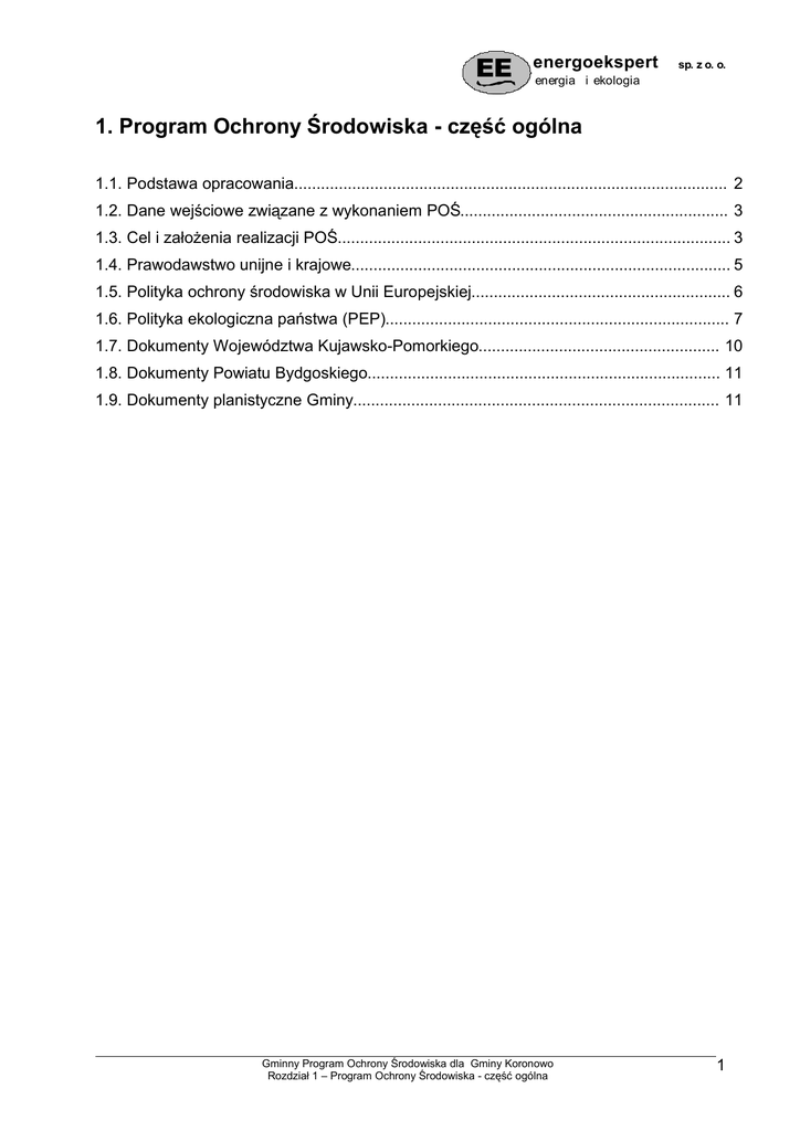 EE energoekspert sp. z o. o. energia i ekologia 1. Program Ochrony Środowiska - część ogólna 1.1. Podstawa opracowania................................................................................................. 2 1.2. Dane wejściowe związane z wykonaniem POŚ............................................................ 3 1.3. Cel i założenia realizacji POŚ........................................................................................ 3 1.4. Prawodawstwo unijne i krajowe..................................................................................... 5 1.5. Polityka ochrony środowiska w Unii Europejskiej.......................................................... 6 1.6. Polityka ekologiczna państwa (PEP)............................................................................. 7 1.7. Dokumenty Województwa Kujawsko-Pomorkiego...................................................... 10 1.8. Dokumenty Powiatu Bydgoskiego............................................................................... 11 1.9. Dokumenty planistyczne Gminy.................................................................................. 11 Gminny Program Ochrony Środowiska dla Gminy Koronowo Rozdział 1 – Program Ochrony Środowiska - część ogólna 1 EE energoekspert sp. z o. o. energia i ekologia 1.1. Podstawa opracowania Podstawę opracowania „Gminnego Programu Ochrony Środowiska dla Gminy Koronowo" stanowią: a) Ustalenia umowne określone w Umowie zawartej w dniu 14.01.2004 pomiędzy Ø Gminą Koronowo, pl. Zwycięstwa 1, 86 - 010 Koronowo, Ø a firmą Energoekspert Sp. z o.o. z siedzibą w Katowicach ul. Węglowa 7, 40-105 Katowice. b) Ustalenia Art. 14 i 17 ustawy Prawo Ochrony Środowiska z dnia 27 kwietnia 2001r. (Dz. U. z 2001r. 62/627, 115/1229, z 2002r. 74/676, 113/984, 153/1271, 233/1957, z 2003r. 46/392, 80/717, 80/721, 162/1568, 175/1693, 190/1865). Art. 14. 1. Polityka ekologiczna państwa, na podstawie aktualnego stanu środowiska, określa w szczególności: 1) cele ekologiczne, 2) priorytety ekologiczne, 3) rodzaj i harmonogram działań proekologicznych, 4) środki niezbędne do osiągnięcia celów, w tym mechanizmy prawno-ekonomiczne i środki finansowe. 2. Politykę ekologiczną państwa przyjmuje się na 4 lata, z tym że przewidziane w niej działania w perspektywie obejmują kolejne 4 lata. (...) Art. 17. 1. Organ wykonawczy województwa, powiatu i gminy w celu realizacji polityki ekologicznej państwa, sporządza odpowiednio wojewódzkie, powiatowe i gminne programy ochrony środowiska, uwzględniając wymagania, o których mowa w art. 14. 2. Projekty programów ochrony środowiska są opiniowane odpowiednio przez organ wykonawczy jednostki wyższego szczebla lub ministra właściwego do spraw środowiska. 3. W miastach, w których funkcje organów powiatu sprawują organy gminy, program ochrony środowiska obejmuje działania powiatu i gminy. c) Ustalenia Art. 10 ustawy o wprowadzeniu ustawy - Prawo ochrony środowiska, ustawy o odpadach oraz o zmianie niektórych ustaw z dnia 27 lipca 2001 r. (Dz. U. z 2001r. 100/1085, 115/1229, z 2002r. 143/1196, z 2003r. 7/78, 80/717, 190/1865). "Gminny Program Ochrony Środowiska dla gminy Koronowo" wykonano zgodnie z: Þ Ustawą z dnia 27 kwietnia 2001r. Prawo Ochrony Środowiska. Þ II Polityką Ekologiczną Państwa, przyjętą przez Radę Ministrów w czerwcu 2000r. Þ Programem wykonawczym do II Polityki Ekologicznej Państwa, przyjętym przez Radę Ministrów w listopadzie 2002r. Þ Polityką Ekologiczną Państwa na lata 2003-2006 z uwzględnieniem perspektywy na lata 2007-2010; przyjętą przez Rada Ministrów w grudniu 2002r. Þ Wytycznymi sporządzania programów ochrony środowiska na szczeblu regionalnym i lokalnym; wydanymi przez Ministerstwo Środowiska w grudniu 2002r. Ponadto Program uwzględnia zapisy zawarte w: Gminny Program Ochrony Środowiska dla Gminy Koronowo Rozdział 1 – Program Ochrony Środowiska - część ogólna 2 EE ¨ ¨ ¨ ¨ ¨ ¨ ¨ ¨ ¨ ¨ ¨ energoekspert sp. z o. o. energia i ekologia Strategii Rozwoju Województwa Kujawsko-Pomorskiego, Toruń 1999 r. Programie Ochrony Środowiska Województwa Kujawsko-Pomorskiego, Toruń 2003 r. Strategii Rozwoju Turystyki w Województwie Kujawsko-Pomorskim, 2003 r. Powiatowym Planie Gospodarki Odpadami dla Powiatu Bydgoskiego na lata 20042007 z perspektywą na lata 2008-2011, Powiatowym Programie Ochrony Środowiska dla Powiatu Bydgoskiego na lata 20042007 z perspektywą na lata 2008-2011, Studium uwarunkowań i kierunków zagospodarowania przestrzennego Miasta Koronowo, Studium uwarunkowań i kierunków zagospodarowania przestrzennego Gminy Koronowo, Strategii Rozwoju Miasta i Gminy Koronowo 2001-2015, Programie Realizacji Strategii na lata 2001-2004, Programie Kanalizacji Gminy Koronowo na lata 2003-2015, Programie: Turystyka Szansą Rozwoju Miasta i Gminy Koronowo, Bydgoszcz 2002. 1.2. Dane wejściowe związane z wykonaniem POŚ Główne urzędy i instytucje, z którymi współpracowano przy gromadzeniu materiałów stanowiących dane wejściowe do POŚ § Urząd Miejski w Koronowie, Plac Zwycięstwa 1, 86 - 010 Koronowo, § Starostwo Powiatowe, 85 - 066 Bydgoszcz, ul. Konarskiego 1/3, § Nadleśnictwo Różanna, 86 - 010 Koronowo, ul. Leśna 5, § Nadleśnictwo Runowo, 89 - 421 Runowo Krajeńskie, § Nadleśnictwo Żołędowo, 86 - 031 Osielsko, Żołędowo 126, § Nadleśnictwo Zamrzenica, 89-510 Bysław, § Okręgowa Stacja Chemiczno - Rolnicza w Bydgoszczy. Spis planów i opracowań, które były danymi wejściowymi do wykonania POŚ Program powstał w oparciu o dane pochodzące z licznych źródeł. Są to przede wszystkim: 1. Opracowania i materiały udostępnione przez Urząd Gminy Koronowo 2. Dane zebrane przez zespół autorów Programu. 3. Opracowania i raporty takich instytucji jak m.in.: - Ministerstwo Ochrony Środowiska, - Wojewódzki Inspektorat Ochrony Środowiska w Bydgoszczy, - Wojewódzkiego Urzędu Statystycznego. 