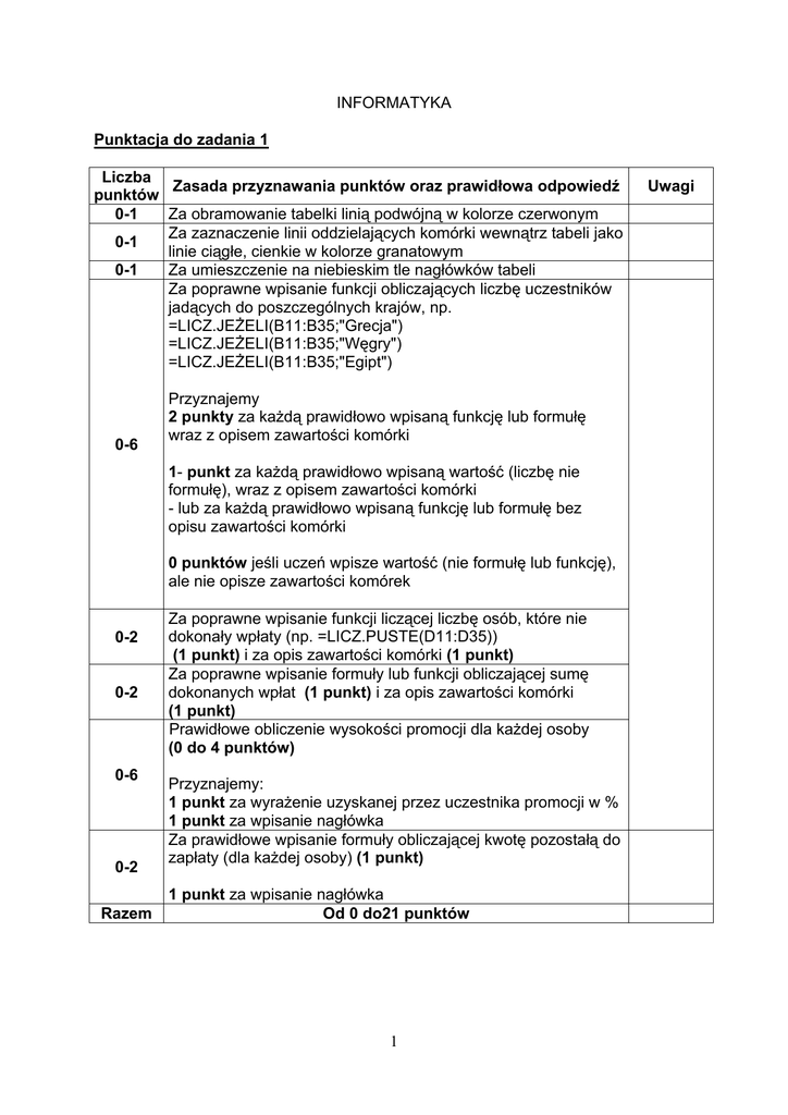 INFORMATYKA Punktacja do zadania 1 Liczba Zasada przyznawania punktów oraz prawidłowa odpowiedź punktów Za obramowanie tabelki linią podwójną w kolorze czerwonym 0-1 Za zaznaczenie linii oddzielających komórki wewnątrz tabeli jako 0-1 linie ciągłe, cienkie w kolorze granatowym Za umieszczenie na niebieskim tle nagłówków tabeli 0-1 Za poprawne wpisanie funkcji obliczających liczbę uczestników jadących do poszczególnych krajów, np. =LICZ.JEŻELI(B11:B35;"Grecja") =LICZ.JEŻELI(B11:B35;"Węgry") =LICZ.JEŻELI(B11:B35;"Egipt") 0-6 Przyznajemy 2 punkty za każdą prawidłowo wpisaną funkcję lub formułę wraz z opisem zawartości komórki 1- punkt za każdą prawidłowo wpisaną wartość (liczbę nie formułę), wraz z opisem zawartości komórki - lub za każdą prawidłowo wpisaną funkcję lub formułę bez opisu zawartości komórki 0 punktów jeśli uczeń wpisze wartość (nie formułę lub funkcję), ale nie opisze zawartości komórek 0-2 0-2 0-6 0-2 Razem Za poprawne wpisanie funkcji liczącej liczbę osób, które nie dokonały wpłaty (np. =LICZ.PUSTE(D11:D35)) (1 punkt) i za opis zawartości komórki (1 punkt) Za poprawne wpisanie formuły lub funkcji obliczającej sumę dokonanych wpłat (1 punkt) i za opis zawartości komórki (1 punkt) Prawidłowe obliczenie wysokości promocji dla każdej osoby (0 do 4 punktów) Przyznajemy: 1 punkt za wyrażenie uzyskanej przez uczestnika promocji w % 1 punkt za wpisanie nagłówka Za prawidłowe wpisanie formuły obliczającej kwotę pozostałą do zapłaty (dla każdej osoby) (1 punkt) 1 punkt za wpisanie nagłówka Od 0 do21 punktów 1 Uwagi Punktacja do zadania 2 Liczba punktów Zasada przyznawania punktów oraz prawidłowa odpowiedź Za przekopiowanie i zmianę nazwy pliku zadanie2.mdb na rozwiązanie2.mdb Uwagi 0-1 Uczeń otrzymuje 1 punkt, gdy spełnione są oba warunki Za przygotowanie raportu zawierającego tylko następujące dane: imię, nazwisko, adres. 0-1 Uczeń otrzymuje 1 punkt, gdy w raporcie znajdują się wszystkie wskazane pola Za wybranie z bazy danych do raportu osób podróżujących do Egiptu 0-1 0-1 0-1 0-1 0-10 Razem Uczeń otrzymuje 1 punkt, gdy w raporcie znajdują się wszystkie osoby spełniające warunek i nie ma w nim innych osób 1 punkt za uporządkowanie listy według obu podanych kryteriów 1 punkt za nadanie tytułu Uczestnicy wycieczki do Egiptu liście osób wyjeżdżających do Egiptu 1 punkt za dodanie pola Zdjęcie do tabeli bazy danych Uczestnicy wycieczki 1 punkt za każdy element, który powinien się znaleźć na formularzu (imię, nazwisko, data urodzenia, adres, kraj docelowy, zdjęcie, etykieta formularza o treści: „Formularz zgłoszeniowy”, ClipArt - jako logo firmy, tło, wstawione przynajmniej 1 zdjęcie) Od 0 do 16 punktów 2 . Punktacja do zadania 3 Liczba punktów 0-1 0-3 0-2 0-1 0-2 0-1 Razem Zasada przyznawania punktów oraz prawidłowa odpowiedź 1 punkt za ustalenie formatu A4 i orientacji pionowej papieru Za umieszczenie wskazanych obiektów w logo firmy (1 punkt za 1 obiekt) Za umieszczenie informacji o nazwie firmy i adresie firmy oraz podanie numeru telefonu (1 punkt) w polu tekstowym (1 punkt) Za zgrupowanie elementów logo firmy z danymi o firmie Za umieszczenie w dokumencie tabeli zawierającej listę uczestników wycieczki wraz z uzupełnionymi danymi, znajdującą się w pliku rozwiązanie1.xls (1 punkt) oraz za dostosowanie układu strony do rozmiarów tabeli (1 punkt) 1 punkt za umieszczenie w dokumencie raportu utworzonego w zadaniu nr 2 Od 0 do 10 punktów Uwagi Punktacja do zadania 4 Liczba punktów 0-2 0-2 0-3 0-1 0-2 0-1 Razem Zasada przyznawania punktów oraz prawidłowa odpowiedź Za poprawne zastosowanie bloków wprowadzania informacji (przypisanie zmiennym a, b wartości) Za poprawne zastosowanie bloku warunkowego (za sprawdzenie warunków a=0, b=0) Za poprawne zastosowanie bloku wyprowadzania informacji (za poprawne instrukcje pozwalające na monitorze wyświetlić informacje: np. „nieskończenie wiele rozwiązań”, „brak rozwiązań”, „x=.....”) 1 punkt za poprawne zastosowanie bloku z instrukcją przypisania x:= -b/a Za prawidłowe rozpoczęcie i zakończenie schematu odpowiednio blokami początku i końca 1 punkt za zapisanie projektu na dysku zgodnie z warunkami zadania Od 0 do 11 punktów 3 Uwagi 1 punkt za poprawne określenie zmiennej 1 punkt za każdy warunek