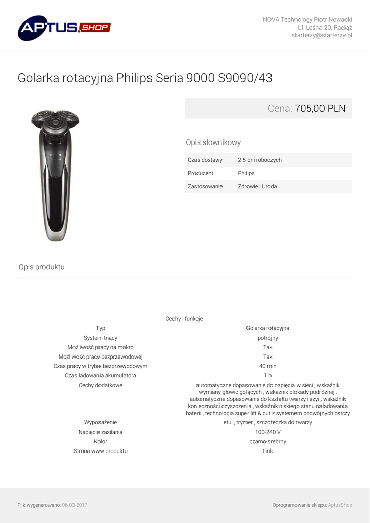 NOVA Technology Piotr Nowacki Ul. Leśna 20, Raciąż [email protected] Golarka rotacyjna Philips Seria 9000 S9090/43 Cena: 705,00 PLN Opis słownikowy Czas dostawy 2-5 dni roboczych Producent Philips Zastosowanie Zdrowie i Uroda Opis produktu Cechy i funkcje Typ Golarka rotacyjna System tnący potrójny Możliwość pracy na mokro Tak Możliwość pracy bezprzewodowej Tak Czas pracy w trybie bezprzewodowym 40 min Czas ładowania akumulatora 1h Cechy dodatkowe automatyczne dopasowanie do napięcia w sieci , wskaźnik wymiany głowic golących , wskaźnik blokady podróżnej , automatyczne dopasowanie do kształtu twarzy i szyi , wskaźnik konieczności czyszczenia , wskaźnik niskiego stanu naładowania baterii , technologia super lift & cut z systemem podwójnych ostrzy Wyposażenie etui , trymer , szczoteczka do twarzy Napięcie zasilania 100-240 V Kolor czarno-srebrny Strona www produktu Link Plik wygenerowano: 06-03-2017 Oprogramowanie sklepu: AptusShop NOVA Technology Piotr Nowacki Ul. Leśna 20, Raciąż [email protected] Plik wygenerowano: 06-03-2017 Powered by TCPDF (www.tcpdf.org) Oprogramowanie sklepu: AptusShop