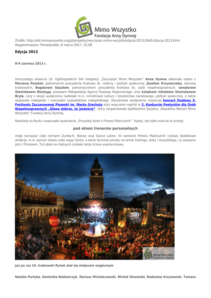 Źródło: http://old.mimowszystko.org/pl/projekty/zwyciezac-mimo-wszystk/edycja-2013/2645,Edycja-2013.html Wygenerowano: Poniedziałek, 6 marca 2017, 22:08 Edycja 2013 8-9 czerwca 2013 r. Uroczystego otwarcia 10. Ogólnopolskich Dni Integracji „Zwyciężać Mimo Wszystko” Anna Dymna dokonała razem z Marzeną Paszkot, pełnomocnik prezydenta Krakowa ds. rodziny i polityki społecznej, Józefem Krzyworzeką, starostą krakowskim, Bogdanem Dąsalem, pełnomocnikiem prezydenta Krakowa ds. osób niepełnosprawnych, senatorem Stanisławem Bisztygą, prezesem Małopolskiej Agencji Rozwoju Regionalnego, oraz księdzem infułatem Stanisławem Bryłą. Listy z okazji wydarzenia nadesłali m.in. ministrowie kultury i dziedzictwa narodowego, polityki społecznej, a także wojewoda małopolski i marszałek województwa małopolskiego. Dwudniowe wydarzenie rozpoczął koncert finałowy 9. Festiwalu Zaczarowanej Piosenki im. Marka Grechuty oraz wręczenie nagród w 2. Konkursie Poetyckim dla Osób Niepełnosprawnych „Słowa dobrze, że jesteście”, który zorganizowała Spółdzielnia Socjalna „Republika Marzeń Mimo Wszystko” Fundacji Anny Dymnej. Niedzielę na Rynku rozpoczęło wydarzenie „Przywitaj dzień z Fitness Platinium®”. Każdy, kto tylko miał na to ochotę pod okiem trenerów personalnych mógł rozruszać ciało rytmami Zumby®, Bokwy oraz Dance Latino. W namiocie Fitness Platinium® czekały dodatkowe atrakcje, m.in. pomiar składu ciała wagą Tanita, a także fachowe porady na temat treningu, diety i wszystkiego, co związane jest z fitnessem. Tuż obok na chętnych czekała także ściana wspinaczkowa. Już po raz 10. krakowski Rynek stał się miejscem magicznym Natalia Partyka, Dominika Bednarczyk, Dariusz Michalczewski, Michał Olszański, Radosław Krzyżowski, Tomasz Schimscheiner, Cezary Kosiński, Zbigniew Zamachowski, Janek Mela, Justyna Kozdryk, Przemysław Kowalik, Piotr Szymeczek, Jarosław Rola, Tomasz Hamerlak, sportowcy po transplantacji, na wózkach, niepełnosprawni koszykarze, lekkoatleci, rugbiści, ampfutboliści, szemierze, ciężarowcy – w drugim dniu 10. Ogólnopolskich Dni Integracji „Zwyciężać Mimo Wszystko” płyta krakowskiego Rynku zamieniła się w arenę sportowych zmagań. Emocji nie brakowało. Wyczyny wybitnych zawodników i gwiazd ekranu w pełni potwierdziły słowa Krzysztofa Głombowicza o tym, że niepełnosprawność to jedynie stan umysłu, który ze sprawnością ciała niewiele ma wspólnego. – Wzruszające, niesamowite wrażenia – powiedział Michał Olszański, który wspólnie z Krzysztofem Głombowiczem, prowadził na Rynku wydarzenia sportowe. – Zadziwia fakt, jak ogromna jest wewnętrzna siła człowieka. Ci ludzie ją demonstrują. Wiem jednak, że promowanie sportu osób niepełnosprawnych nie jest sprawą prostą. Należy to robić krok po kroku, bardzo systematycznie. Anna Dymna jest jedną z tych, którzy mają niezwykły dar i charyzmę, by edukować Polaków w tej dziedzinie. Na scenie pod Ratuszem pojawia się chluba naszego pięściarstwa Dariusz Michalczewski przyznał, że pomimo iż w Polsce zmienia się społeczny wizerunek osoby niepełnosprawnej, to jednak, w stosunku do Zachodu, jesteśmy pod tym względem zapóźnieni o kilkadziesiąt lat. – Dlatego tu jestem – tłumaczył bokser. – Chcę, żeby tych ludzi Polacy traktowali wreszcie normalnie. W naszym kraju normalnie, niestety, nie jest. Zaświadczyły o tym słowa Natalii Partyki. Nasza czołowa tenisistka stołowa, która na krakowskim Rynku wystąpiła w pokazowym pojedynku, wyznała, że za granicą dziennikarzy interesują wyłącznie jej sukcesy. Natomiast w Polsce żurnaliści wciąż pytają ją głównie o to, w jaki sposób godzi swoją niepełnosprawność z uprawianiem sportu. Rugby na wózkach Jedną z największych atrakcji dnia był z pewnością dla publiczności mecz siatkówki pomiędzy zawodnikami po przeszczepach i gwiazdami. Chociaż… Trudno ten pojedynek nazwać meczem. Co prawda rozegrano dwa sety, ale potem zawodnicy obu drużyn zaczęli po prostu zwyczajnie się bawić. Na przykład przechodzili wszyscy na jedną stronę boiska i, ku uciesze publiczności, wybijali piłkę w puste, przeciwległe pole. A działo się to nie bez zgody sędziego. Ten, w swej olbrzymiej fantazji, karał drużyny przykładowo tylko za to, że jeden zawodnik podeptał na boisku cień drugiego „To dopiero integracja!” – wołano radośnie od strony publiczności, kiedy wszyscy zawodnicy położyli się wspólnie na boisku i zaczęli pozować do zdjęć. Sporych emocji dostarczyła także rozgrywka piłkarzy korporacji „Barbakan Taxi” (pierwszego sponsora Fundacji Anny Dymnej „Mimo Wszystko”) z reprezentacją Polski w ampfutbolu. Panowie taksówkarze pokonali ampfutbolistów 3:0. Część sportową 10. Ogólnopolskich Dni Integracji „Zwyciężać Mimo Wszystko” zakończył strzał Krzysztofa Głombowicza do bramki, w której stanęła Anna Dymna. Aktorka gola nie wpuściła. Pojedynek piłkarzy po aputacjach „Dziwny jest ten świat…” – punktualnie o 21.00 zabrzmiał na krakowskim Rynku śpiew niewidomego Grzegorza Dowgiałło i laureatów tegorocznego Festiwalu Zaczarowanej Piosenki. Utwór Czesława Niemena zainaugurował wieczorny koncert „Razem Mimo Wszystko”. Publiczność powitali prowadzący wydarzenie: Anna Dymna i Piotr Polk. Finaliści 9. Festiwalu Zaczarowanej Piosenki podczas wieczornego konceru – Wiem na pewno, że ratunkiem dla człowieka zawsze jest drugi człowiek. Zaprosiłam dzisiaj do Krakowa ludzi, dla których nie ma rzeczy niemożliwych, a słowa „bariera”, „ograniczenie” są abstrakcją. W trudnych chwilach myślę o nich, o ich wyczynach i biorę się w garść – powiedziała aktorka, zapowiadając pojawienie się na scenie naszych wybitnych paraolimpijczyków. Wchodzili na nią kolejno: Justyna Kozdryk (podnoszenie ciężarów), Natalia Partyka (tenis stołowy), Joan