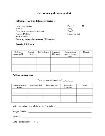 Formularz pobrania próbki Informacje ogólne dotyczące pacjenta Imię i nazwisko: Adres: Data urodzenia (dd/mm/rrrr): Numer PESEL: Miasto/wieś: Data wystąpienia choroby (dd/mm/rrrr): Płeć: K [ ] M [ ] Kraj: Zawód: Narodowość: Próbka kliniczna Unikalny numer próbki Rodzaj próbki Data pobrania Diagnoza kliniczna Stan pacjenta przy pobraniu próbki Uwagi Próbka pośmiertna Data zgonu (dd/mm/rrrr):__/__/___ Unikalny numer próbki Rodzaj próbki Data pobrania Diagnoza kliniczna Uwagi Imię i nazwisko wypełniającego formularz: _____________________________ Instytut/zakład: ___________________________________________________ Kontakt: _________________________________________________________ Data (dd/mm/rrrr): __/__/___