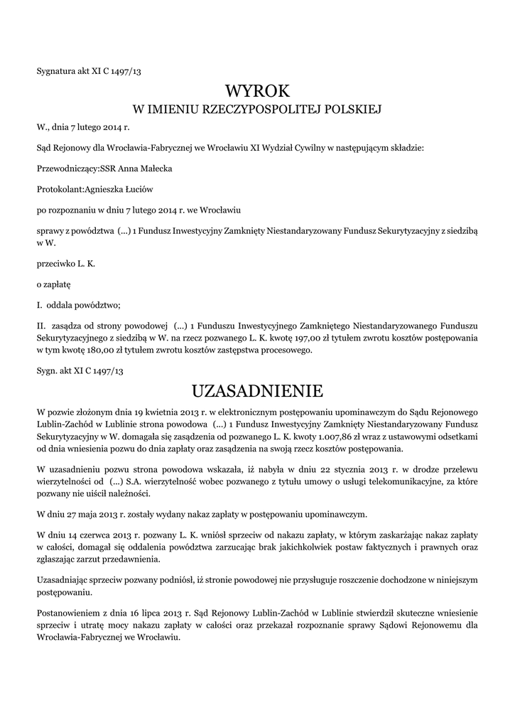 Sygnatura akt XI C 1497/13 WYROK W IMIENIU RZECZYPOSPOLITEJ POLSKIEJ W., dnia 7 lutego 2014 r. Sąd Rejonowy dla Wrocławia-Fabrycznej we Wrocławiu XI Wydział Cywilny w następującym składzie: Przewodniczący:SSR Anna Małecka Protokolant:Agnieszka Łuciów po rozpoznaniu w dniu 7 lutego 2014 r. we Wrocławiu sprawy z powództwa (...) 1 Fundusz Inwestycyjny Zamknięty Niestandaryzowany Fundusz Sekurytyzacyjny z siedzibą w W. przeciwko L. K. o zapłatę I. oddala powództwo; II. zasądza od strony powodowej (...) 1 Funduszu Inwestycyjnego Zamkniętego Niestandaryzowanego Funduszu Sekurytyzacyjnego z siedzibą w W. na rzecz pozwanego L. K. kwotę 197,00 zł tytułem zwrotu kosztów postępowania w tym kwotę 180,00 zł tytułem zwrotu kosztów zastępstwa procesowego. Sygn. akt XI C 1497/13 UZASADNIENIE W pozwie złożonym dnia 19 kwietnia 2013 r. w elektronicznym postępowaniu upominawczym do Sądu Rejonowego Lublin-Zachód w Lublinie strona powodowa (...) 1 Fundusz Inwestycyjny Zamknięty Niestandaryzowany Fundusz Sekurytyzacyjny w W. domagała się zasądzenia od pozwanego L. K. kwoty 1.007,86 zł wraz z ustawowymi odsetkami od dnia wniesienia pozwu do dnia zapłaty oraz zasądzenia na swoją rzecz kosztów postępowania. W uzasadnieniu pozwu strona powodowa wskazała, iż nabyła w dniu 22 stycznia 2013 r. w drodze przelewu wierzytelności od (...) S.A. wierzytelność wobec pozwanego z tytułu umowy o usługi telekomunikacyjne, za które pozwany nie uiścił należności. W dniu 27 maja 2013 r. zostały wydany nakaz zapłaty w postępowaniu upominawczym. W dniu 14 czerwca 2013 r. pozwany L. K. wniósł sprzeciw od nakazu zapłaty, w którym zaskarżając nakaz zapłaty w całości, domagał się oddalenia powództwa zarzucając brak jakichkolwiek postaw faktycznych i prawnych oraz zgłaszając zarzut przedawnienia. Uzasadniając sprzeciw pozwany podniósł, iż stronie powodowej nie przysługuje roszczenie dochodzone w niniejszym postępowaniu. Postanowieniem z dnia 16 lipca 2013 r. Sąd Rejonowy Lublin-Zachód w Lublinie stwierdził skuteczne wniesienie sprzeciw i utratę mocy nakazu zapłaty w całości oraz przekazał rozpoznanie sprawy Sądowi Rejonowemu dla Wrocławia-Fabrycznej we Wrocławiu. W piśmie przygotowawczym złożonym dnia 25 października 2013 r. strona powodowa wskazała, iż pozwany związany był z pierwotnym wierzycielem – (...) S.A. umową o świadczenie usług telekomunikacyjnych. Wierzytelności z tego tytułu zostały przeniesione na stronę powodową, na dowód czego strona powodowa wnosi o dopuszczenie dowodu z opinii biegłego z dziedziny księgowości w przypadku kwestionowania przez pozwanego zawarcia umowy i braku zapłaty kwot wskazanych w fakturach. Natomiast w przypadku kwestionowania przez pozwanego faktu, iż jego dług był przedmiotem przelewu wierzytelności, strona powodowa wnosi o dopuszczenie dowodu z załącznika do umowy przelewu. Jednocześnie strona pozwana sprecyzowała, iż na dochodzoną pozwem kwotę składają się: kwota 950,00 zł tytułem płatności za fakturę VAT z dnia 9 października 2012 r., z terminem wymagalności przypadającym w dniu 23 października 2012 r. oraz kwota 57,86 zł tytułem odsetek ustawowych za okres od dnia 23 października 2012 r. do dnia 12 kwietnia 2013 r. W odpowiedzi na sprzeciw wniesionej w elektronicznym postępowaniu upominawczym, ujętej w piśmie strony powodowej z dnia 17 grudnia 2013 r., (...) 1 Fundusz Inwestycyjny Zamknięty Niestandaryzowany Fundusz Sekurytyzacyjny w W. wskazał iż nie upłynął 3-letni termin przedawnienia, ponieważ data wymagalności przedmiotowego roszczenia przypada na dzień 23 października 2012 r., a przerywający bieg roszczenia pozew strony powodowej został złożony dnia 22 kwietnia 2013 r. Strona powodowa podała, że pozwany związany był z pierwotnym wierzycielem umową zawartą na czas określony 24 miesięcy, zobowiązując się do przestrzegania warunków określonych w umowie, regulaminie świadczenia usług i cenniku. Pozwany był zobowiązany między innymi do zwrotu zestawu urządzeń multimedialnych LiveBox w terminie 14 dni od dnia wygaśnięcia, rozwiązania, odstąpienia od umowy lub zmiany sposobu świadczenia usług pod rygorem obciążenia opłatą określoną w cenniku, zaś pozwany po zaistnieniu tych okoliczności uchybił wskazanemu terminowi, skutkiem czego został obciążony opłatą określoną w cenniku. W sprzeciwie wniesionym dnia 8 grudnia 2013 r. pozwany L. K. wniósł o oddalenie powództwa w całości, zarzucając nieprzedstawienie wszystkich istotnych dla sprawy okoliczności, co skutkuje brakiem podstawy żądania co do zasady i co do wysokości, jak również brak jakichkolwiek podstaw faktycznych i prawnych oraz nieistnienie roszczenia cedenta względem pozwanego; pozwany zarzucił także brak udowodnienia roszczenia przez stronę powodową co do zasady i wysokości oraz brak udowodnienia dokonania cesji wierzytelności na rzecz strony powodowej. W uzasadnieniu sprzeciwu pozwany wskazał, iż pozwany spełnił obowiązki wynikające z umowy zawartej w (...) S.A. Nadto pozwany podniósł, że nie zostało udowodnione przez stronę powodową, iż nabyła ona wierzytelność przeciwko pozwanemu. Sąd ustalił następujący stan faktyczny: Dnia 4 maja 2009 r. L. K. zawarł z (...) S.A. umowę „(...)” numer (...)DWIE, której przedmiotem było świadczenie zestawu usług: neostrada tp i usługa tv na zasadach określonych w umowie, regulaminach i cennikach promocji i ofert okresowych. W umowie nie określono czy została zawarta na czas nieokreślony czy określony długości 24 miesięcy (§ 2). Cennik usługi „(...)” przewidywał między innymi kary umowne za uszkodzenie, utratę lub niezwrócenie po zakończeniu świadczenia usługi platformy multimedialnej tp w wysokości 300,00 zł, karę umowną naliczana w przypadku utraty lub niezwrócenia dekodera przez abonenta w kwocie 600,00 zł oraz karę umowną w ob