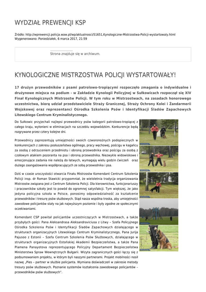 WYDZIAŁ PREWENCJI KSP Źródło: http://wprewencji.policja.waw.pl/wp/aktualnosci/51651,Kynologiczne-Mistrzostwa-Policji-wystartowaly.html Wygenerowano: Poniedziałek, 6 marca 2017, 21:59 Strona znajduje się w archiwum. KYNOLOGICZNE MISTRZOSTWA POLICJI WYSTARTOWAŁY! 17 drużyn przewodników z psami patrolowo-tropiącymi rozpoczęło zmagania o indywidualne i drużynowe miejsca na podium - w Zakładzie Kynologii Policyjnej w Sułkowicach rozpoczął się XIV Finał Kynologicznych Mistrzostw Policji. W tym roku w Mistrzostwach, na zasadach honorowego uczestnictwa, biorą udział przedstawiciele Straży Granicznej, Straży Ochrony Kolei i Żandarmerii Wojskowej oraz reprezentanci Ośrodka Szkolenia Psów i Identyfikacji Śladów Zapachowych Litewskiego Centrum Kryminalistycznego. Do Sułkowic przyjechali najlepsi przewodnicy psów kategorii patrolowo-tropiącej z całego kraju, wyłonieni w eliminacjach na szczeblu wojewódzkim. Konkurencje będą rozgrywane przez cztery kolejne dni. Przewodnicy zaprezentują umiejętności swoich czworonożnych podopiecznych w konkurencjach z zakresu posłuszeństwa ogólnego, pracy węchowej, pościgu w kagańcu za osobą z odrzuceniem przedmiotu i obroną przewodnika oraz pościgu za osobą z czołowym atakiem pozoranta na psa i obroną przewodnika. Niezwykle widowiskowe i emocjonujące zadania nie należą do łatwych, wymagają wielu godzin ćwiczeń oraz dużego zaangażowania współpracujących ze sobą przewodnika i psa. Dziś w czasie uroczystości otwarcia Finału Mistrzostw Komendant Centrum Szkolenia Policji insp. dr Roman Stawicki przypomniał, że wieloletnia tradycja organizowania Mistrzostw związana jest z Centrum Szkolenia Policji. Dla kierownictwa, funkcjonariuszy i pracowników szkoły jest to powód do ogromnej satysfakcji. Tym większej, że jako jedyna policyjna szkoła w Polsce, ponosimy odpowiedzialność za kształcenie przewodników i tresurę psów służbowych. Stąd nasza wspólna troska, aby umiejętności zawodowe policjantów stały na jak najwyższym poziomie i były zgodne ze społecznymi oczekiwaniami. Komendant CSP powitał policjantów uczestniczących w Mistrzostwach, a także przybyłych gości: Pana Aleksandrasa Aleksandraviciusa z Litwy – Szefa Policyjnego Ośrodka Szkolenia Psów i Identyfikacji Śladów Zapachowych działającego w strukturach organizacyjnych Litewskiego Centrum Kryminalistycznego, Pana Jurija Pajusoo z Estonii – Szefa Centrum Szkolenia Psów Służbowych, działającego w strukturach organizacyjnych Estońskiej Akademii Bezpieczeństwa, a także Pana Plamena Panayotova reprezentującego Policyjny Departament Bezpieczeństwa Ministerstwa Spraw Wewnętrznych Bułgarii. Wizyta zagranicznych gości łączy się z podsumowaniem projektu, w którym byli naszymi partnerami. Projekt mobilności nosił nazwę „Pies – partner w służbie policjanta. Wymiana doświadczeń w zakresie metody tresury psów służbowych. Poznanie systemów kształcenia zawodowego policjantów – przewodników psów służbowych”. A przed nami pasjonujące zawody. Już w najbliższy piątek poznamy zwycięzców. Tymczasem, wszystkim, którzy dzisiaj rozpoczęli współzawodnictwo życzymy wytrwałości i sukcesów. Trzymamy kciuki – niech zwyciężą najlepsi. (CSP Leginowo) foto: Marcin Grzeszyk WMiOSz policja.pl Ocena: 0/5 (0) Tweetnij